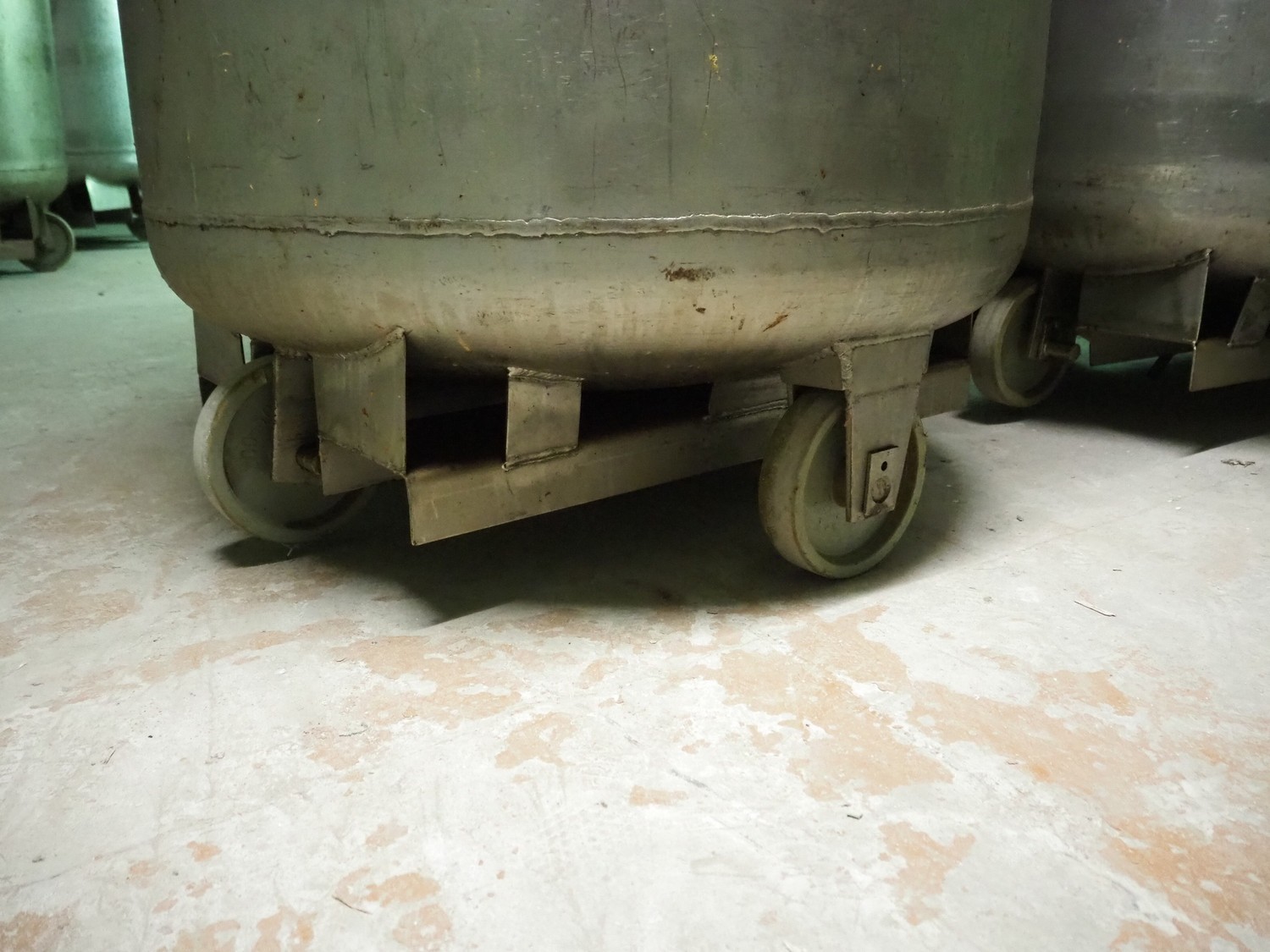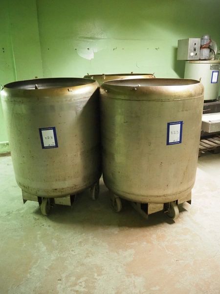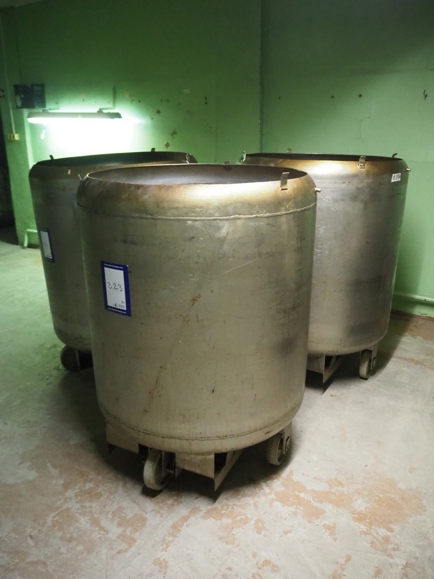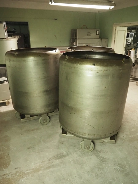 3 s/s mobile tubs for tumbler, inside dimensions: (3x) Ø 1000 mm x 1150 mm, total dimensions: (3x) Ø 1020 mm x 1370 mm. Without lids.