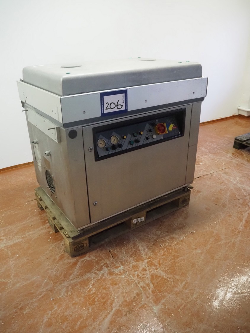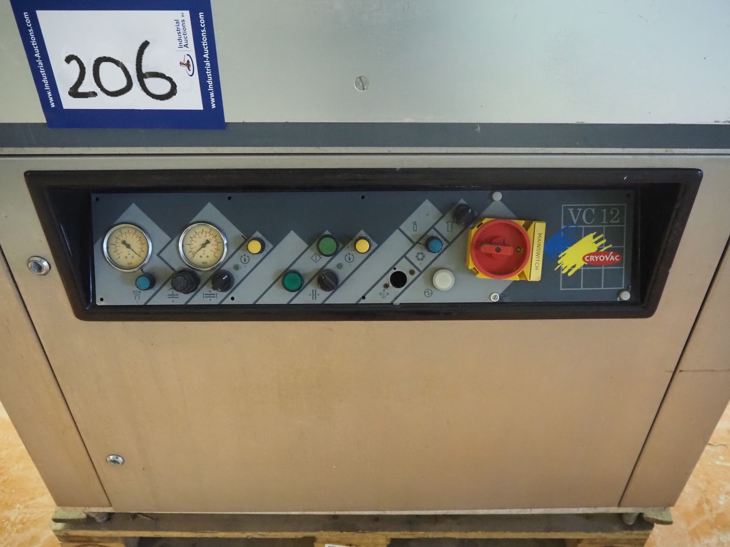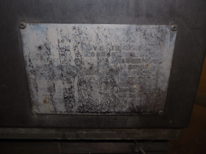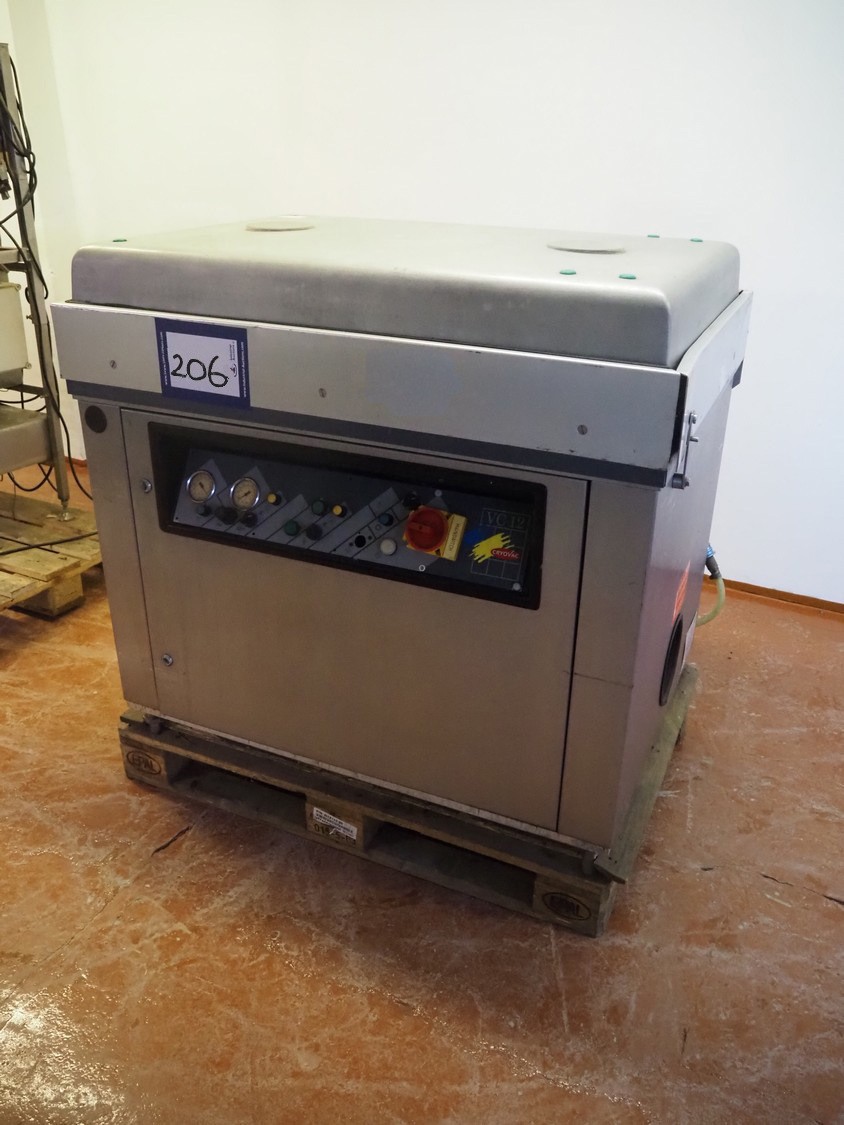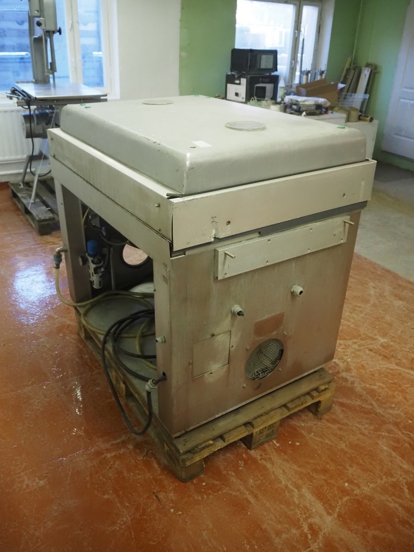 Cryovac vacuum machine, model: VC 12, number: 02040, year of construction: 1990, 380 V, 50 Hz, dimensions chamber: 980 mm x 580 mm x 220 mm, seal length: (2x) 950 mm and (1x) 700 mm, total dimensions: 1200 mm x 850 mm x 1070 mm. Vacuum pump is missing, technical condition unknown.