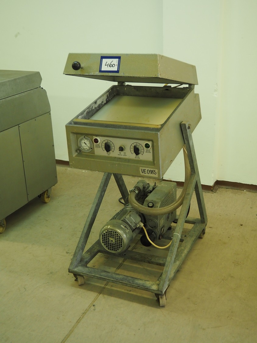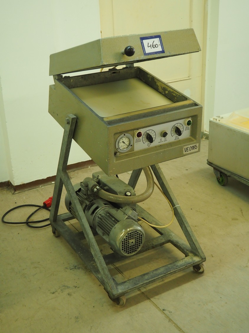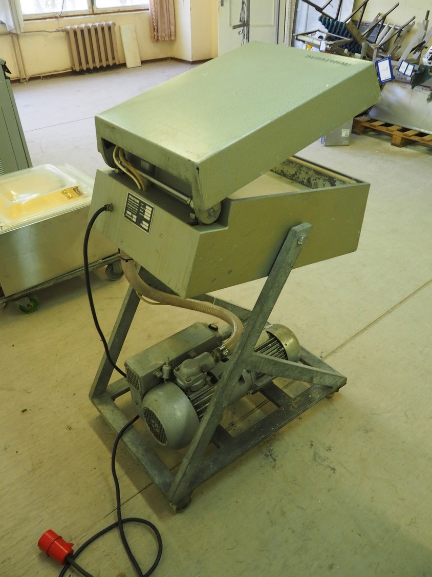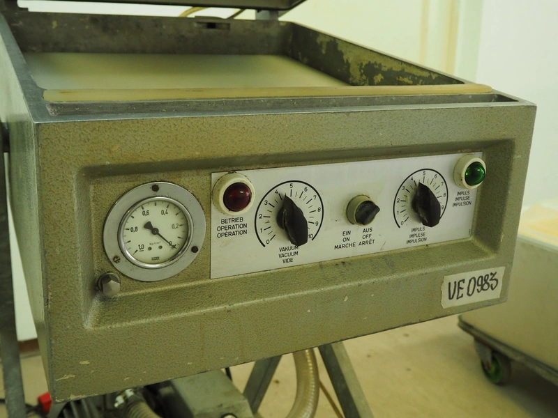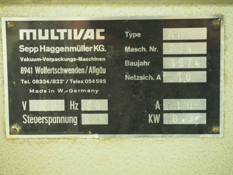 Multivac vacuum machine, type: A69, machine number: 236, year of construction: 1974, 220 V, 50 Hz, 10 A, 0.5 kW, seal length: 450 mm, dimensions chamber: 450 mm x 450 mm, Busch vacuum pump, type: 063-122, capacity: 63 m³ per hour, total dimensions: 700 mm x 570 mm x 1140 mm.