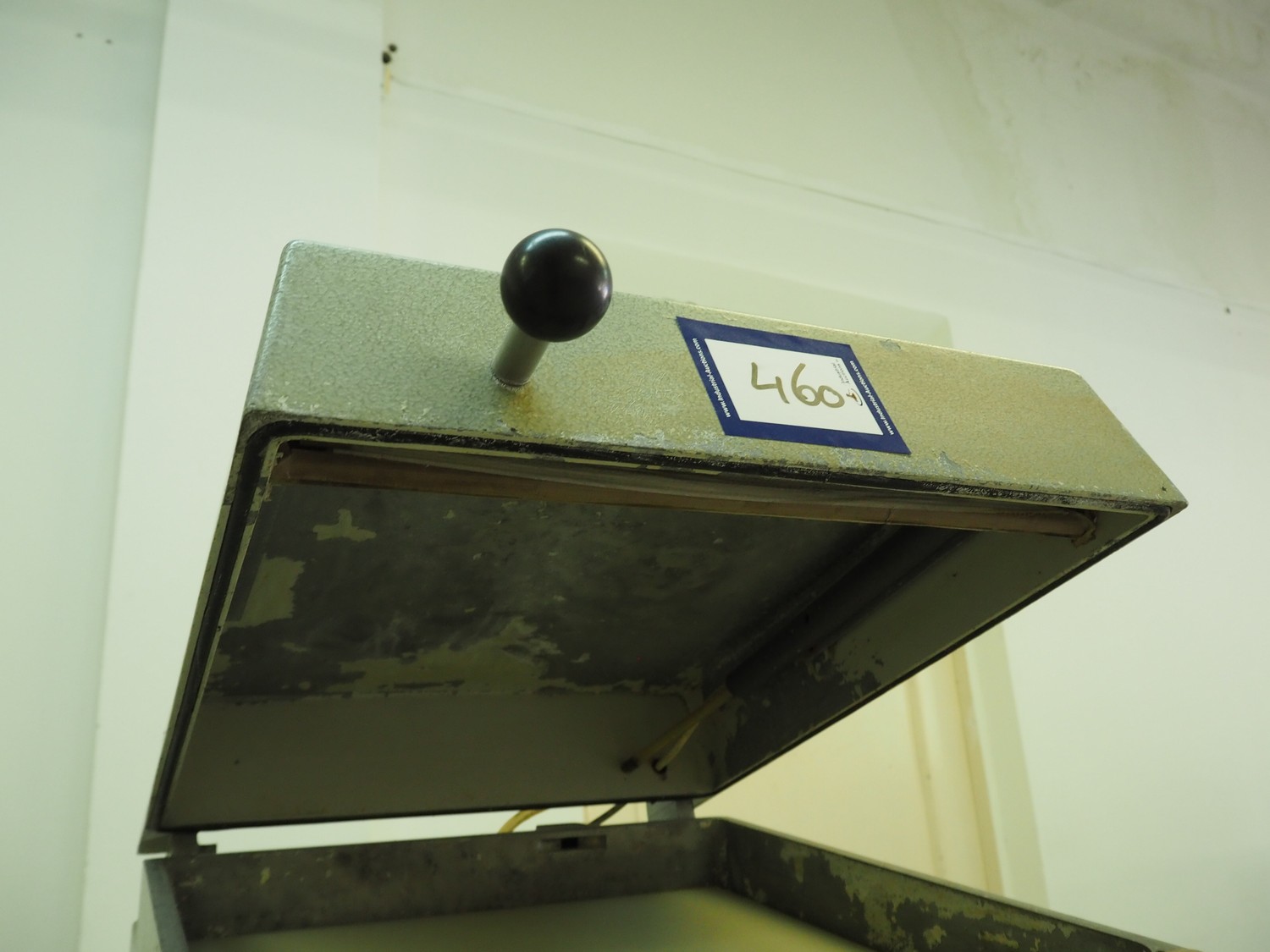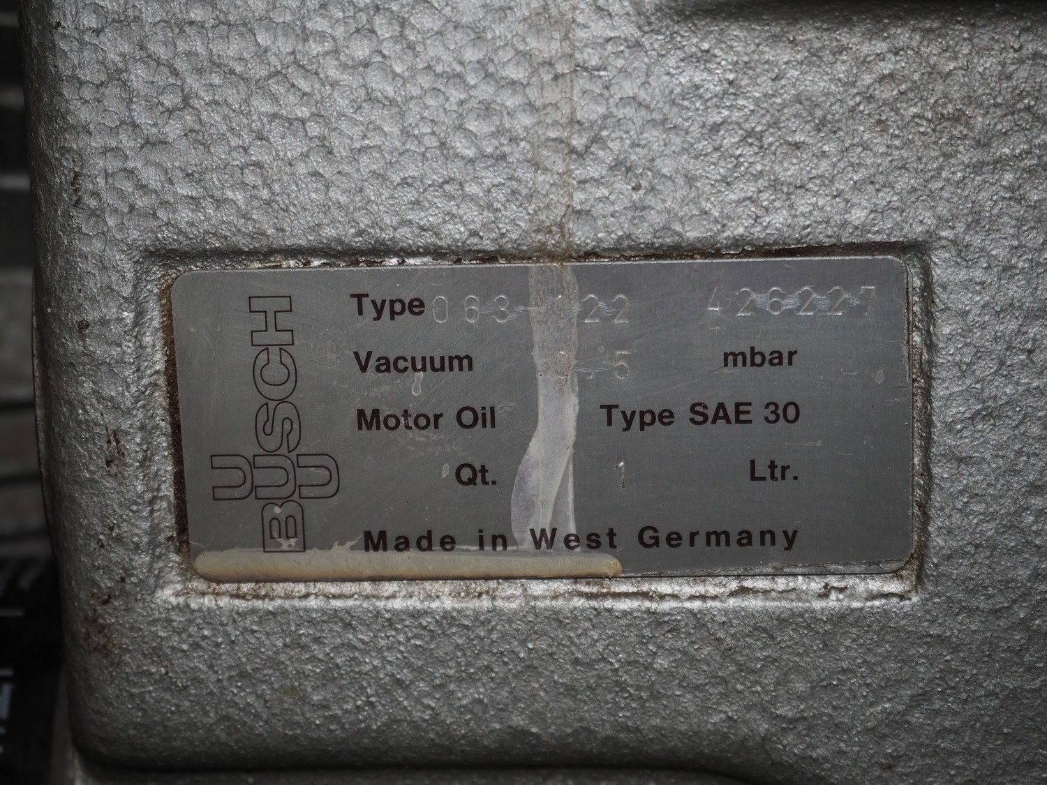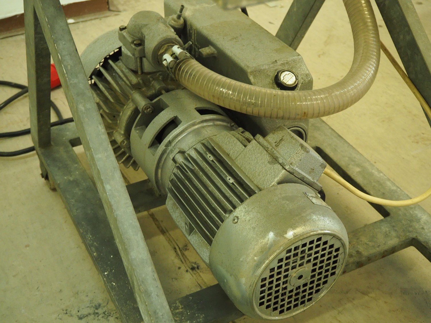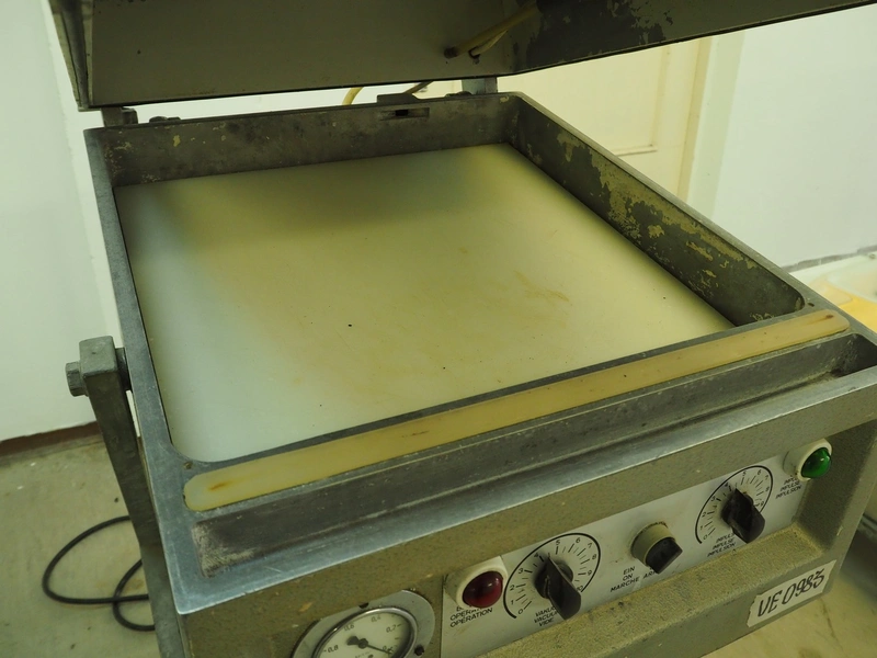 Multivac vacuum machine, type: A69, machine number: 236, year of construction: 1974, 220 V, 50 Hz, 10 A, 0.5 kW, seal length: 450 mm, dimensions chamber: 450 mm x 450 mm, Busch vacuum pump, type: 063-122, capacity: 63 m³ per hour, total dimensions: 700 mm x 570 mm x 1140 mm.