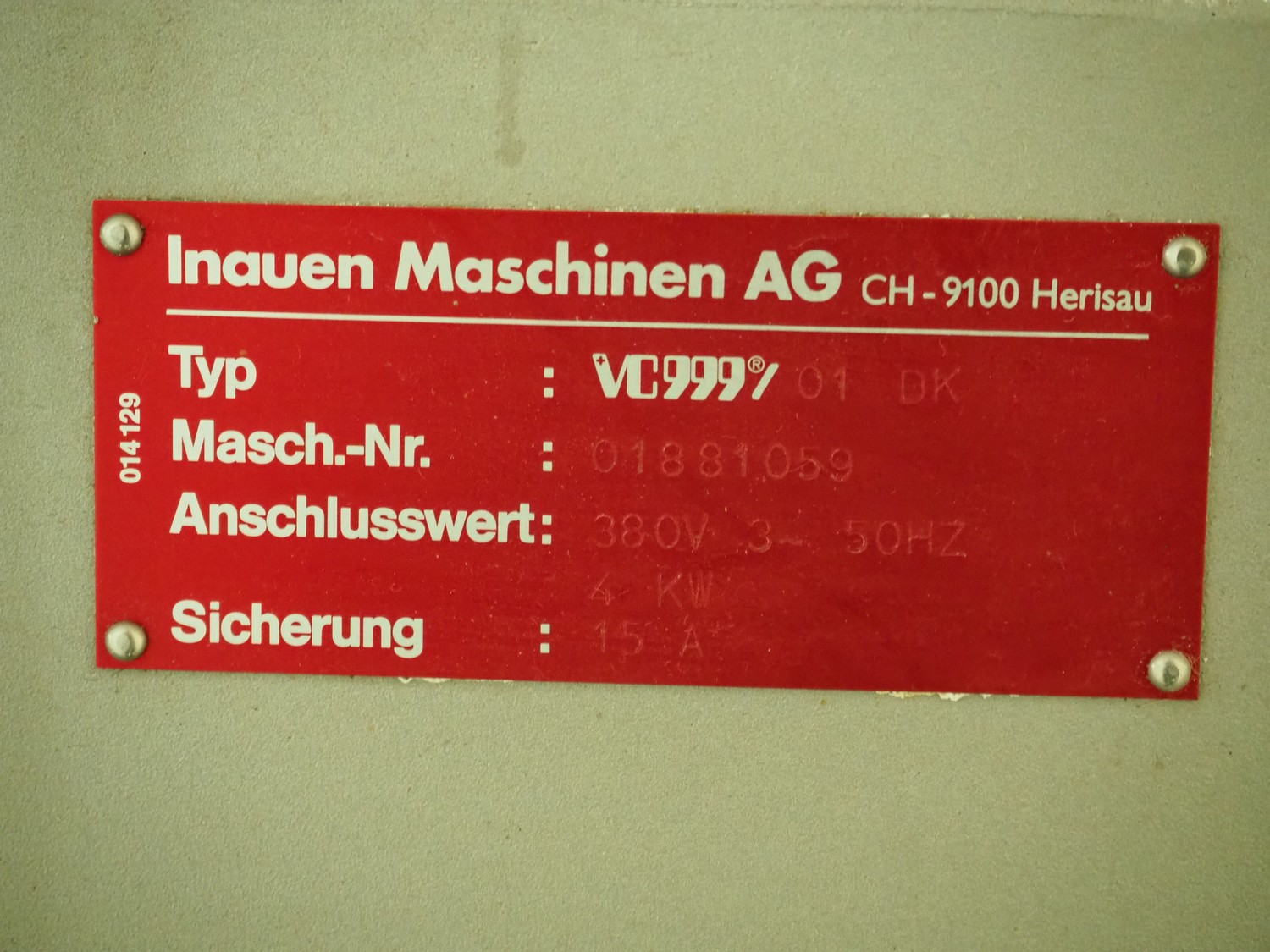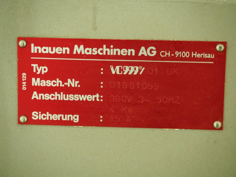 Inauen Maschinen AG mobile vacuum machine, type VC999 01 DK, machine number: 01881059, 380 V, 3 Ph, 50 Hz, 4 kW, with vacuum pump, total dimensions 820 mm x 700 mm x 1040 mm