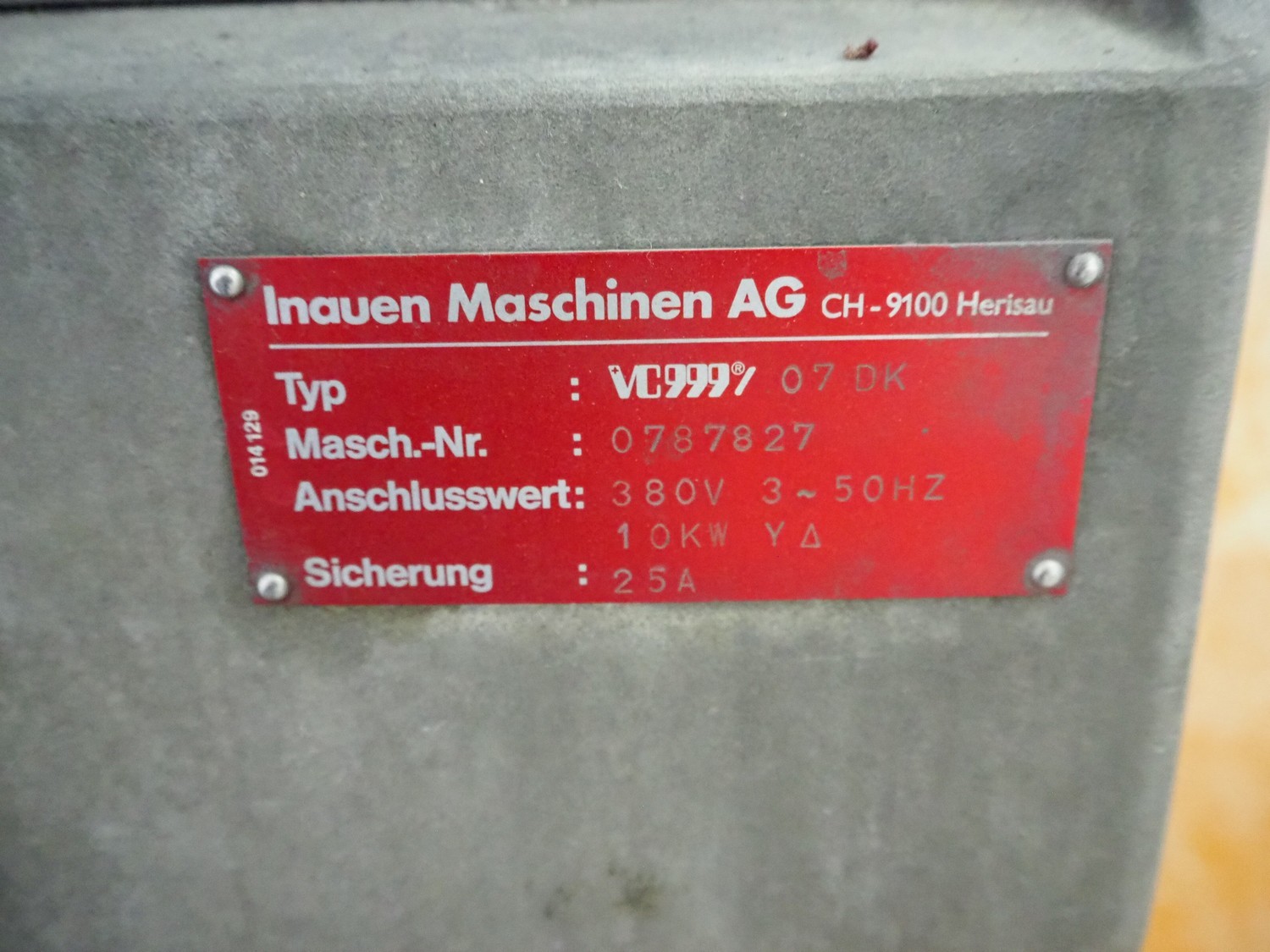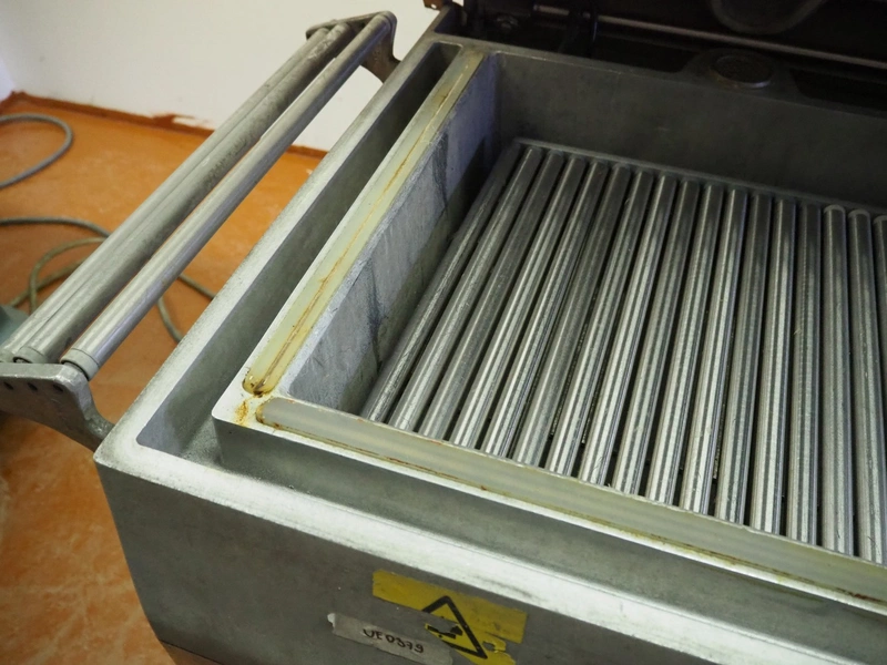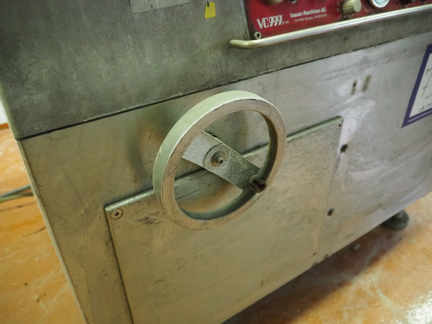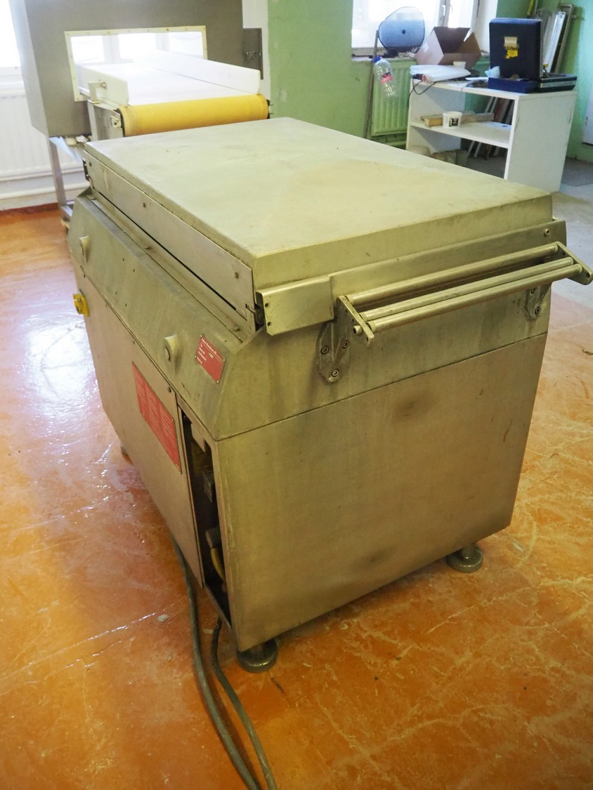 Inauen Maschinen AG vacuum machine, type: VC999/07 DK, machine number: 0787827, 380 V, 3 Ph, 50 Hz, 25 A, 10 kW, Rietschle vacuum pump, seal length: (2x) 440 mm and (1x) 950 mm, dimensions chamber: 1050 mm x 500 mm, s/s rollers, roller width: 470 mm, total dimensions: 1300 mm x 920 mm x 1070 mm.