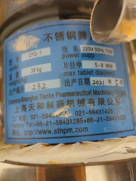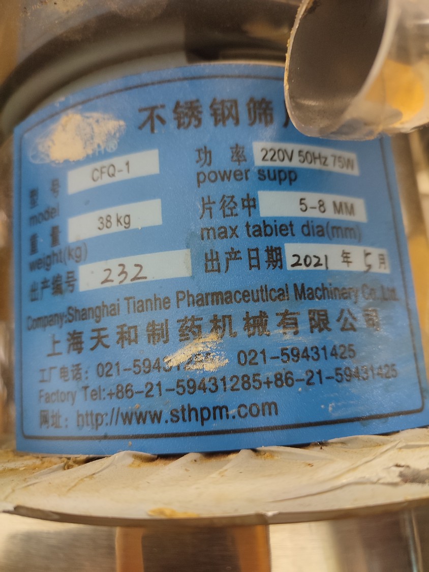 Shanghai Tianhe Pharmaceutical Machinery Co. Ltd tablet vibro sifter machine, model: CFQ-1, serial number: 232, year of construction: 5.2021, 220 V, 50 Hz, 75 W, weight: 38 kg, dimensions: 340 mm x 310 mm x 1050 mm.
