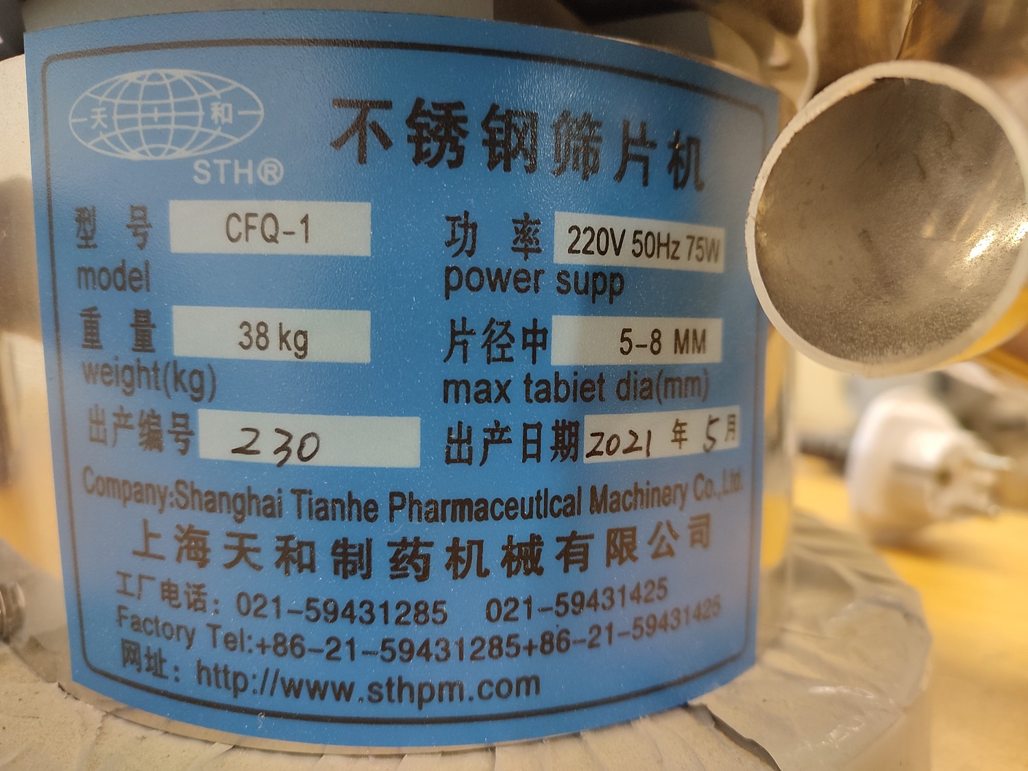 Shanghai Tianhe Pharmaceutical Machinery Co. Ltd tablet vibro sifter machine, model: CFQ-1, serial number: 230, year of construction: 5.2021, 220 V, 50 Hz, 75 W, weight: 38 kg, dimensions: 340 mm x 310 mm x 1000 mm.