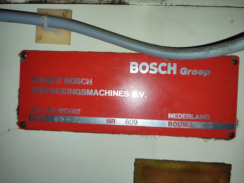 Bosch Groep vertical bag form-, fill-, and sealing machine, type: 175 H 320, number: 609, year of construction: 1979, dimensions: (1x) 1600 mm x 1400 mm x 2400 mm, (1x): 800 mm x 1200 mm x 1000 mm, (1x): 1000 mm x 1200 mm x 1000 mm, (1x): 1000 mm x 1500 mm x 1160 mm, (1x): 1000 mm x 1400 mm x 270 mm. Incomplete.