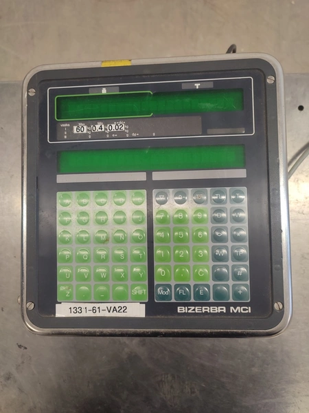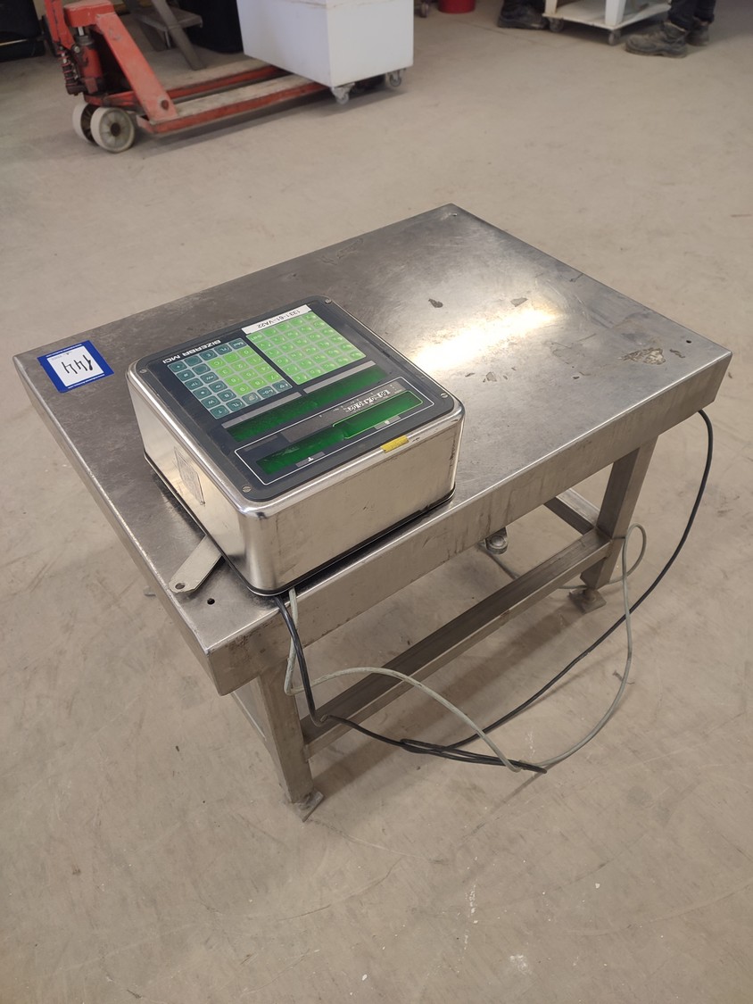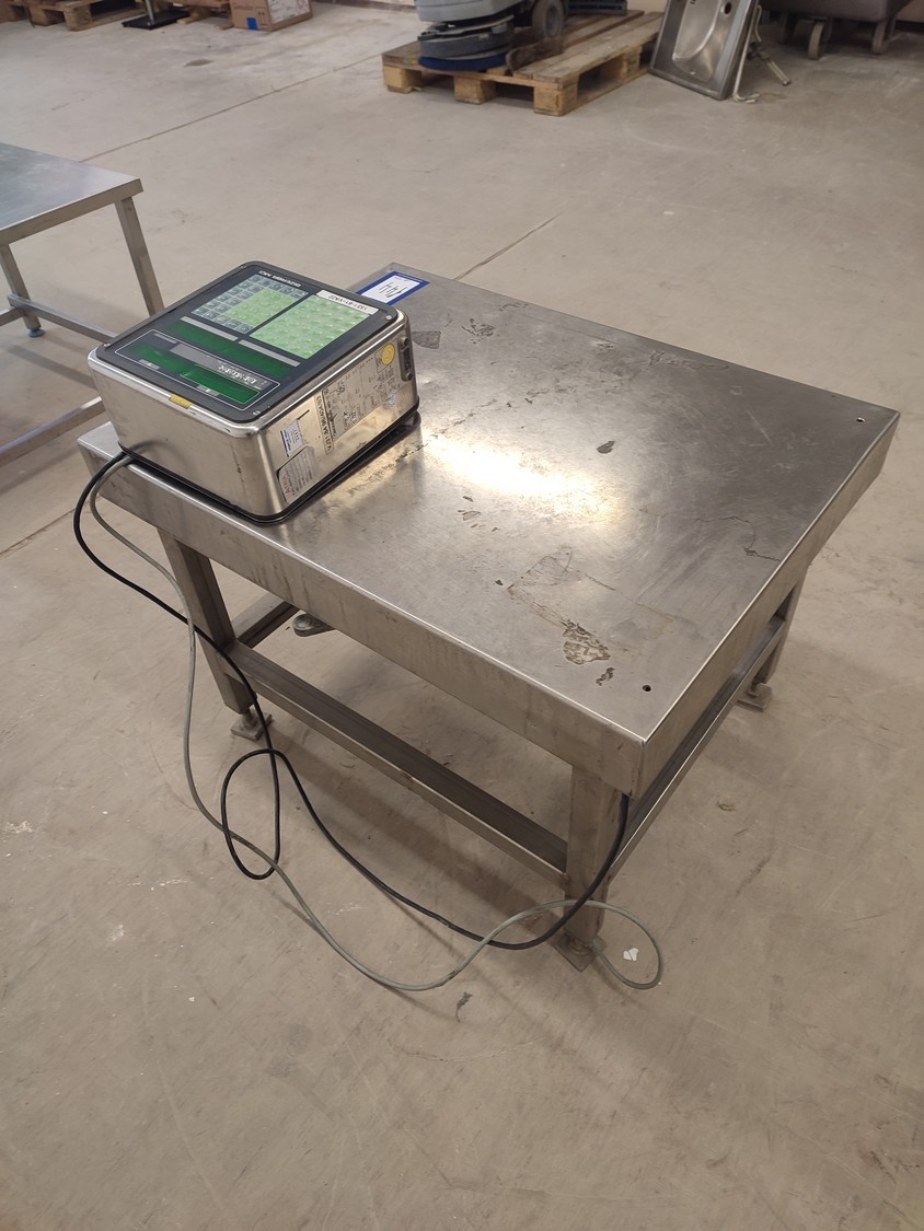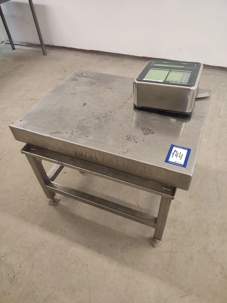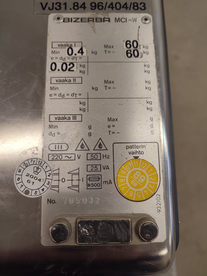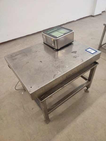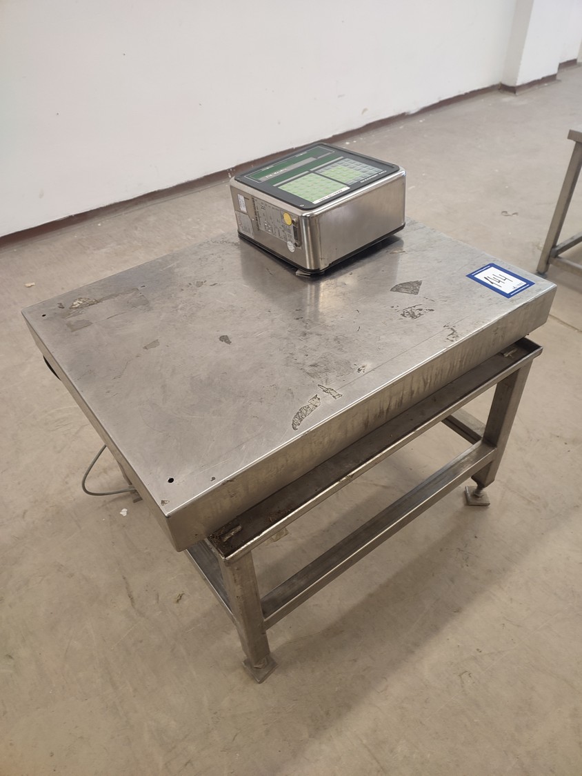 Bizerba weighing scale, type: MCI-W, number: 705032, 220 V, 50 Hz, maximum weight: 60 kg, minimum weight: 0.4 kg, e= 0.02 kg, T=- 60 kg, dimensions scale: 800 mm x 600 mm, total dimensions: 800 mm x 640 mm x 750 mm.