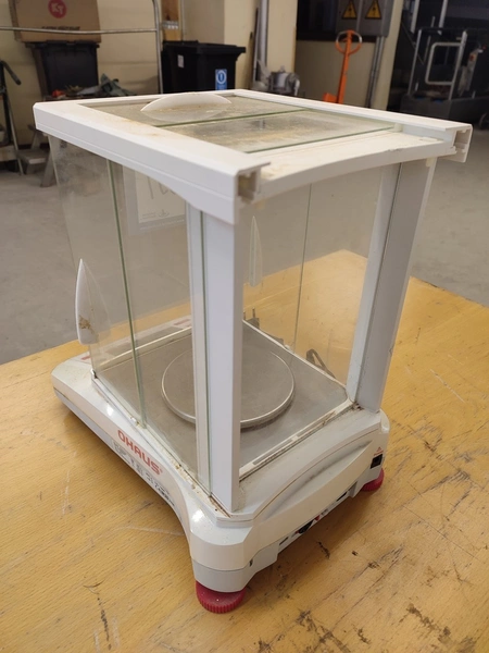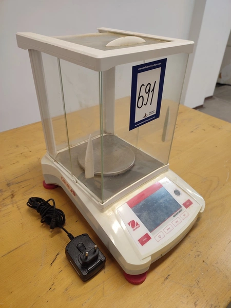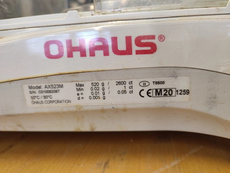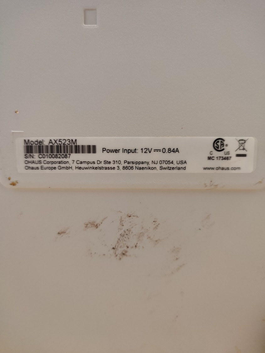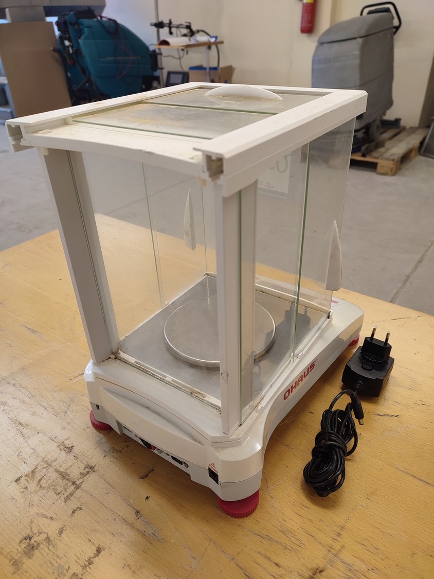 Ohaus Corporation weighing scale, model: AX523M, serial number: C010082087, 12 V, 0.84 A, maximum weight: 520 g, minimum weight: 0.02 g, e= 0.01 g, d= 0.001 g, dimensions: 240 mm x 350 mm x 350 mm.