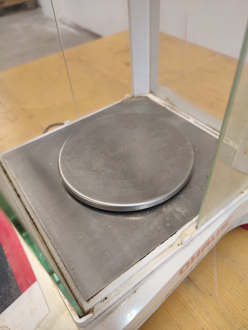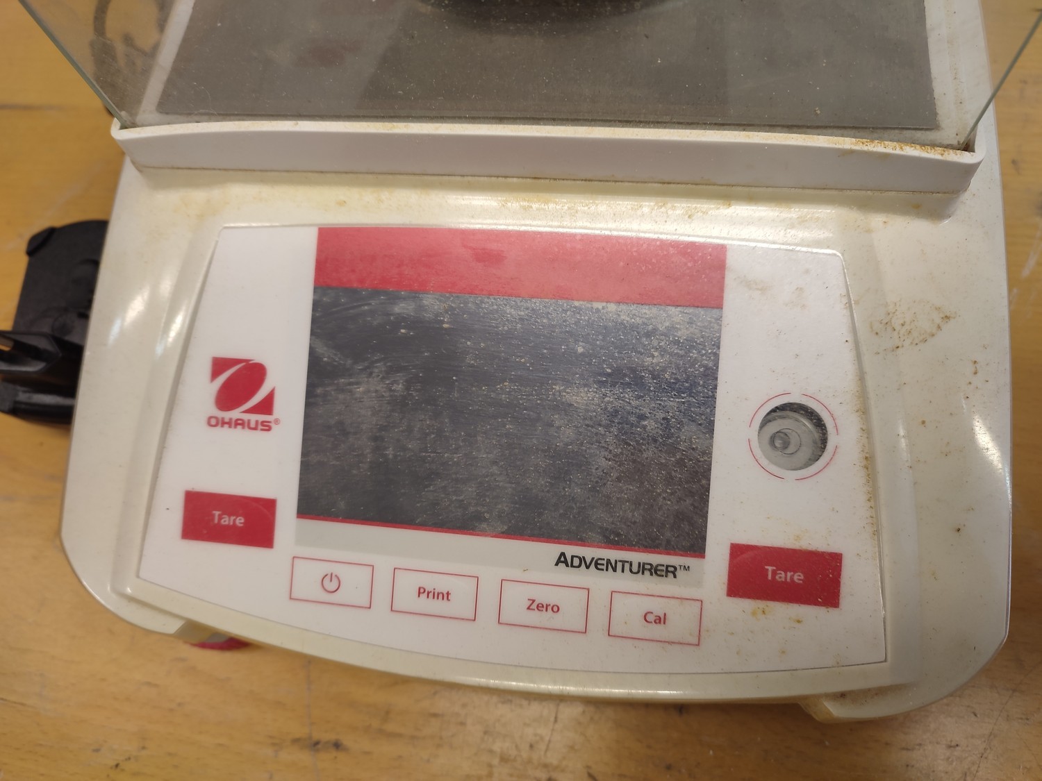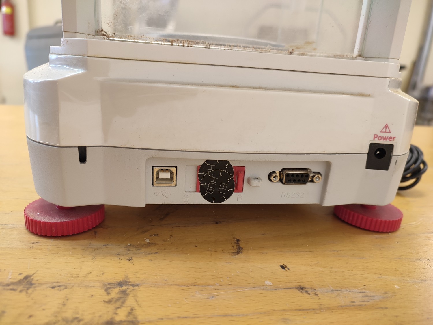 Ohaus Corporation weighing scale, model: AX523M, serial number: C010082087, 12 V, 0.84 A, maximum weight: 520 g, minimum weight: 0.02 g, e= 0.01 g, d= 0.001 g, dimensions: 240 mm x 350 mm x 350 mm.