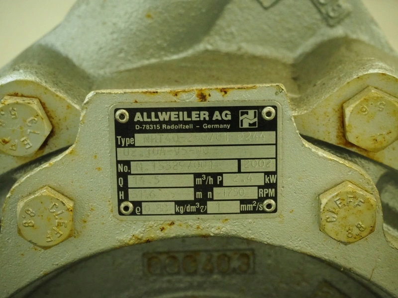 Allweiler AG centrifugal pump, type: NHT40-250/01, number: M.13329/001, year of construction: 2002, 2.4 kW, capacity: 14.5 m³ per hour, dimensions: 570 mm x 340 mm x 400 mm.