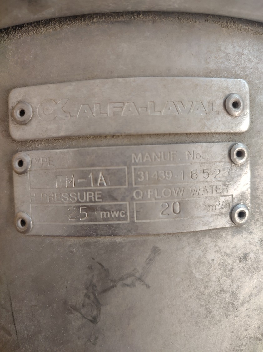 Alfa-Laval circulation pump, type: FM-1A, number: 31439-16527, capacity: 20 m³h, dimensions 520 mm x 470 mm x 290 mm.