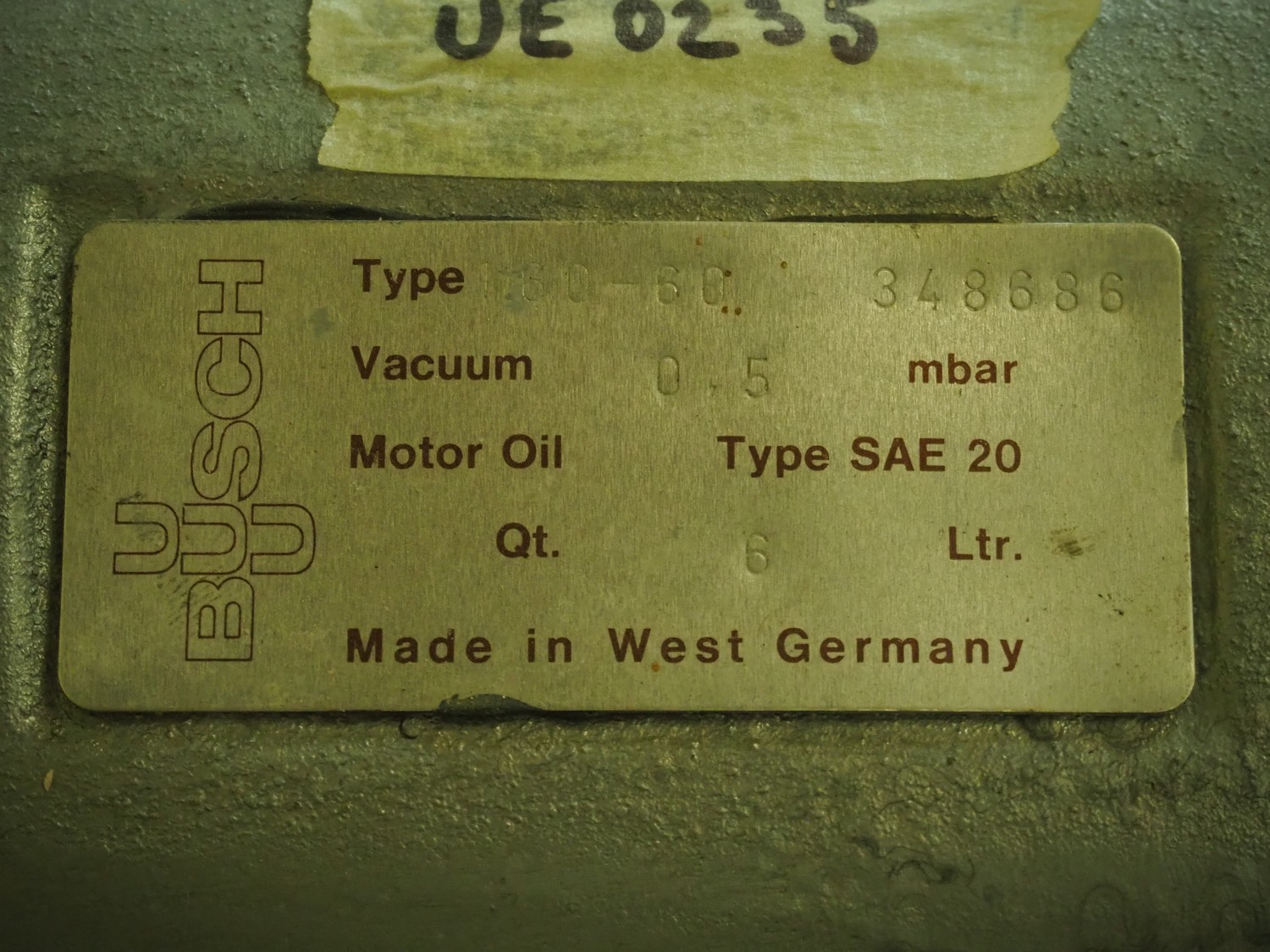 Busch vacuum pump, type: 160-60 348686, capacity: 160 m³ per hour, dimensions: 900 mm x 620 mm x 450 mm.