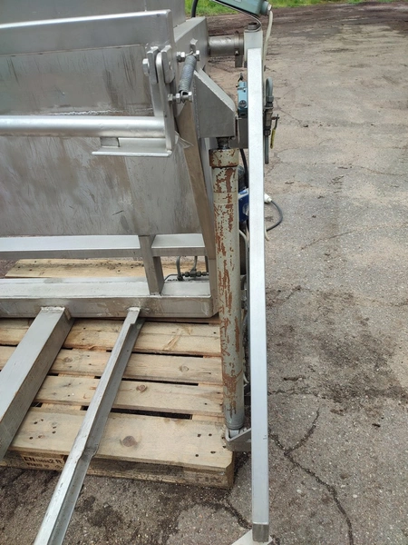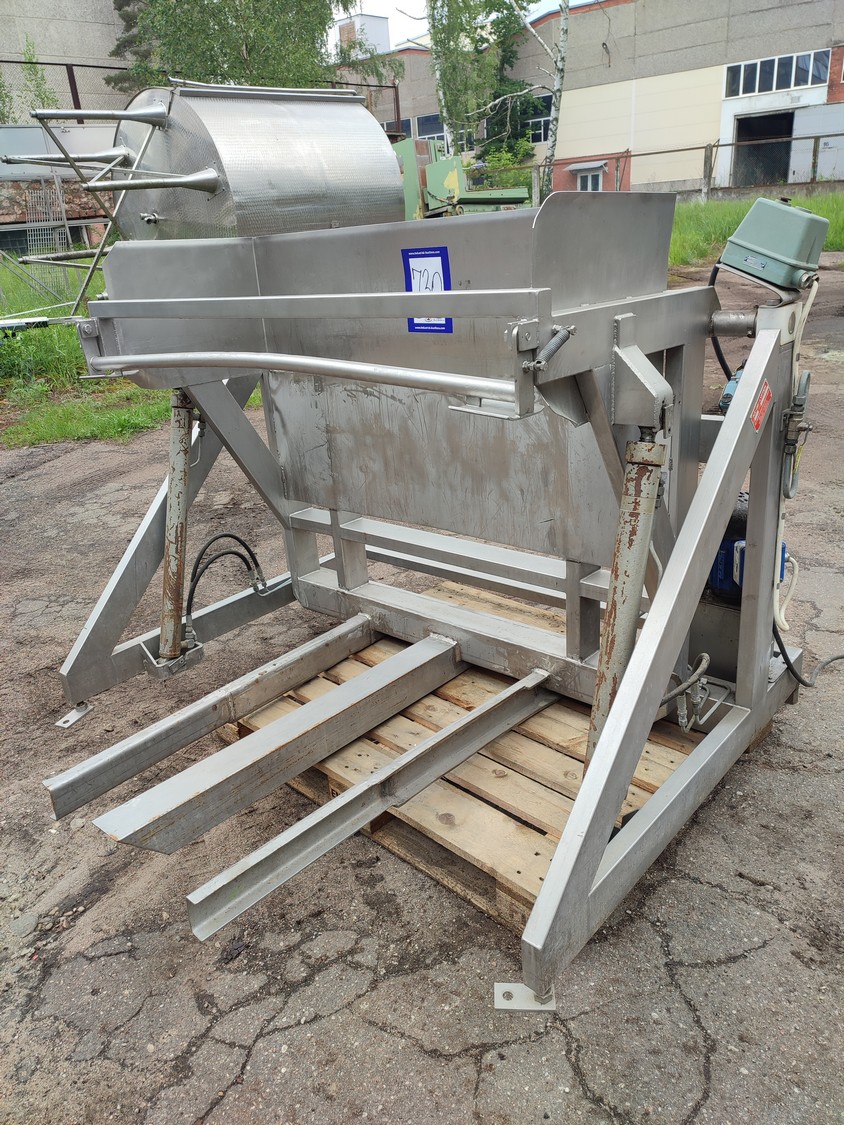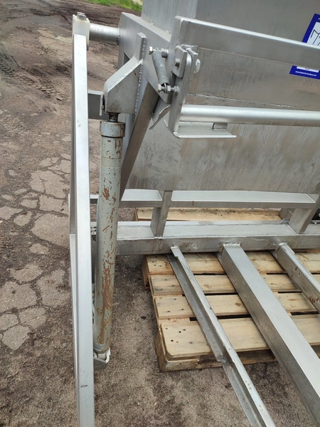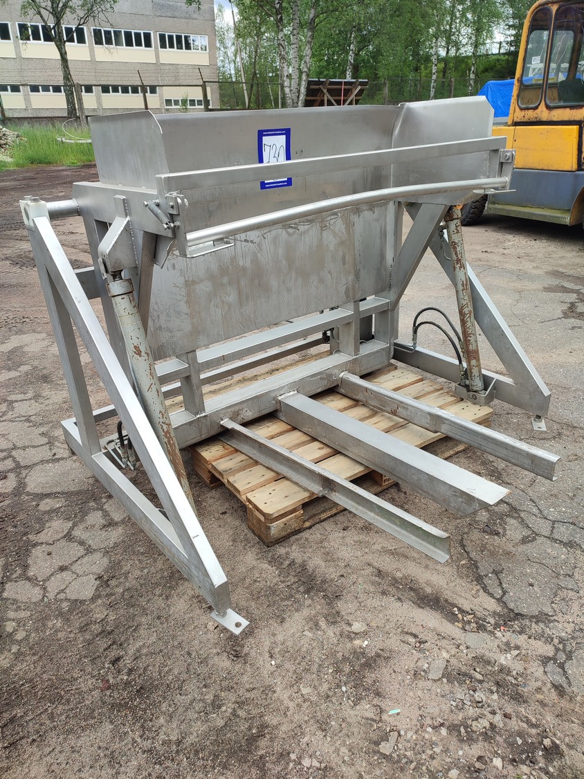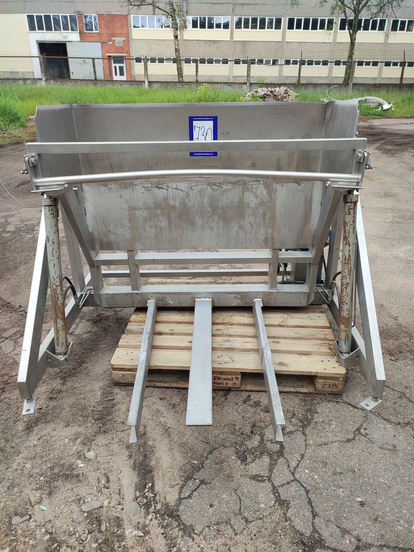 Ka-Ge-Lyften s/s tilting device for meat bins, type: CV 800 HA 100, number: 4257, total dimensions: 1700 mm x 1505 mm x 1350 mm.