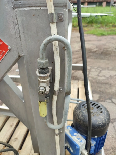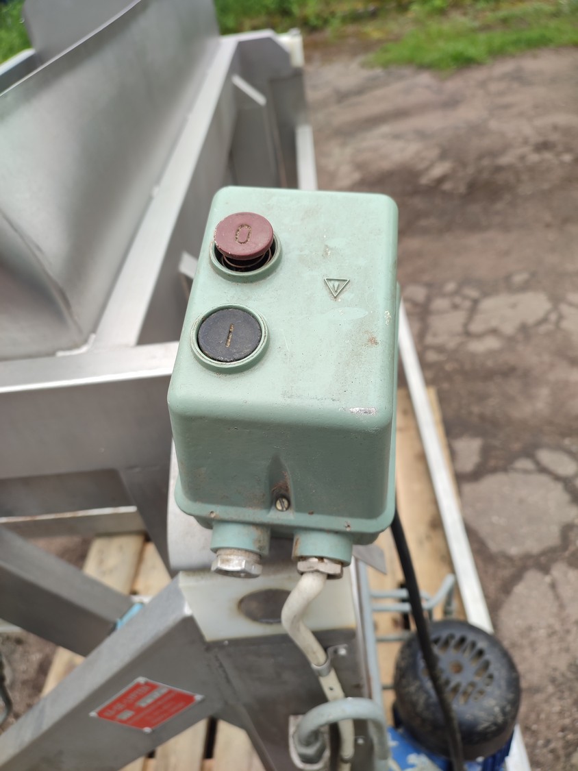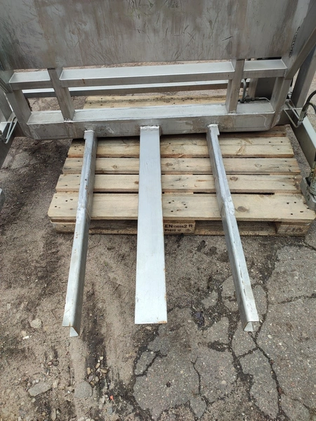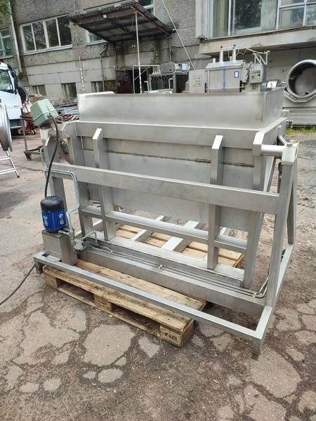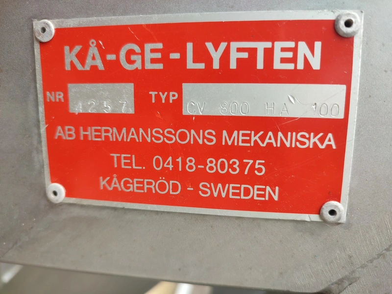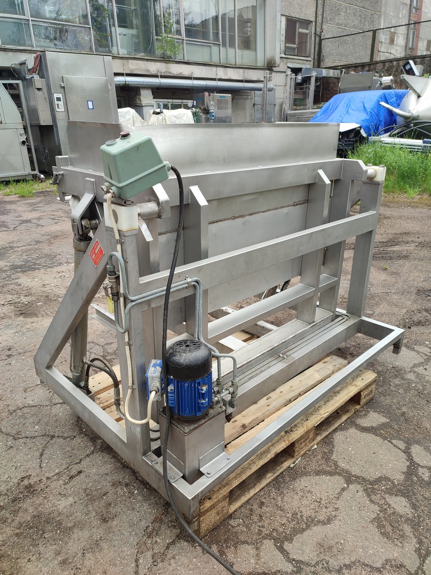 Ka-Ge-Lyften s/s tilting device for meat bins, type: CV 800 HA 100, number: 4257, total dimensions: 1700 mm x 1505 mm x 1350 mm.