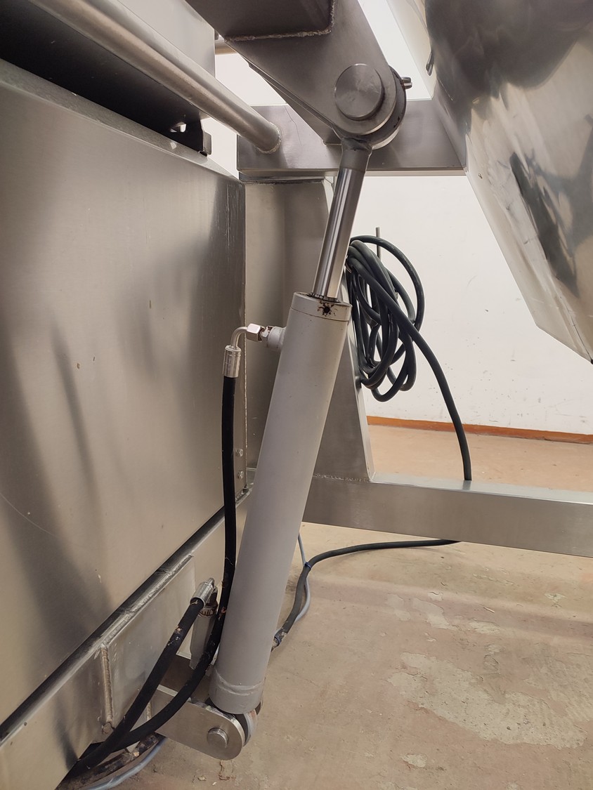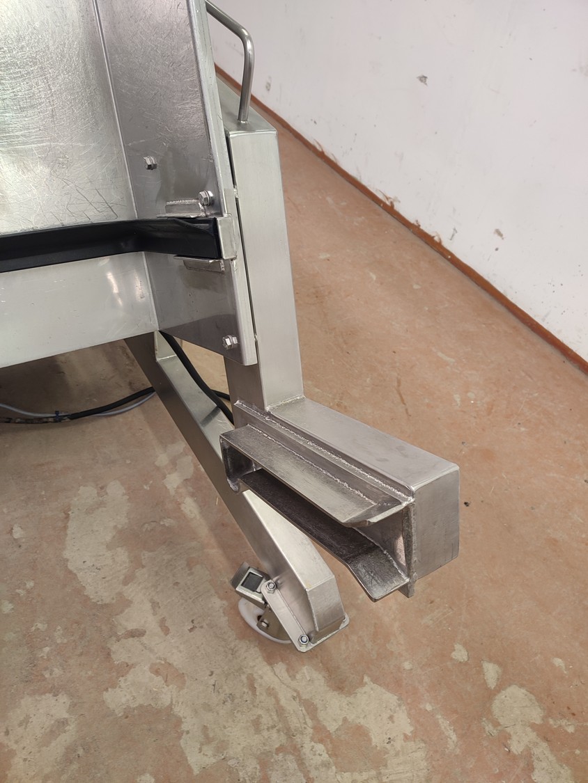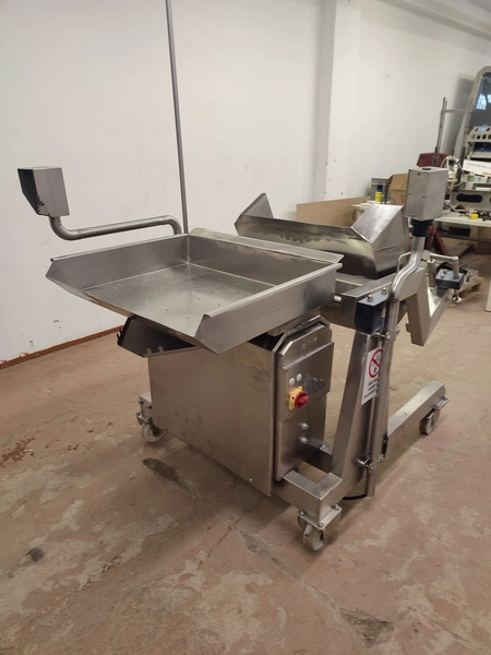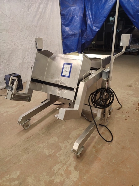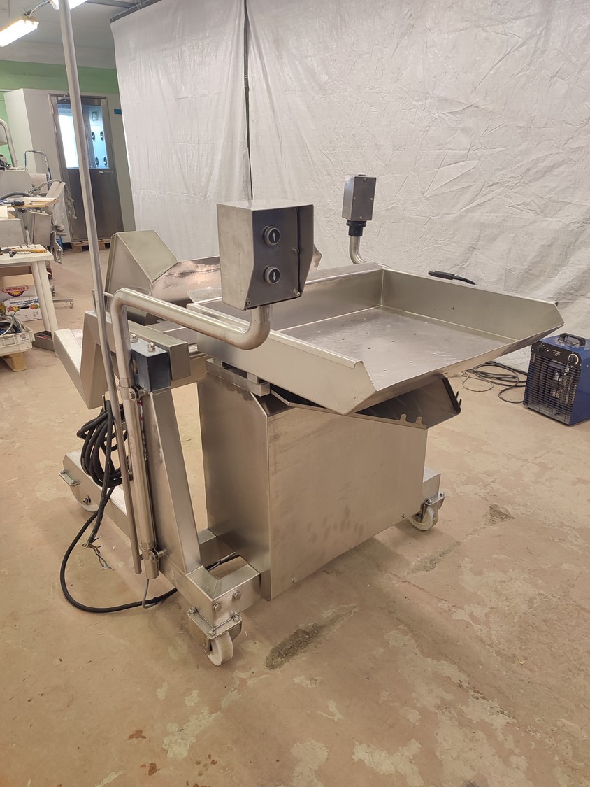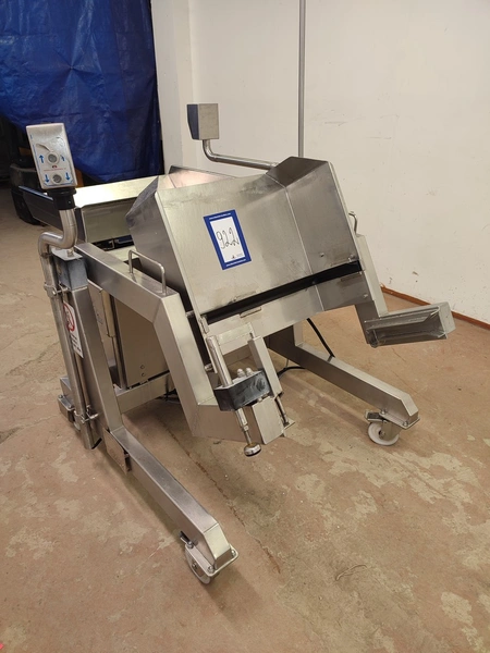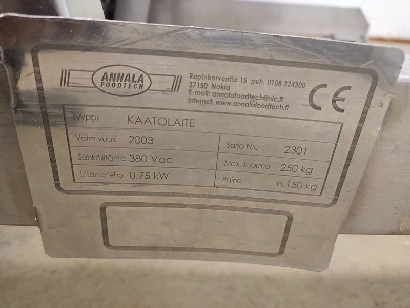 Annala Foodtech mobile tilting device for 200 liter meat bins, type: KAATOLAITE, serial number: 2301, year of construction: 2003, 380 V, 0.75 kW, capacity: 250 kg, weight: 150 kg, dimensions: 1650 mm x 1170 mm x 1900 mm.