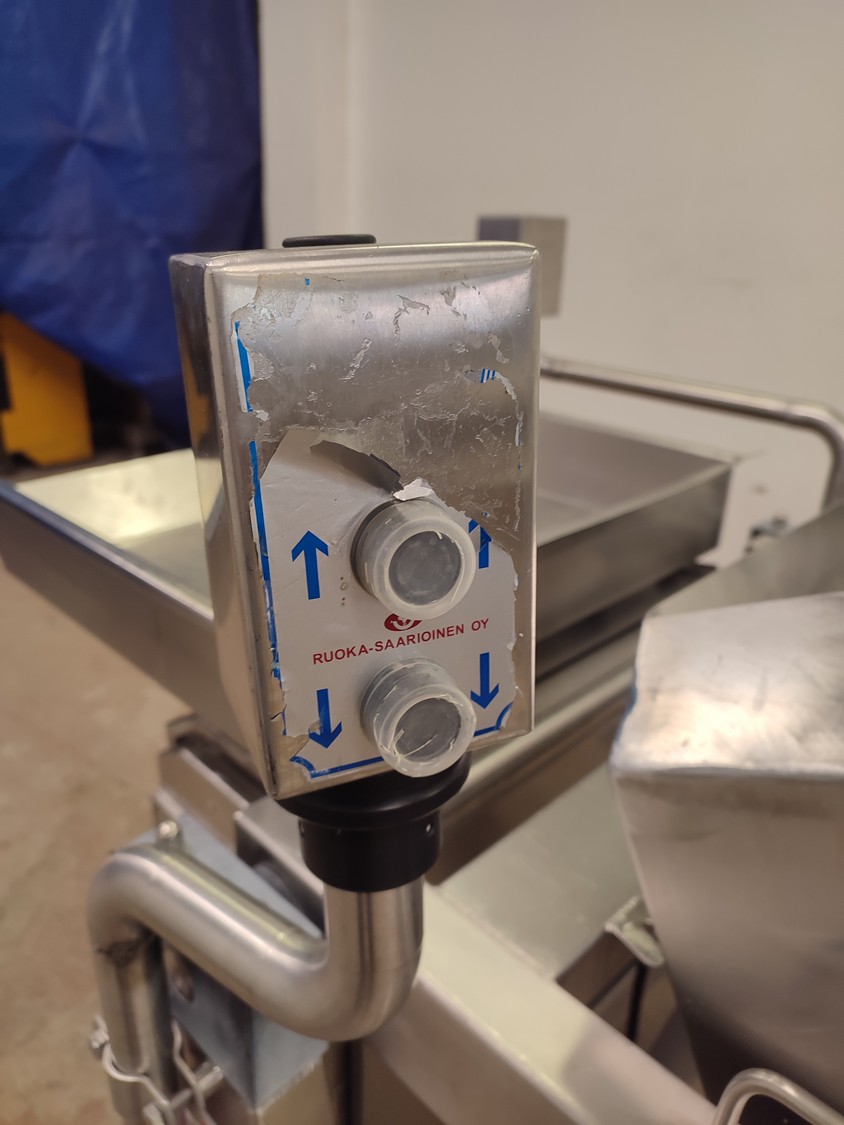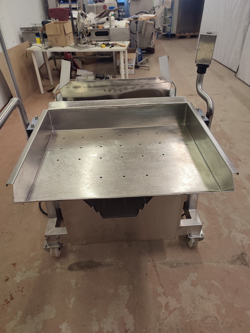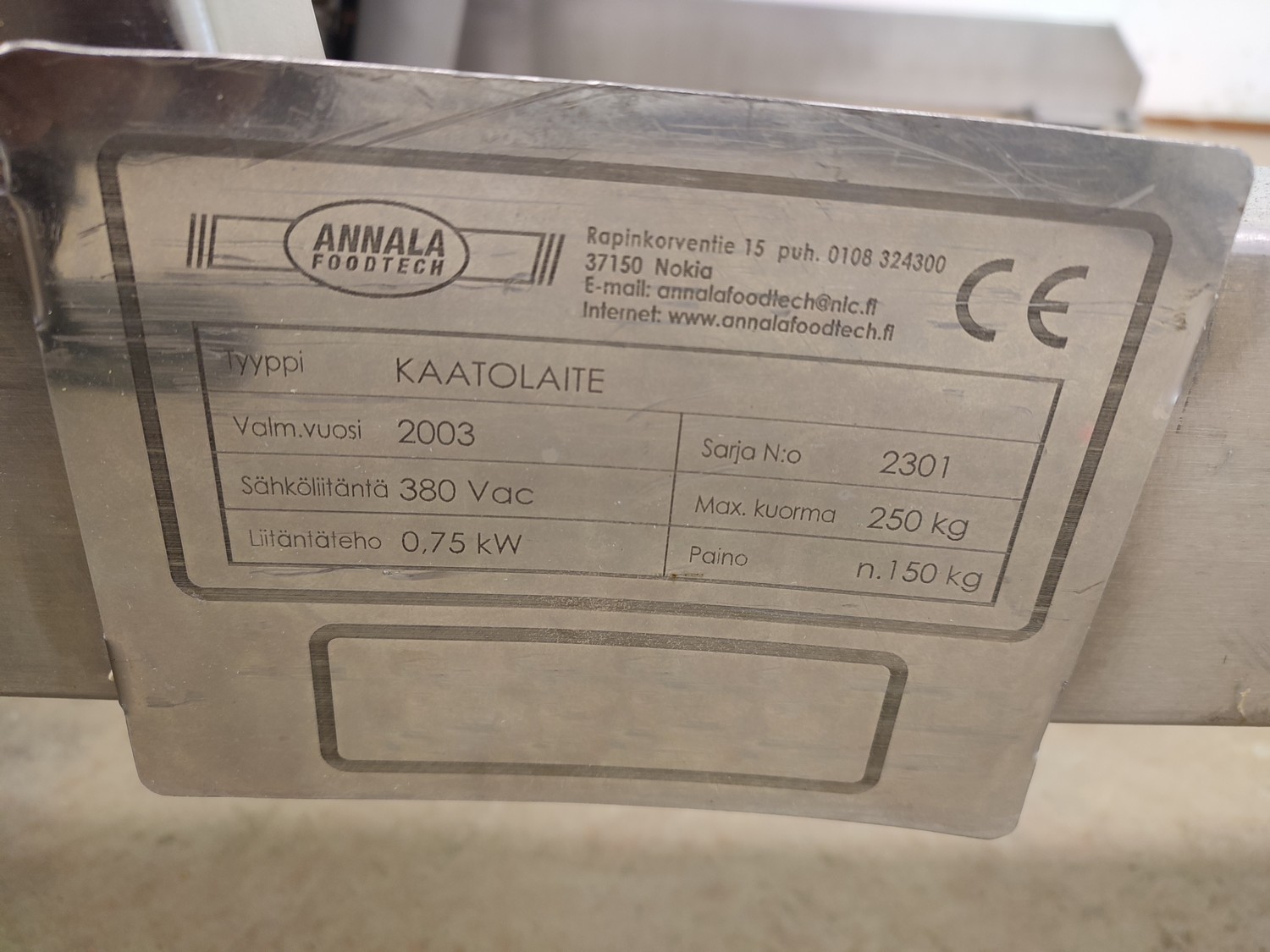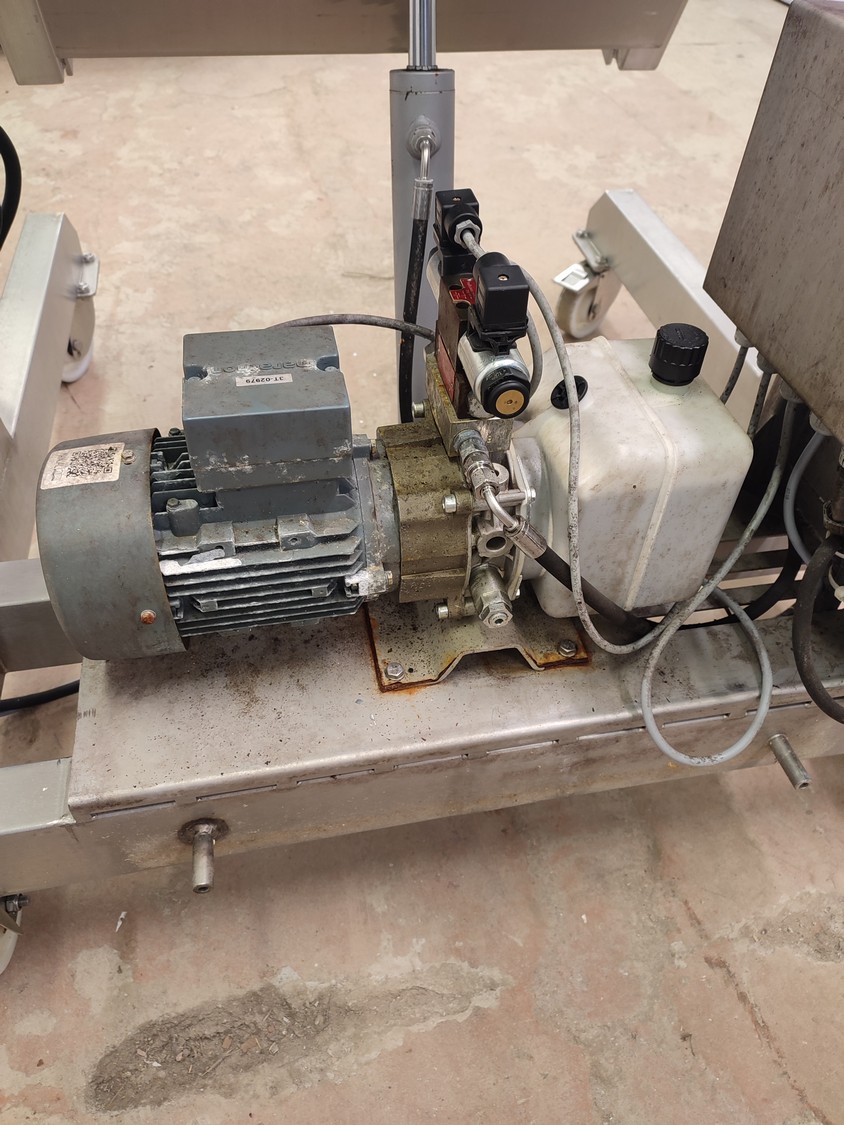 Annala Foodtech mobile tilting device for 200 liter meat bins, type: KAATOLAITE, serial number: 2301, year of construction: 2003, 380 V, 0.75 kW, capacity: 250 kg, weight: 150 kg, dimensions: 1650 mm x 1170 mm x 1900 mm.