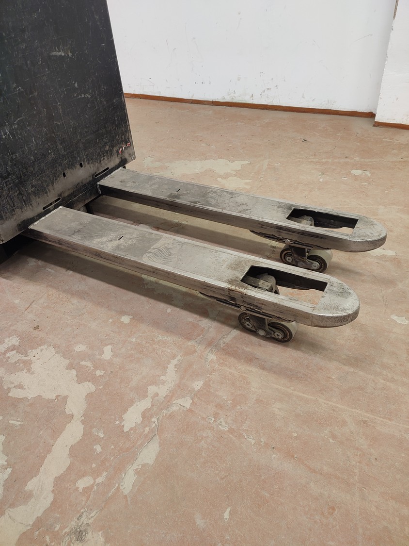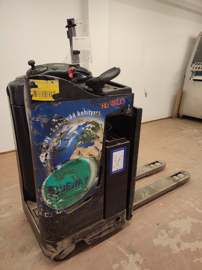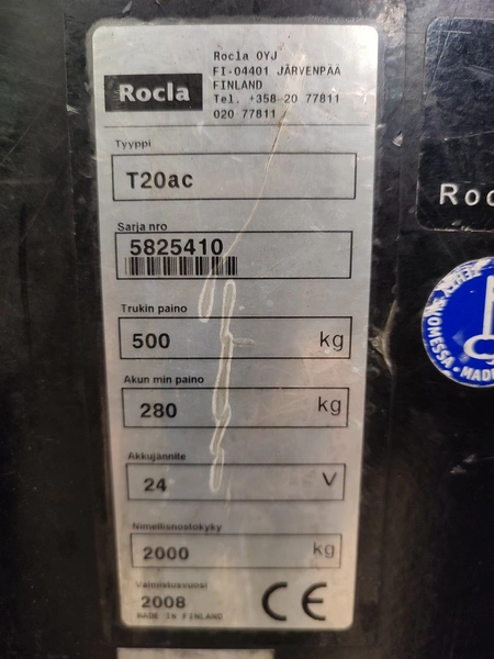 Rocla OYJ electric pallet lifter, type: T20ac, serial number: 5825410, year of construction: 2008, 24 V, capacity: 2000 kg, weight withour battery: 500 kg, weight battery: 322 kg, fork length: 1150 mm, total dimensions: 1900 mm x 800 mm x 1700 mm. Including Varta electronic battery charger.