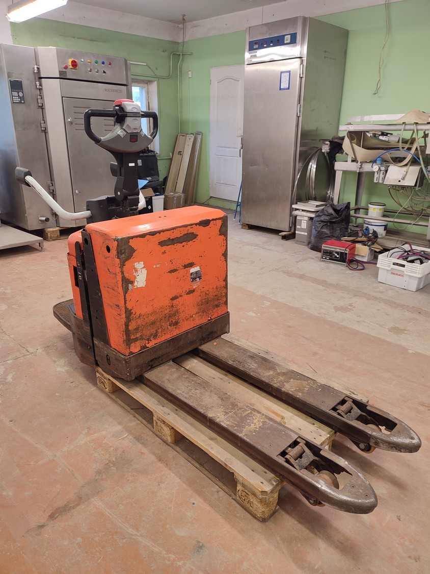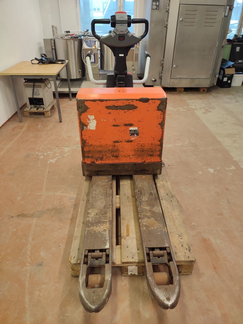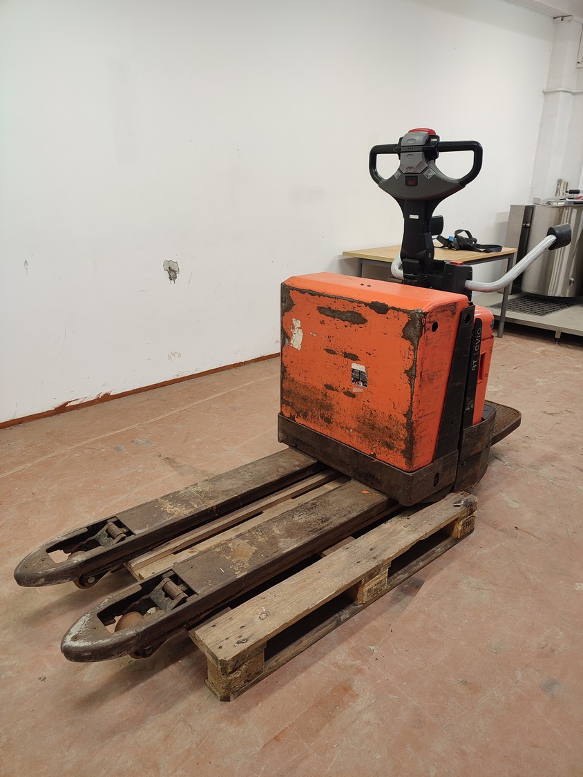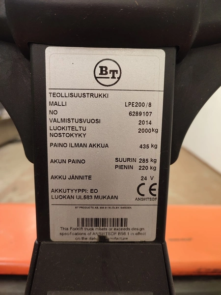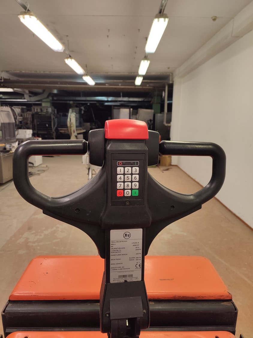 BT Products Ab electric pallet lifter, model: LPE200/8, number: 6289107, year of construction: 2014, capacity: 2000 kg, fork length: 1145 mm, total dimensions: 1930 mm x 730 mm x 1350 mm. Technical condition unknown.