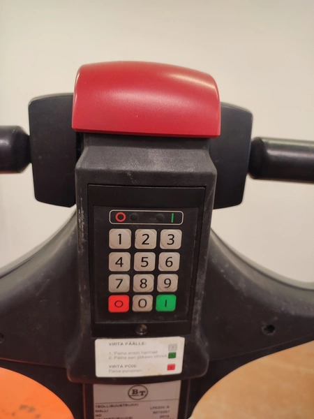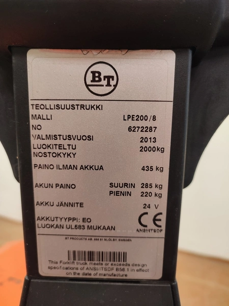BT Products Ab electric pallet lifter, model: LPE200/8, number: 6272287, year of construction: 2013, capacity: 2000 kg, fork length: 1145 mm, total dimensions: 1930 mm x 730 mm x 1350 mm. Technical condition unknown.