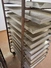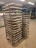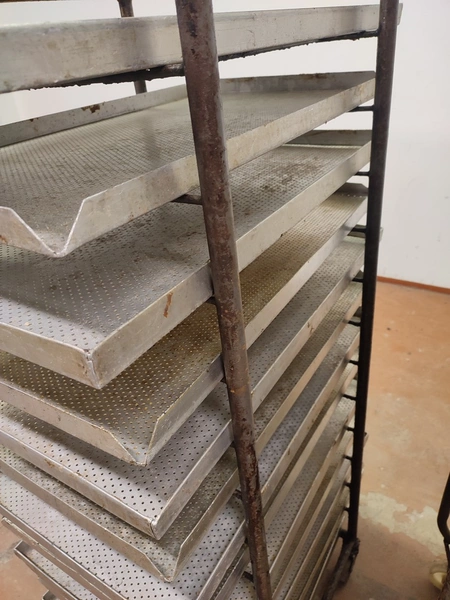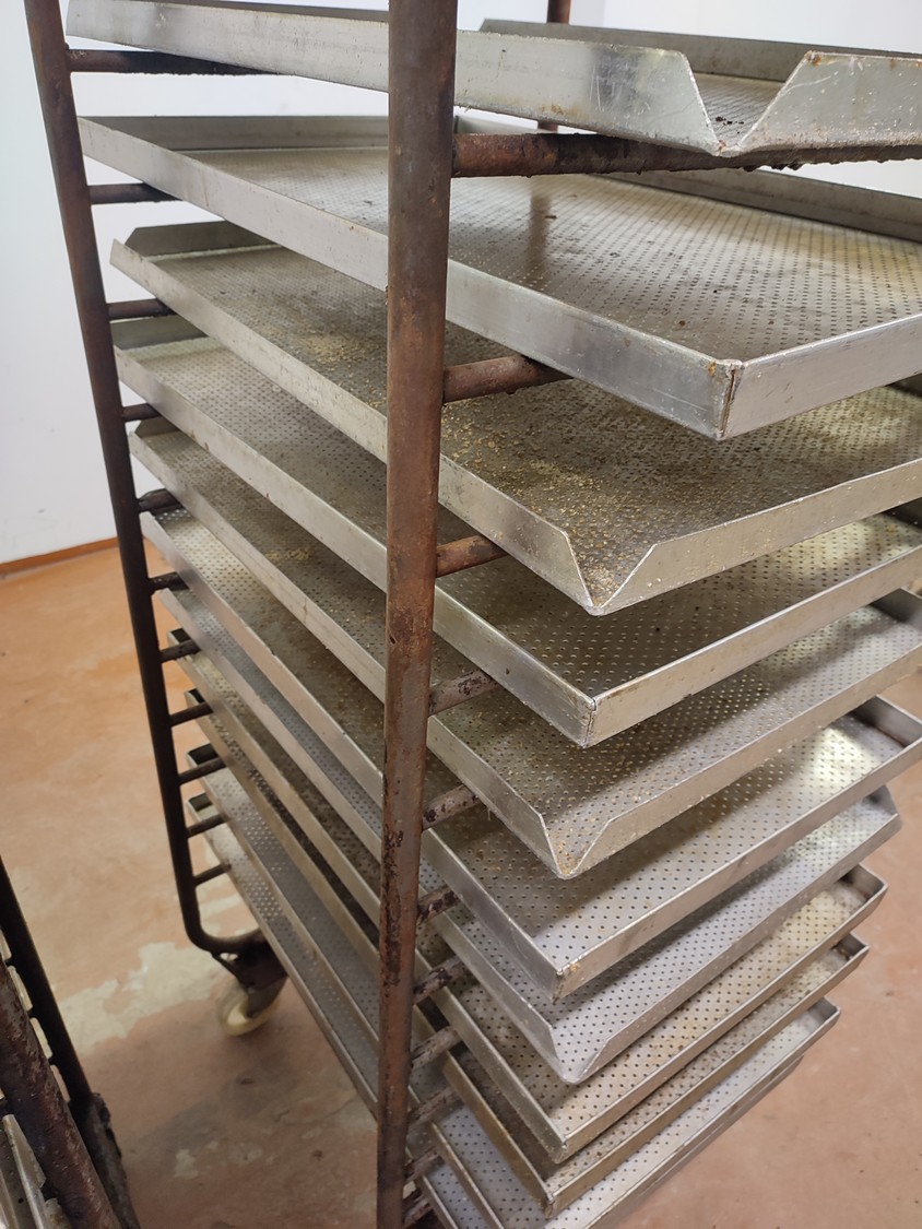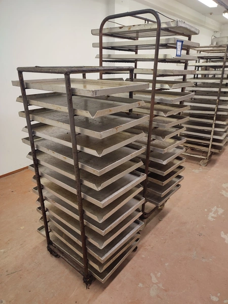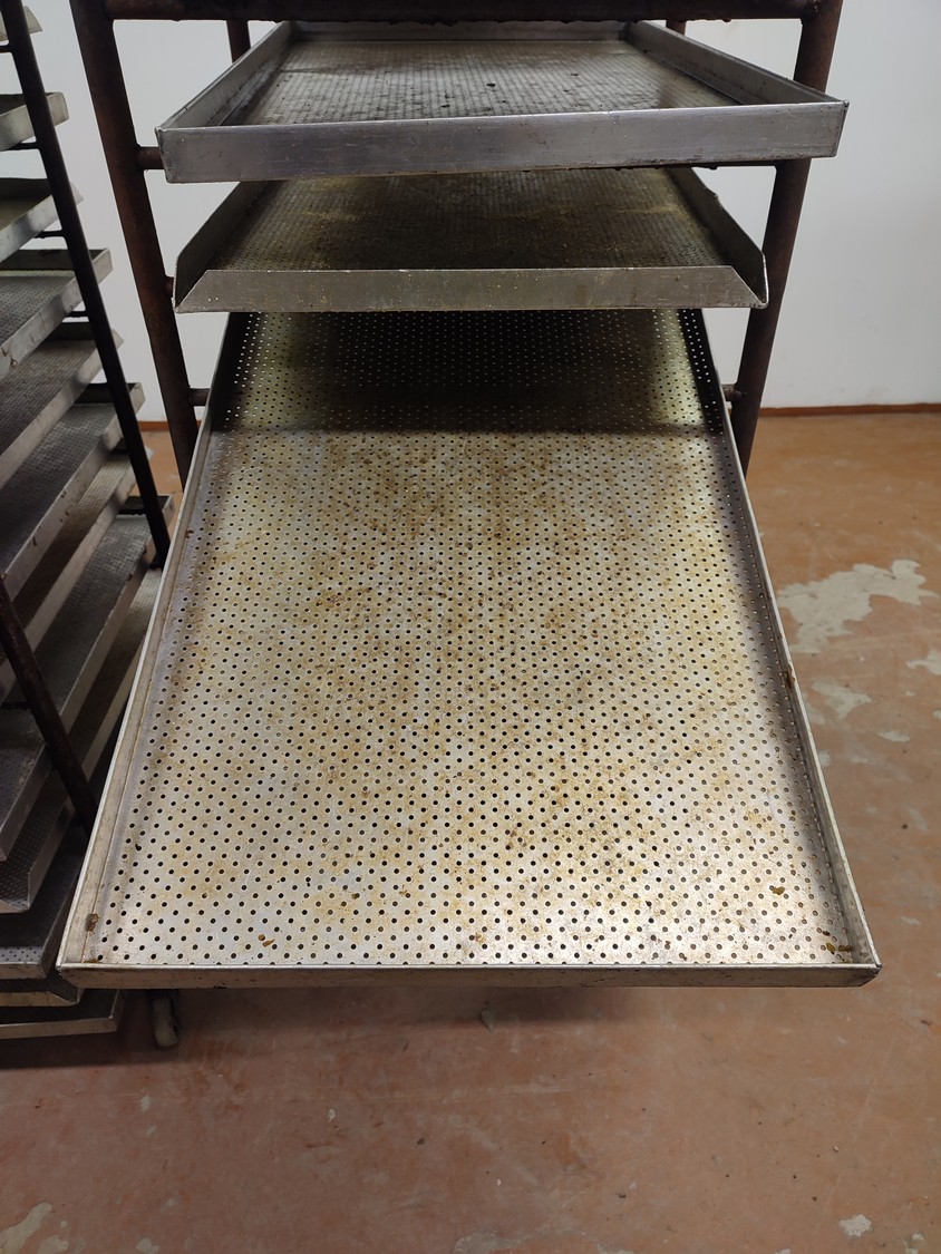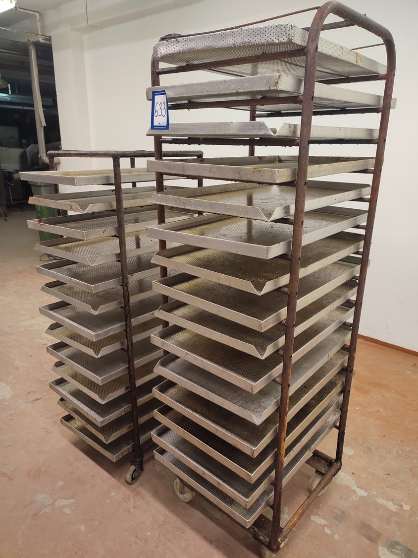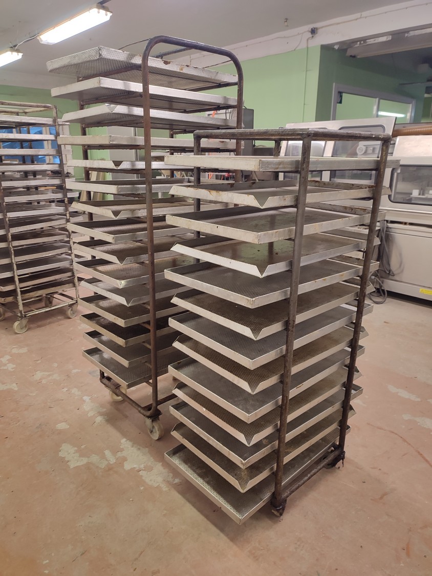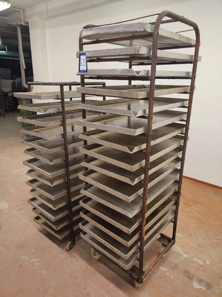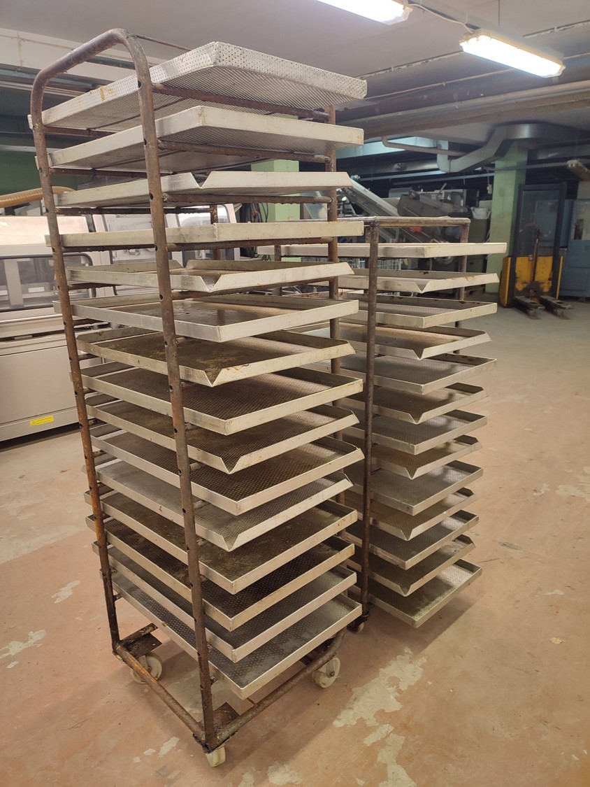 2 steel trolleys, (1) x 15 floors, floor dimensions: 490 mm x 530 mm, distance between floors: 100 mm, (1) x 13 floors, floor dimensions: 460 mm x 450 mm, distance between floors: 100 mm, baking tray dimensions: 440 mm x 760 mm, total dimensions: (1) 545 mm x 760 mm x 1790 mm; (1) 510 mm x 760 mm x 1450 mm.