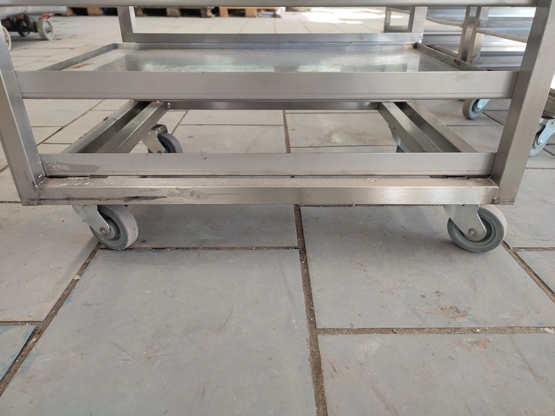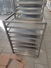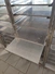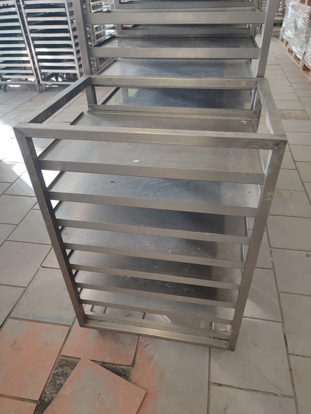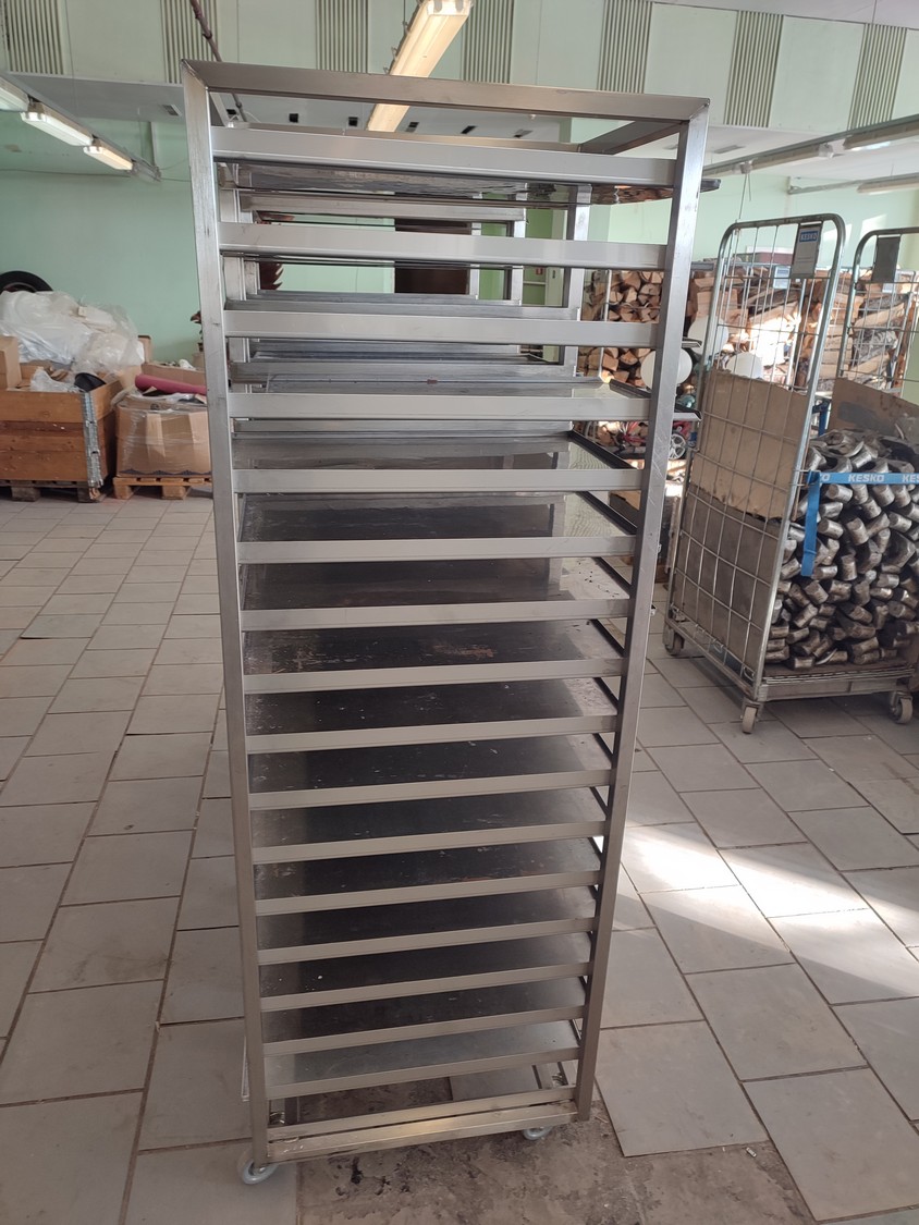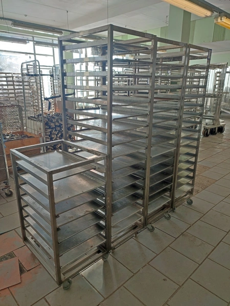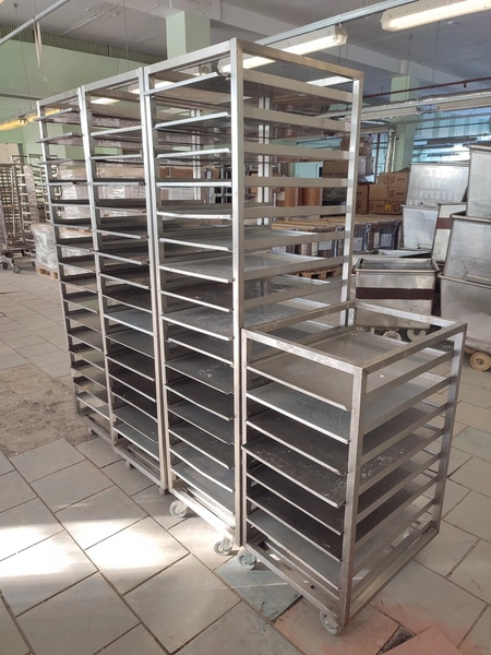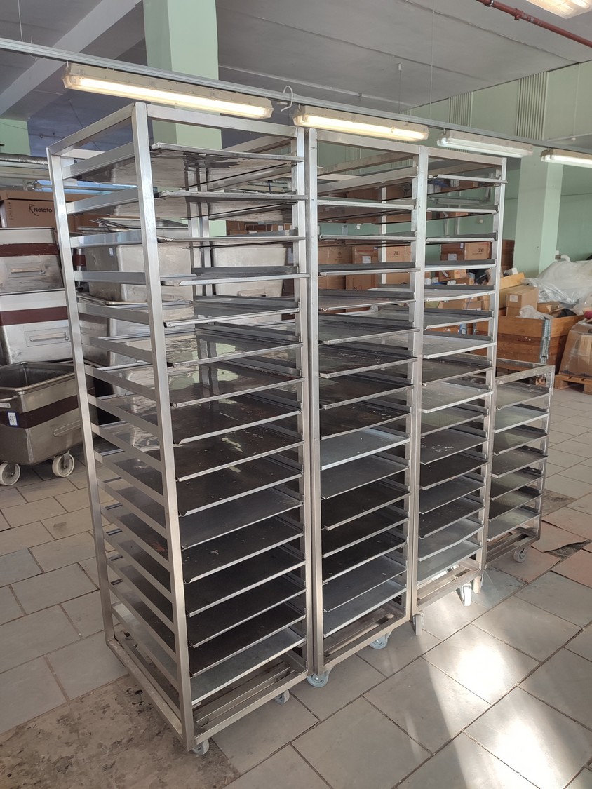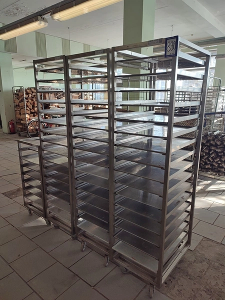 4 s/s trolleys, (1) x 8 floors, (3) x 17 floors, floor dimensions: 405 mm x 590 mm, distance between floors: 95 mm, total dimensions: (1) 450 mm x 600 mm x 940 mm; (3x) 460 mm x 595 mm x 1745 mm. Including approximately 55 s/s plates.