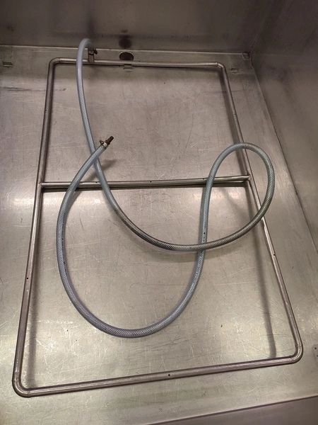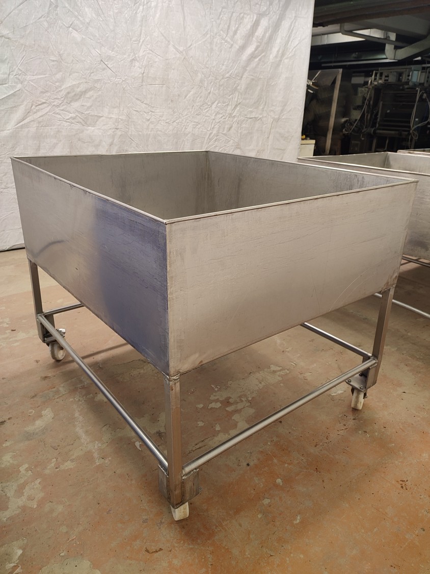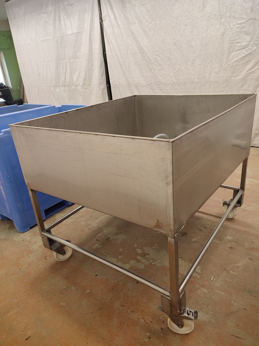 Mobile s/s tub with drain, dimensions: 1210 mm x 1010 mm x 980 mm.
