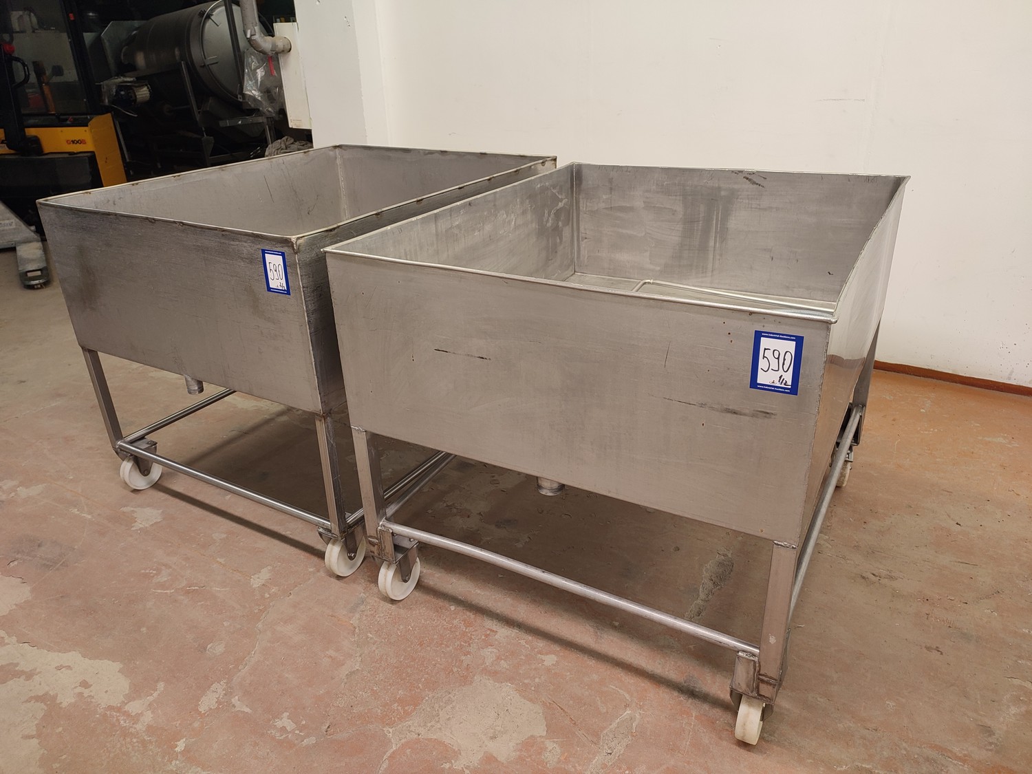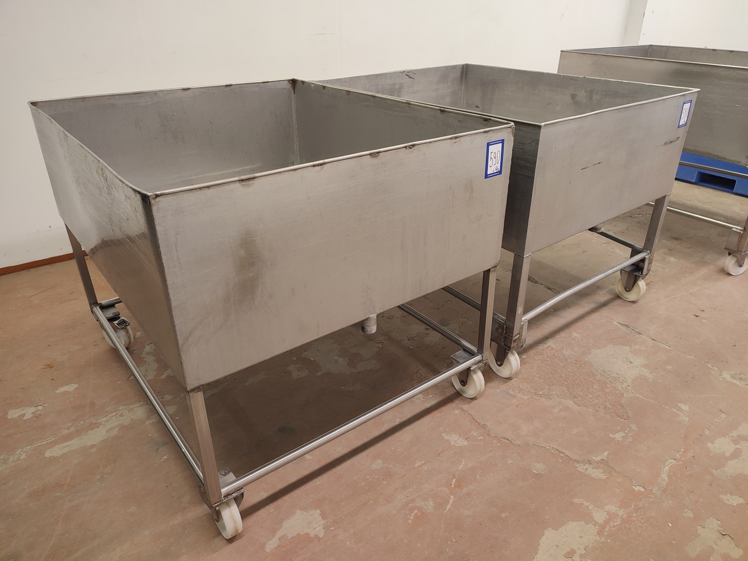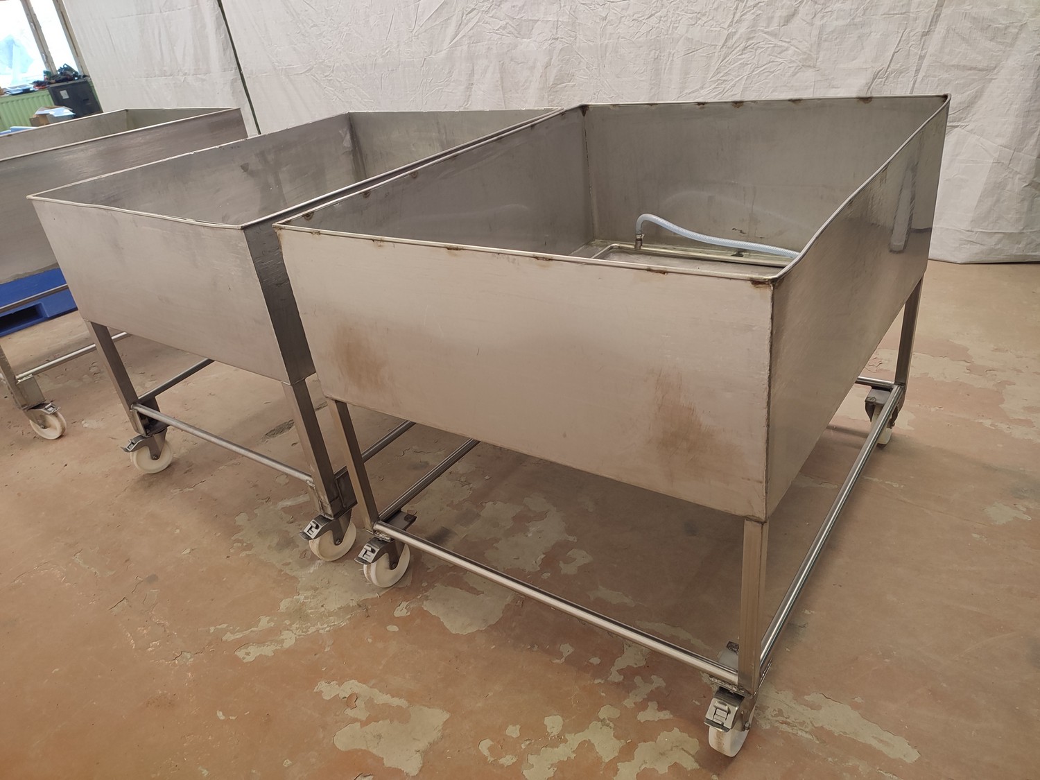 2 mobile s/s tubs with drain, dimensions: (2x) 1010 mm x 1220 mm x 955 mm.