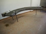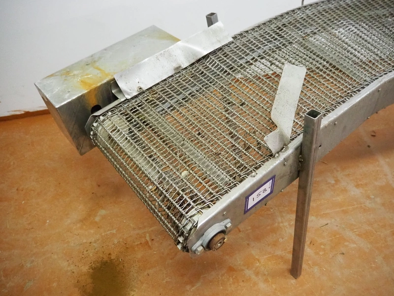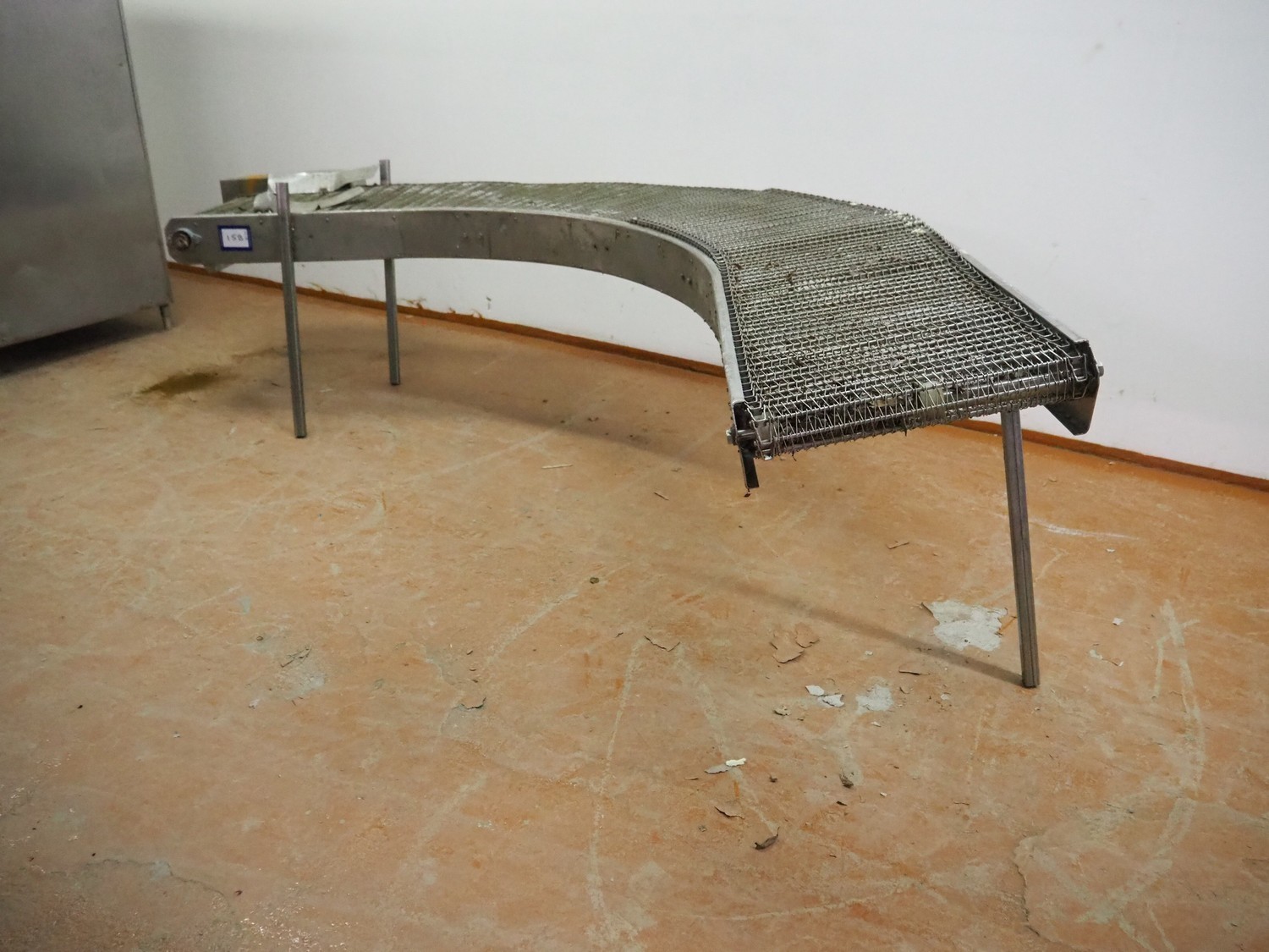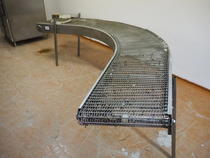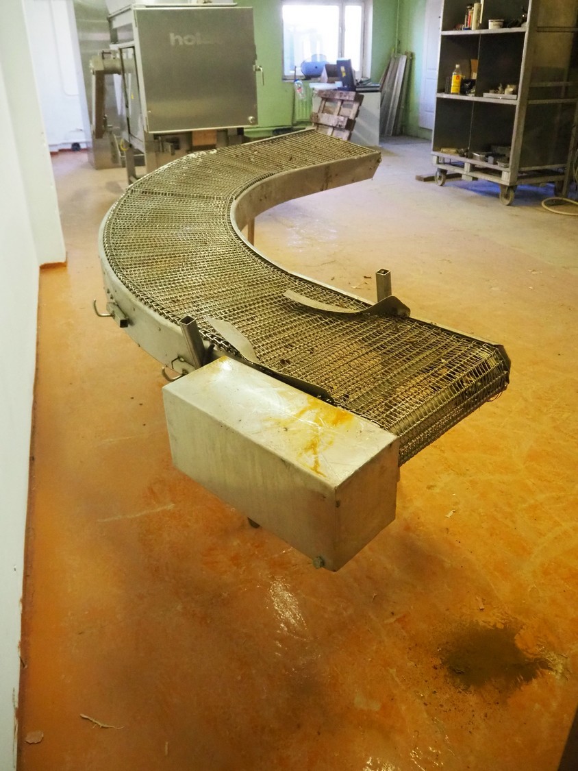90° curve conveyor, s/s frame, s/s mesh belt, belt width: 450 mm, total dimensions: 3200 mm x 1400 mm x 850 mm. Missing 1 leg.