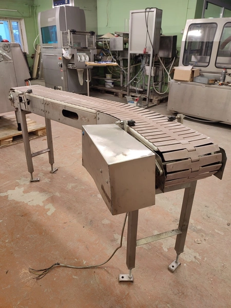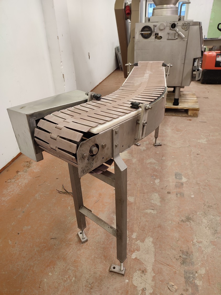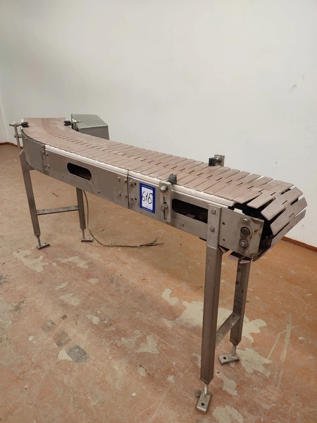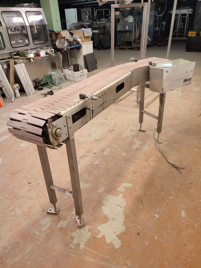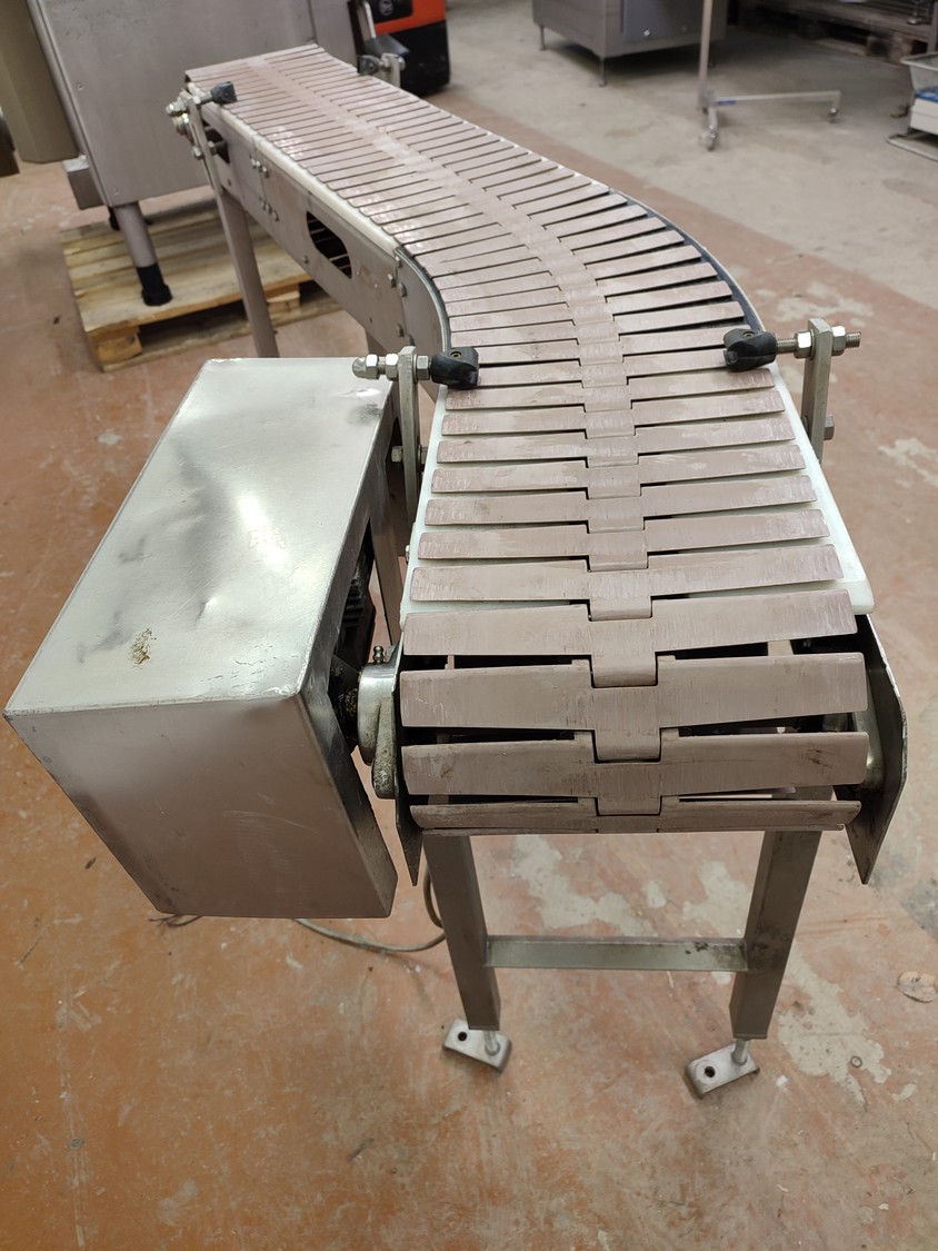 45° Curve conveyor, s/s frame, plastic belt, belt width 255 mm, total dimensions 1900 mm x 550 mm x 950 mm.