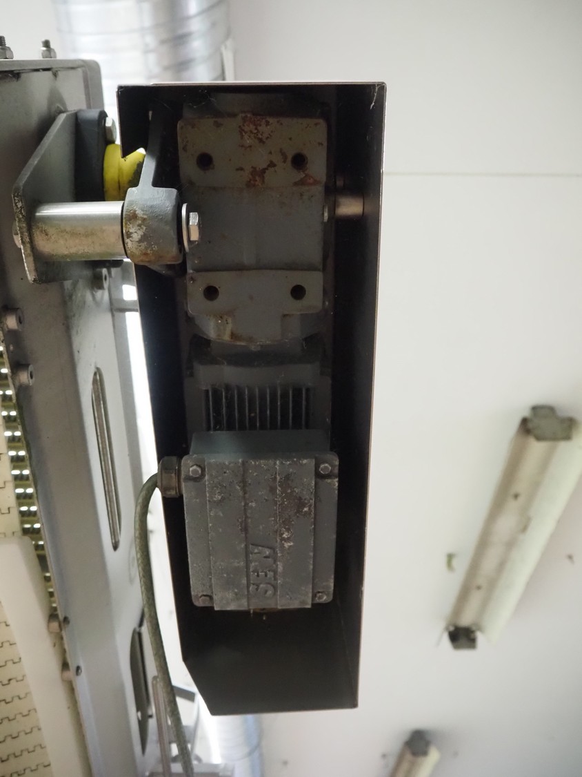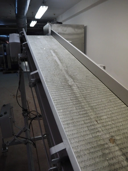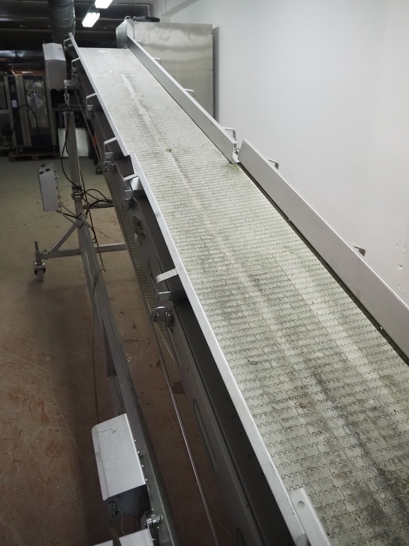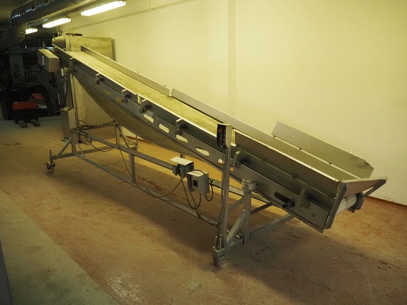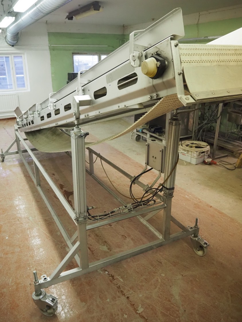 Antti Lindfors OY mobile elevating belt, type: Lamellik, number: 53408, year of construction: 2010, 0.55 kW, 200 kg, s/s frame, plastic belt, belt width: 510 mm, elevating height: 1950 mm, total dimensions: 5300 mm x 1600 mm x 2000 mm.