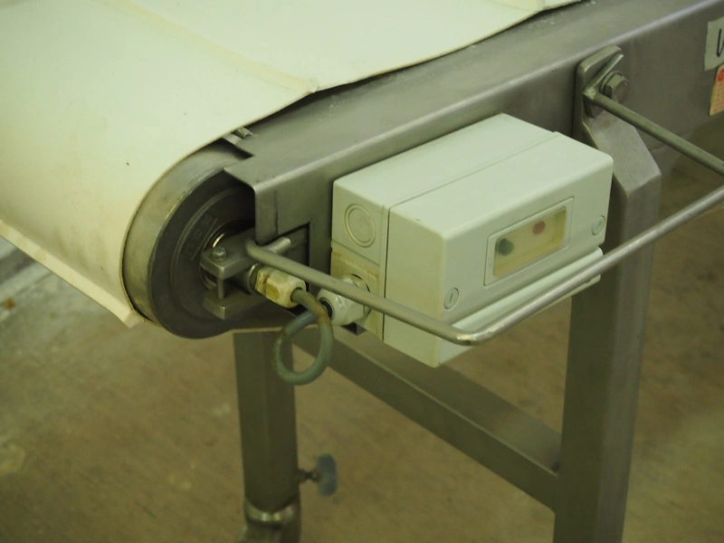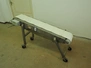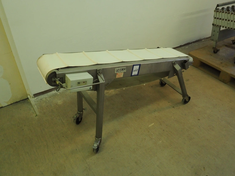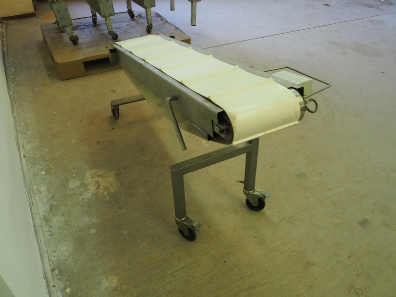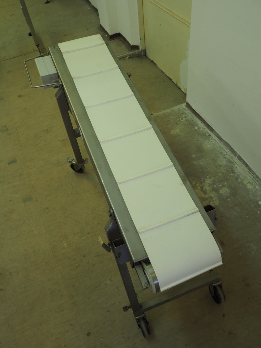Koneteollisuus OY mobile elevating belt with dividers, s/s frame, plastic belt, belt width: 240 mm, distance between dividers: 210 mm, divider height: 10 mm, elevating height: from 550 mm to 800 mm, total dimensions: 1400 mm x 500 mm x 850 mm.