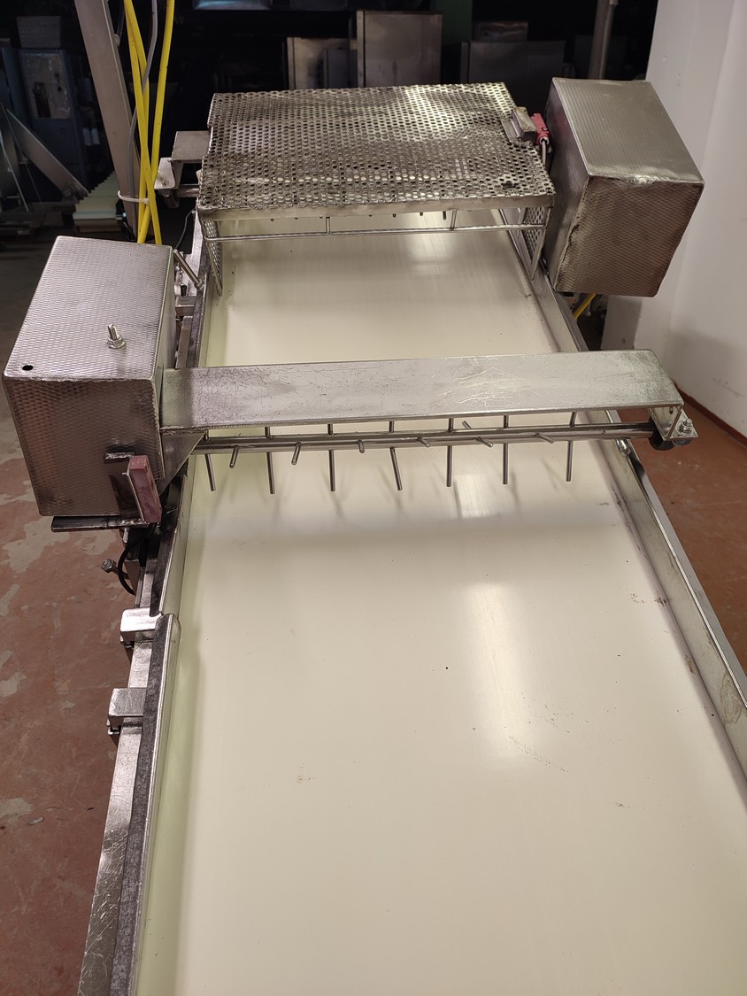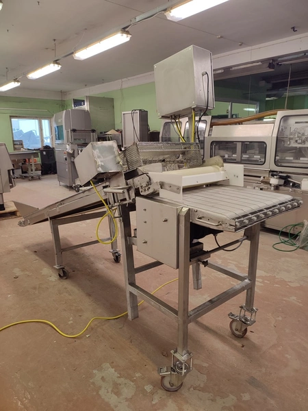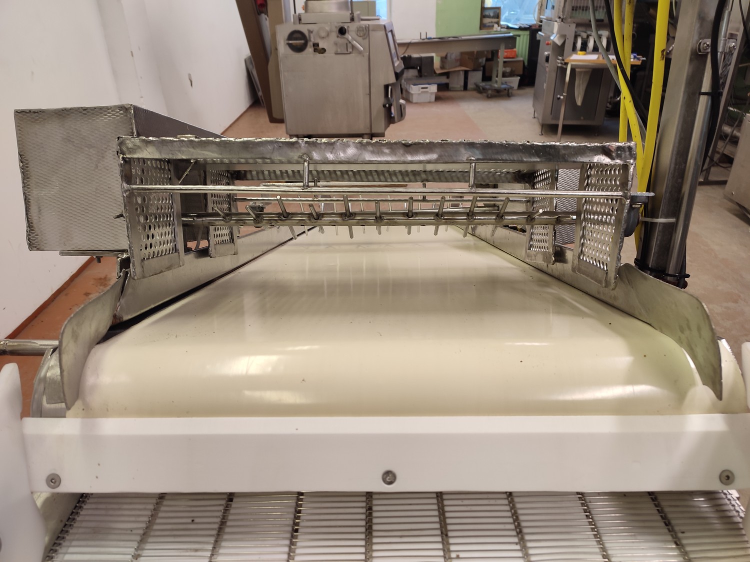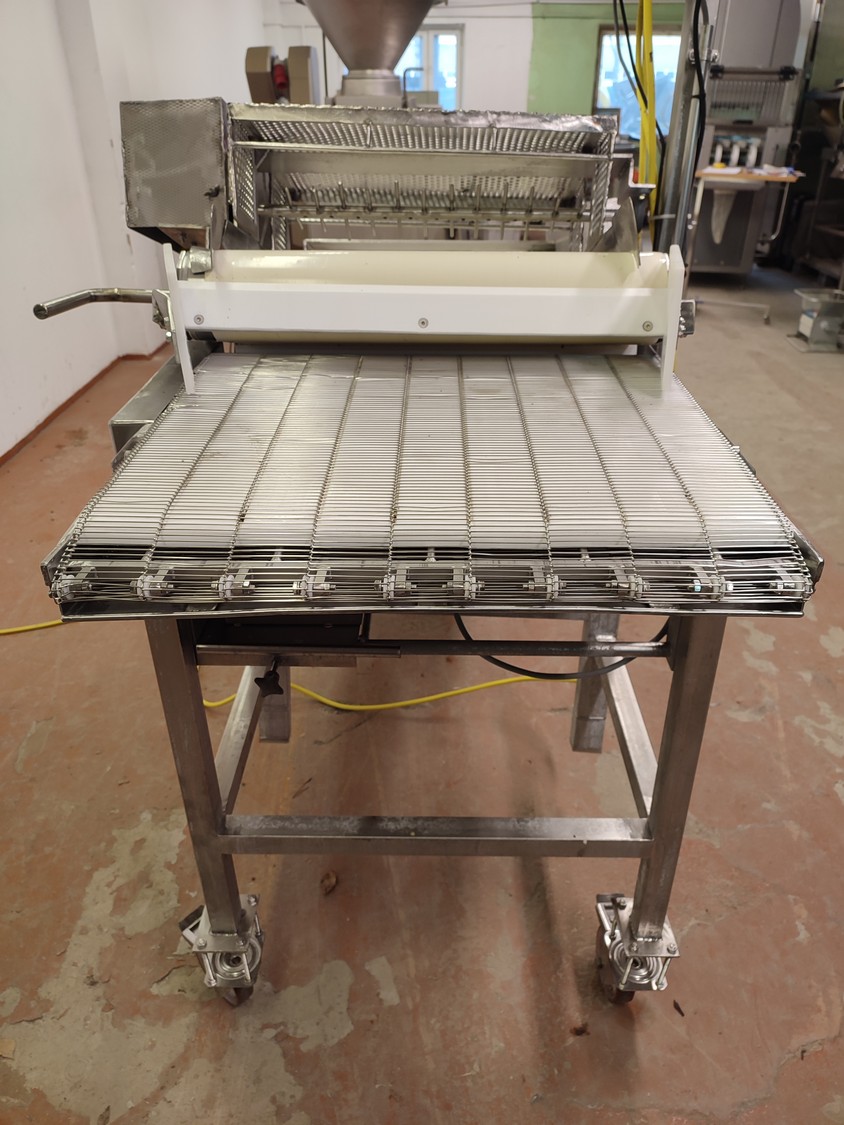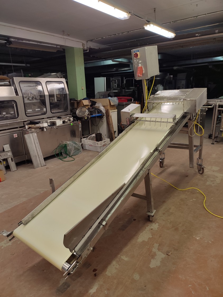 Mobile elevating belt, plastic belt, belt width: 580 mm, output conveyor s/s mesh belt, belt width: 600 mm, total dimensions: 3300 mm x 850 mm x 1940 mm.