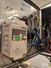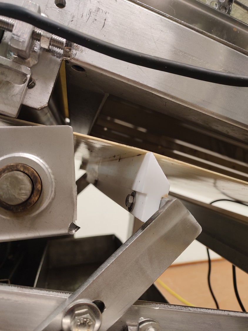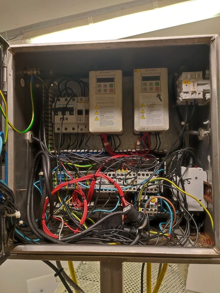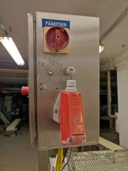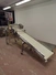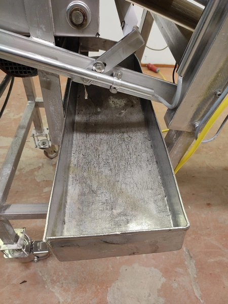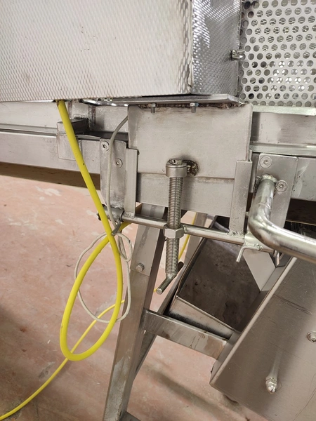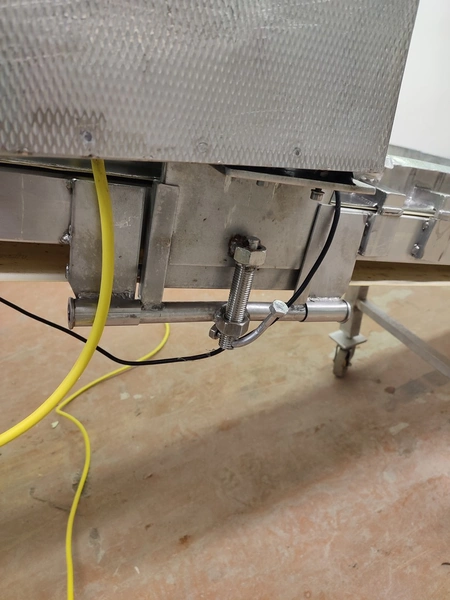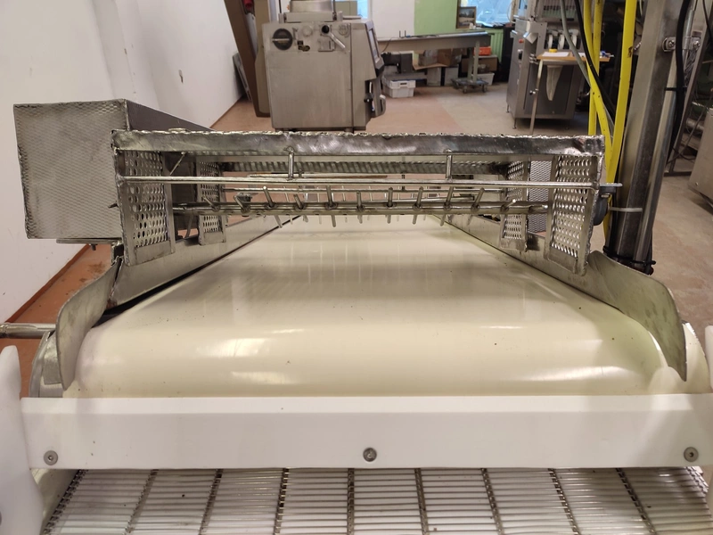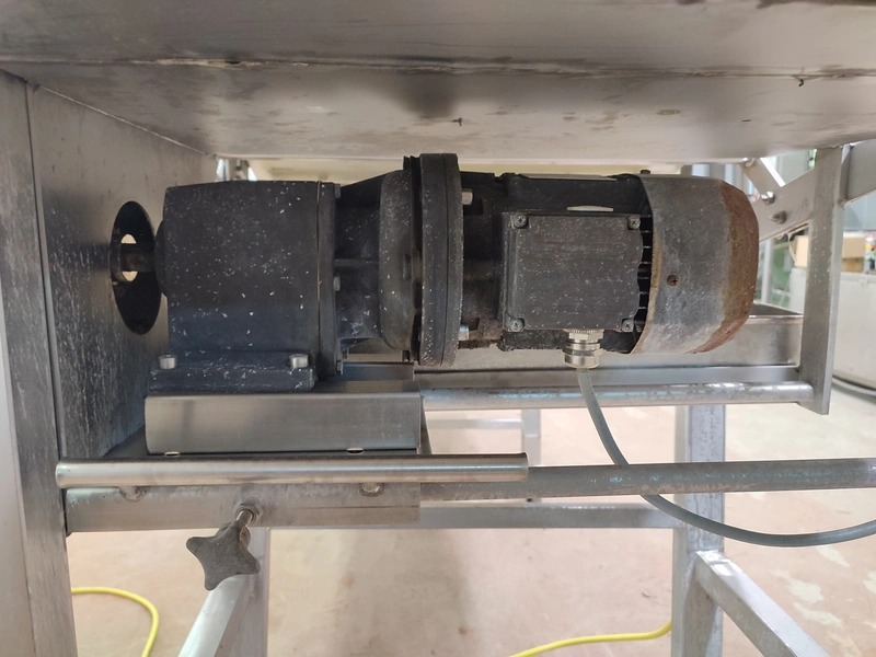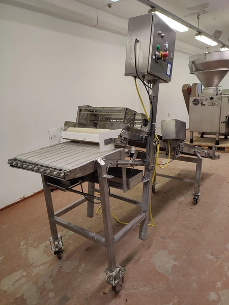 Mobile elevating belt, plastic belt, belt width: 580 mm, output conveyor s/s mesh belt, belt width: 600 mm, total dimensions: 3300 mm x 850 mm x 1940 mm.