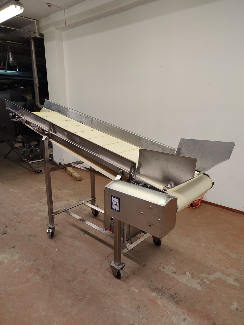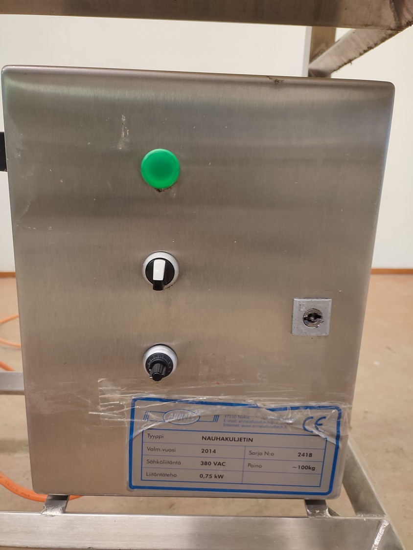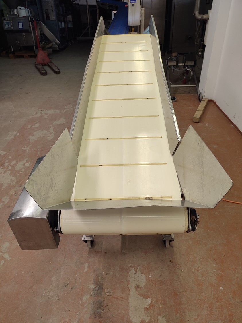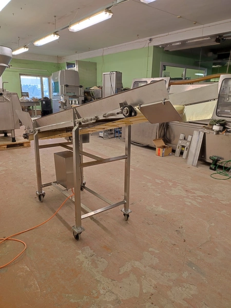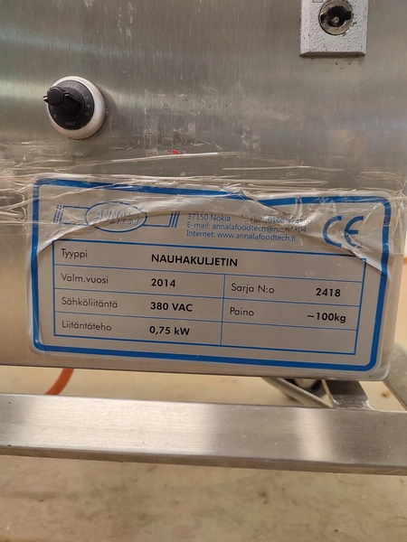 Annala Foodtech mobile elevating belt with infeed bunker, type: NAUHAKULJETIN, serial number: 2418, year of construction: 2014, 380 V, 0.75 kW, weight: 100 kg, s/s frame, plastic belt and dividers, belt width: 500 mm, divider height: 5 mm, distance between dividers: 195 mm, elevating height: 1280 mm, total dimensions: 2370 mm x 840 mm x 1430 mm.