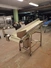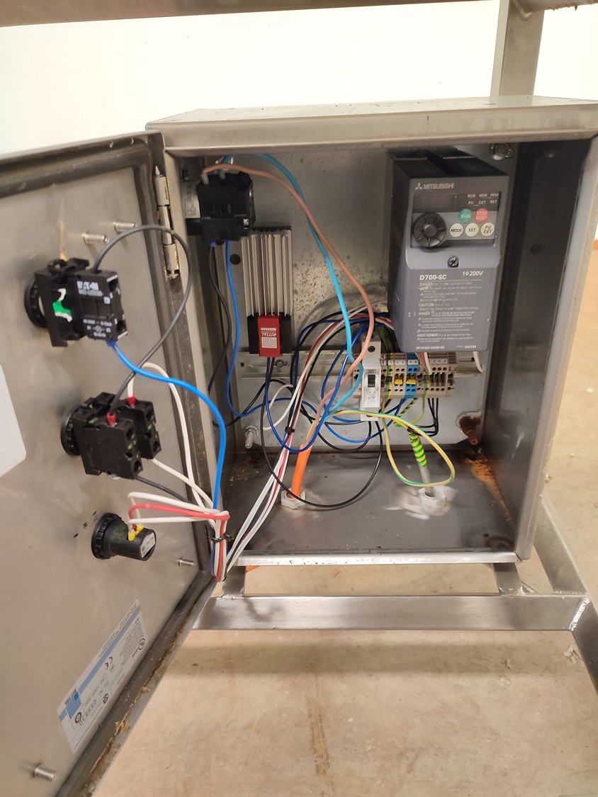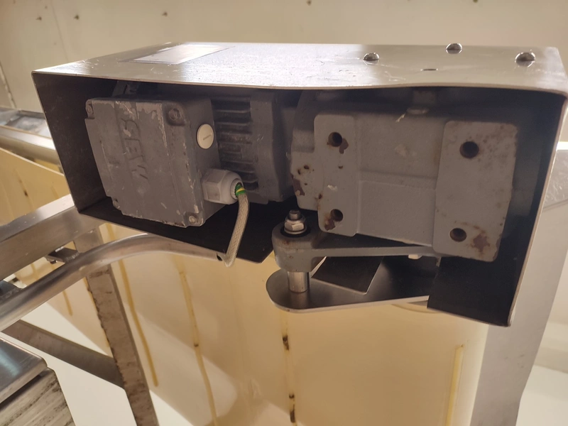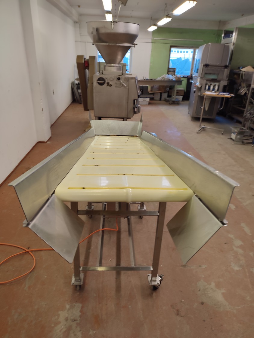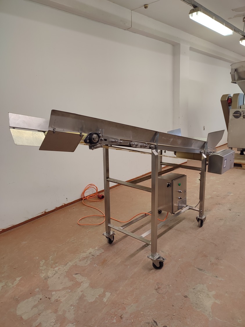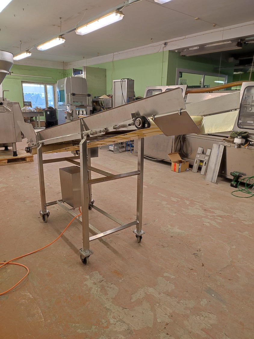 Annala Foodtech mobile elevating belt with infeed bunker, type: NAUHAKULJETIN, serial number: 2418, year of construction: 2014, 380 V, 0.75 kW, weight: 100 kg, s/s frame, plastic belt and dividers, belt width: 500 mm, divider height: 5 mm, distance between dividers: 195 mm, elevating height: 1280 mm, total dimensions: 2370 mm x 840 mm x 1430 mm.