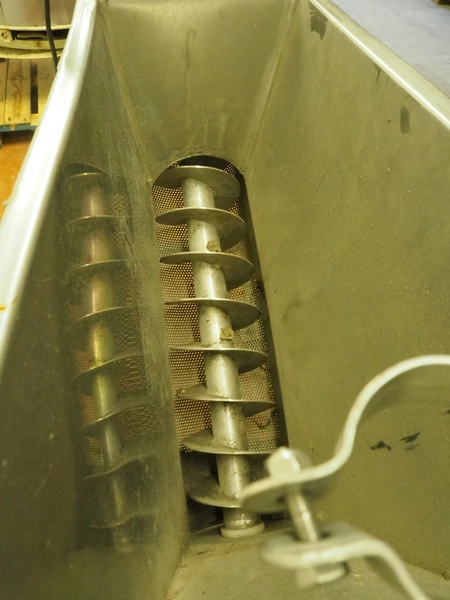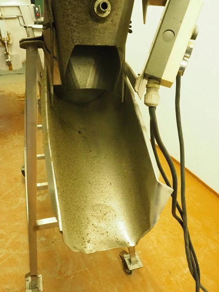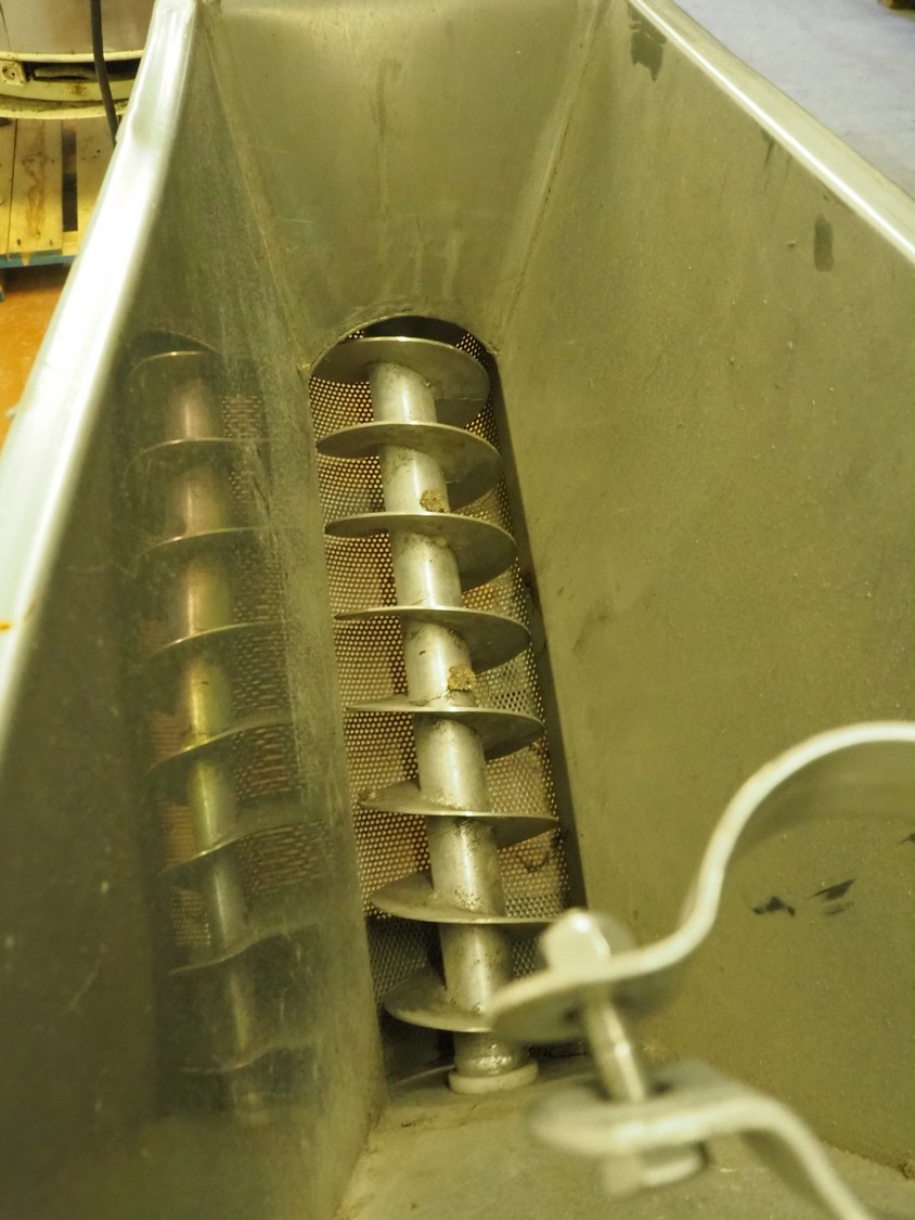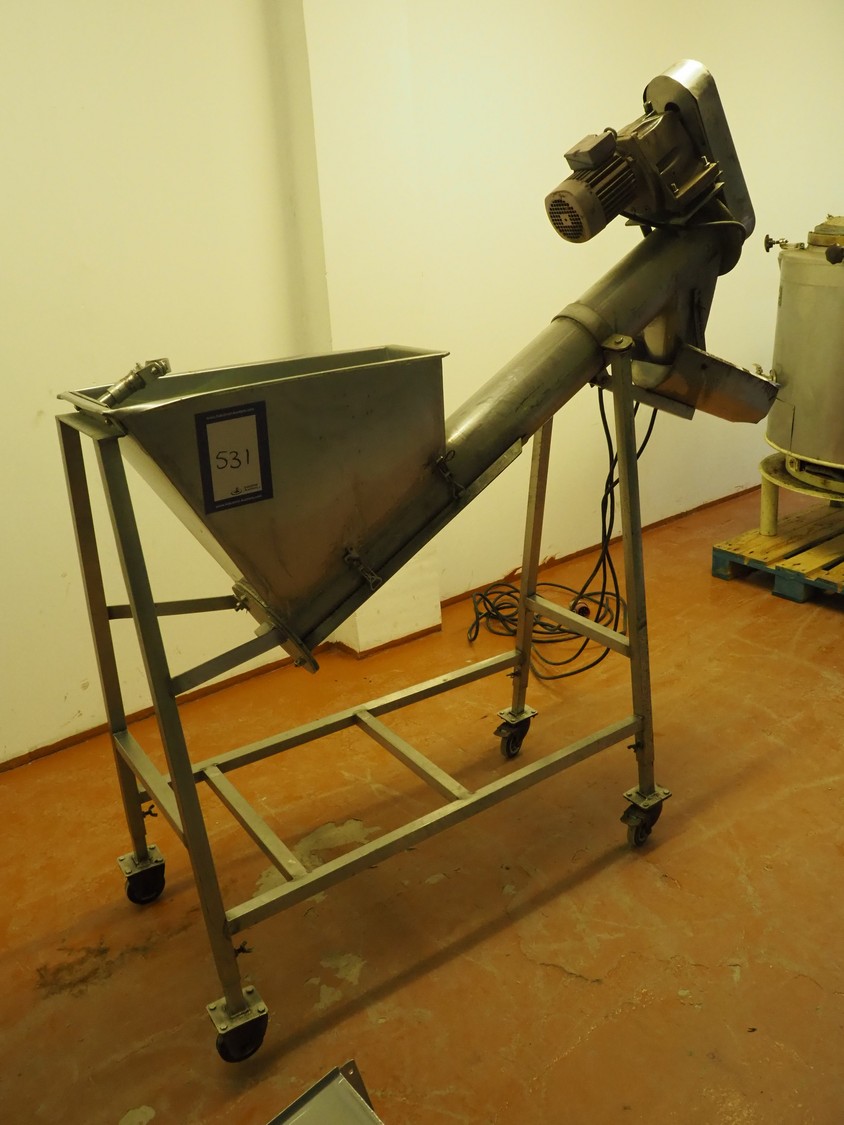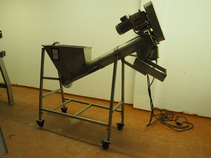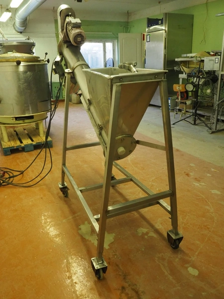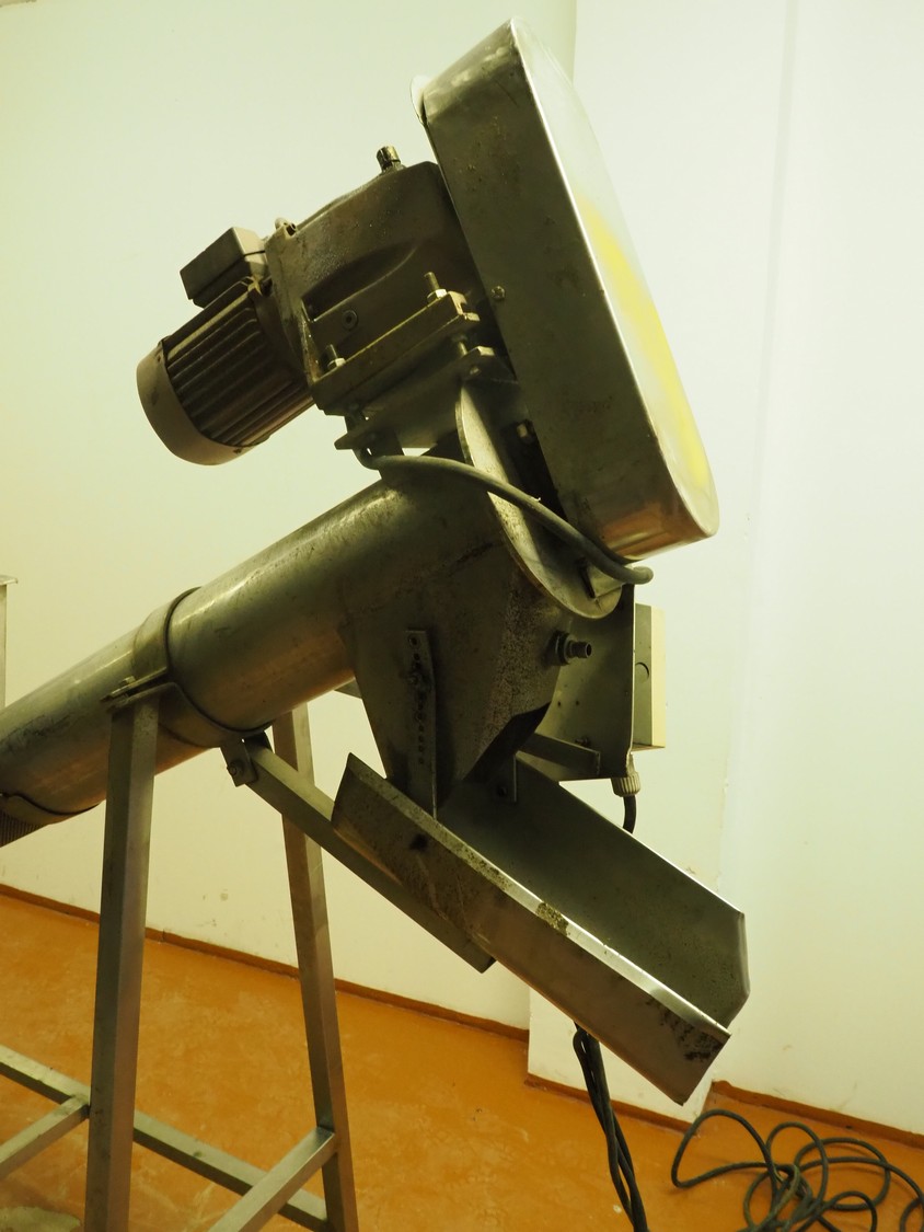 Mobile elevating screw with sieve, s/s screw, screw width: 140 mm, tier: 65 mm, elevating height: 1040 mm , sieve: 2 mm, total dimensions: 1930 mm x 710 mm x 1960 mm.