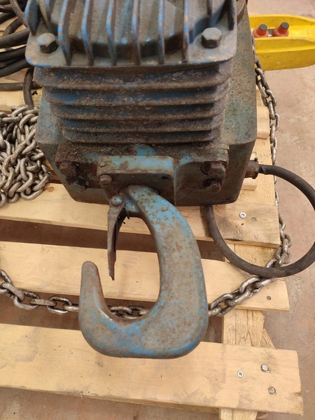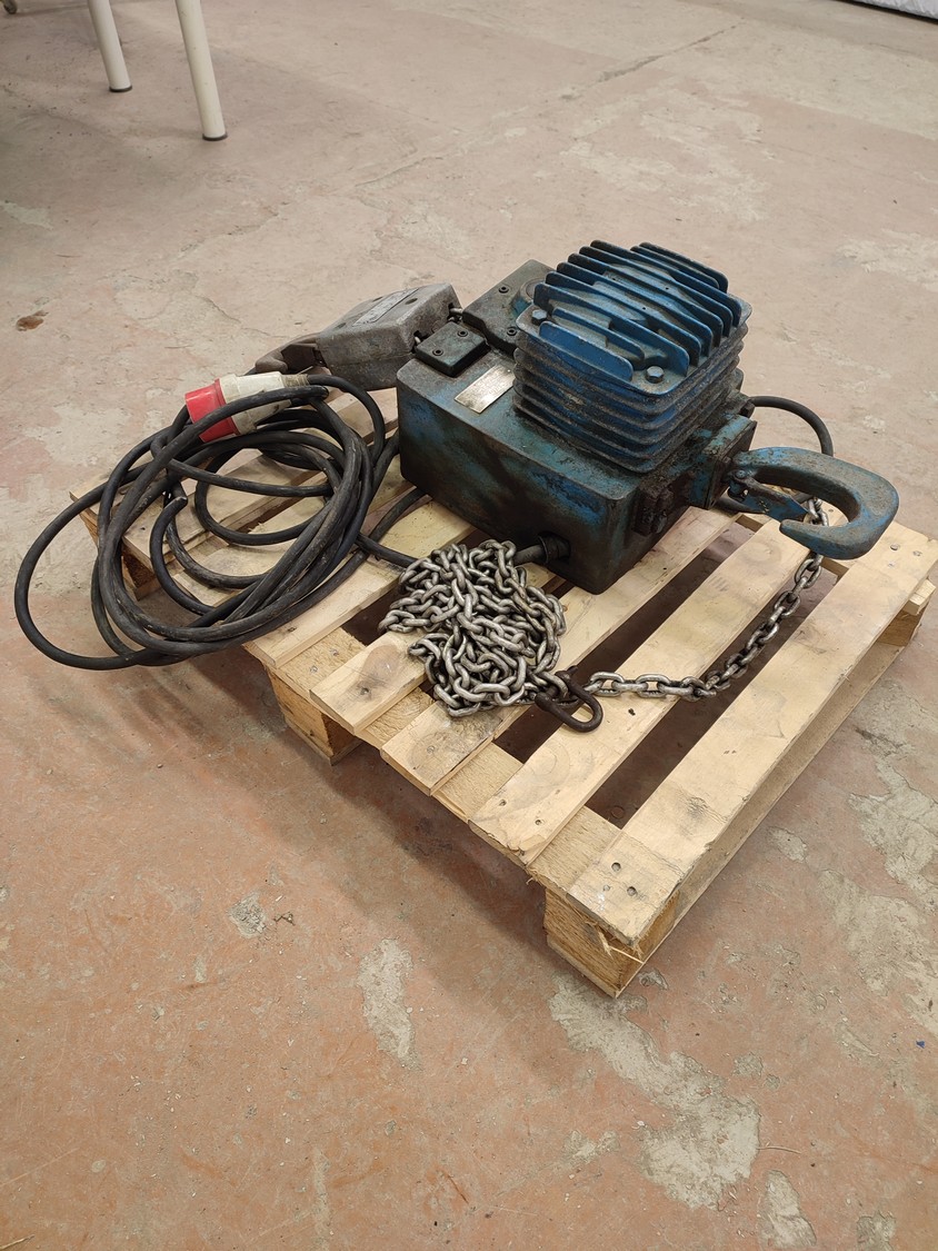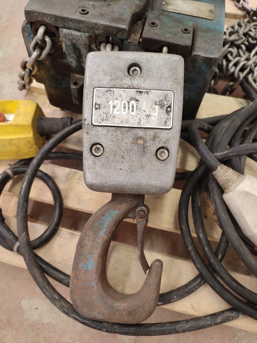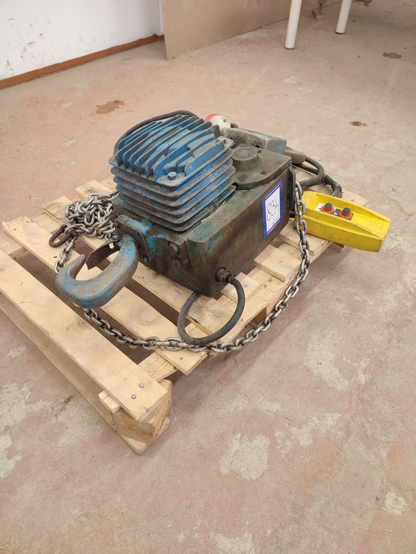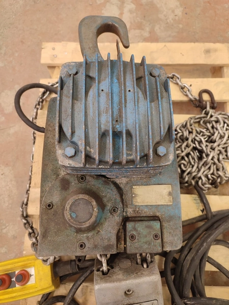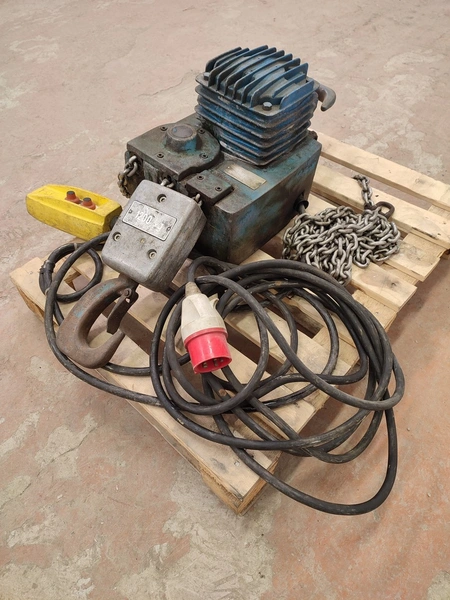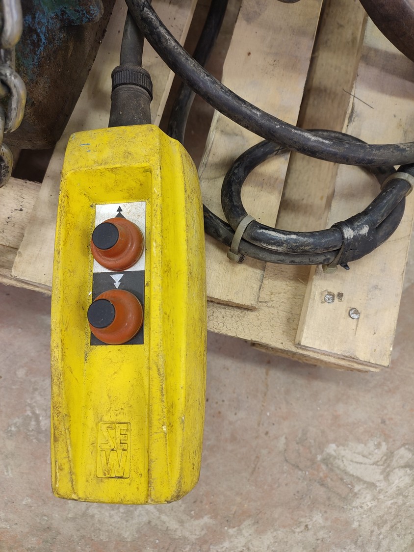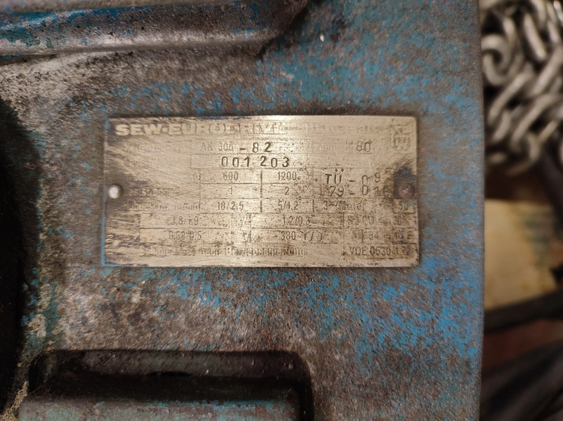 Sew-Eurodrive electric chain hoist, type: AK 306-82, number: 001 203, year of construction: 1980, 380 V, 3 Ph, 50 Hz, 3.8/1.9 A, 1.2/0.3 kW, capacity: 600/1200 kg, dimensions: 800 mm x 600 mm x 400 mm.