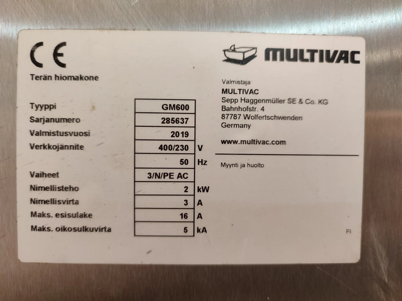 Multivac knife sharpener, type: GM600, serial number: 285637, year of construction: 2019, 400/230 V, 50 Hz, 3 Ph, 2 kW, 3 A, dimensions: 1800 mm x 900 mm x 1920 mm.