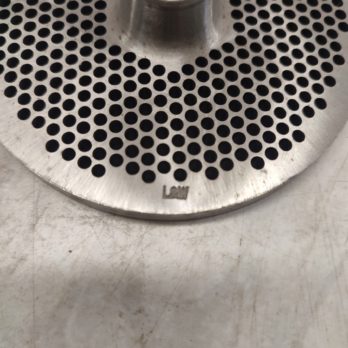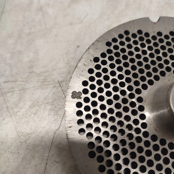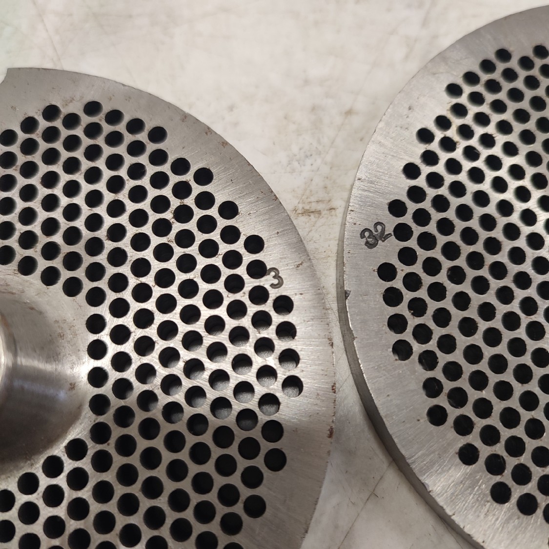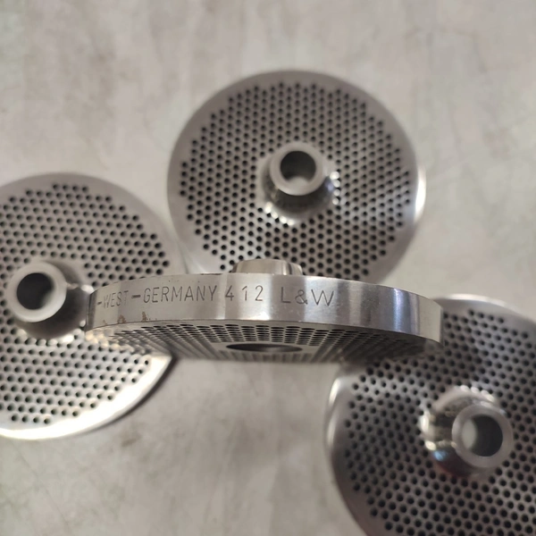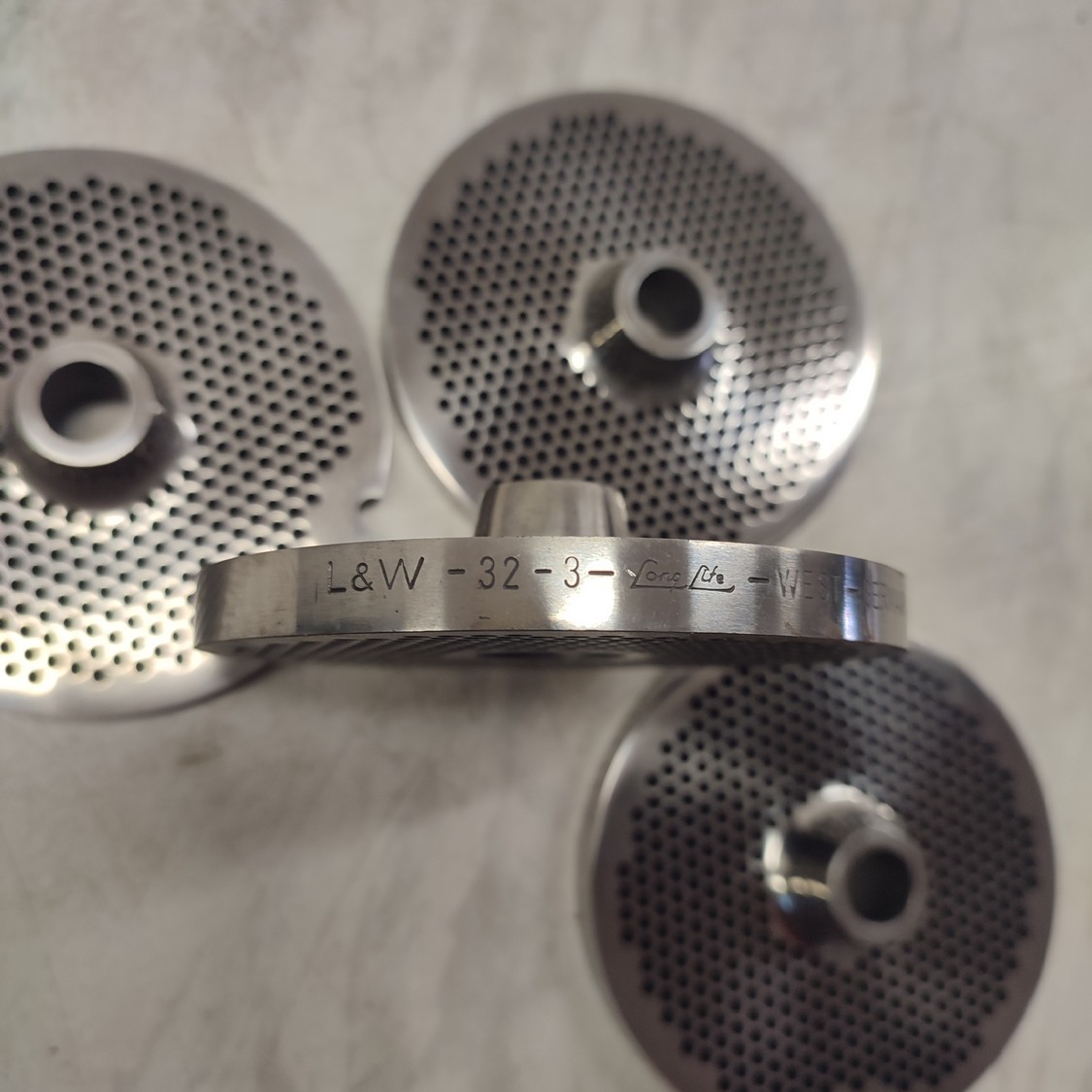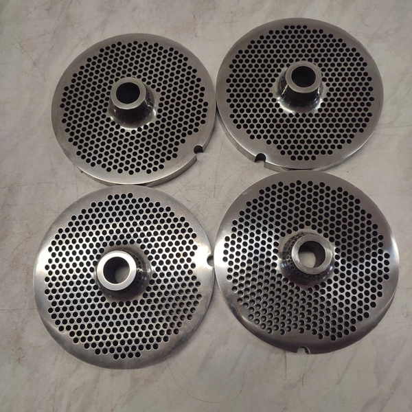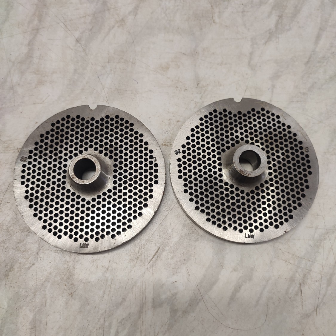 6 Lumbeck & Wolter grinder plates, size: 32, plate diameter: 100 mm, Ø centre hole: 13 mm, hole plate: 3.0 mm, thickness: (2x) 9 mm, (4x) 10 mm, total dimensions: 160 mm x 110 mm x 100 mm.
