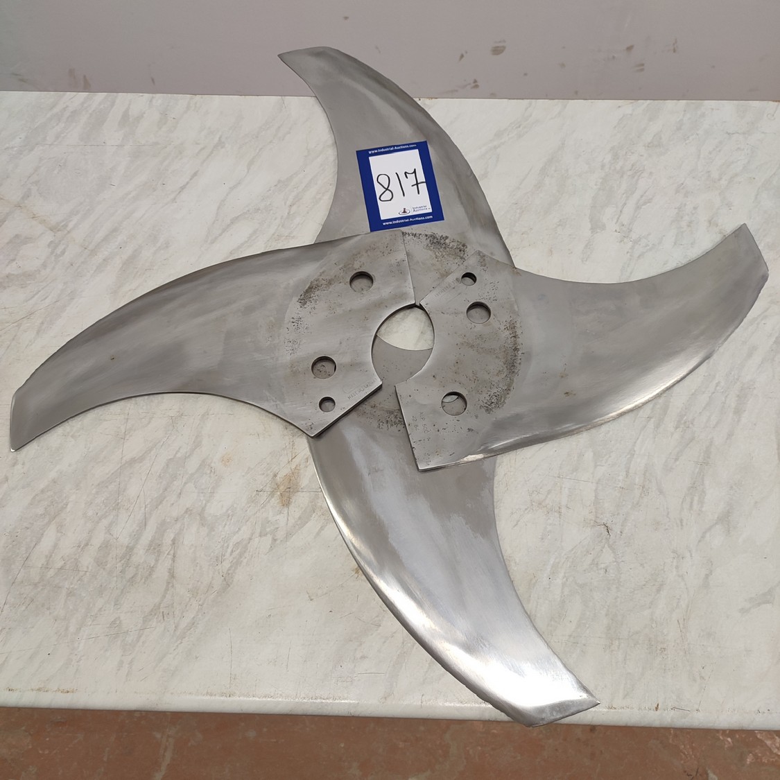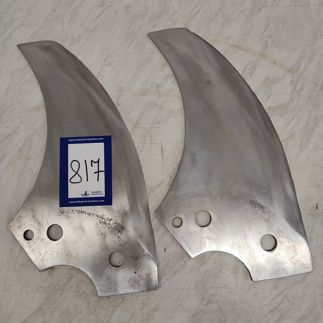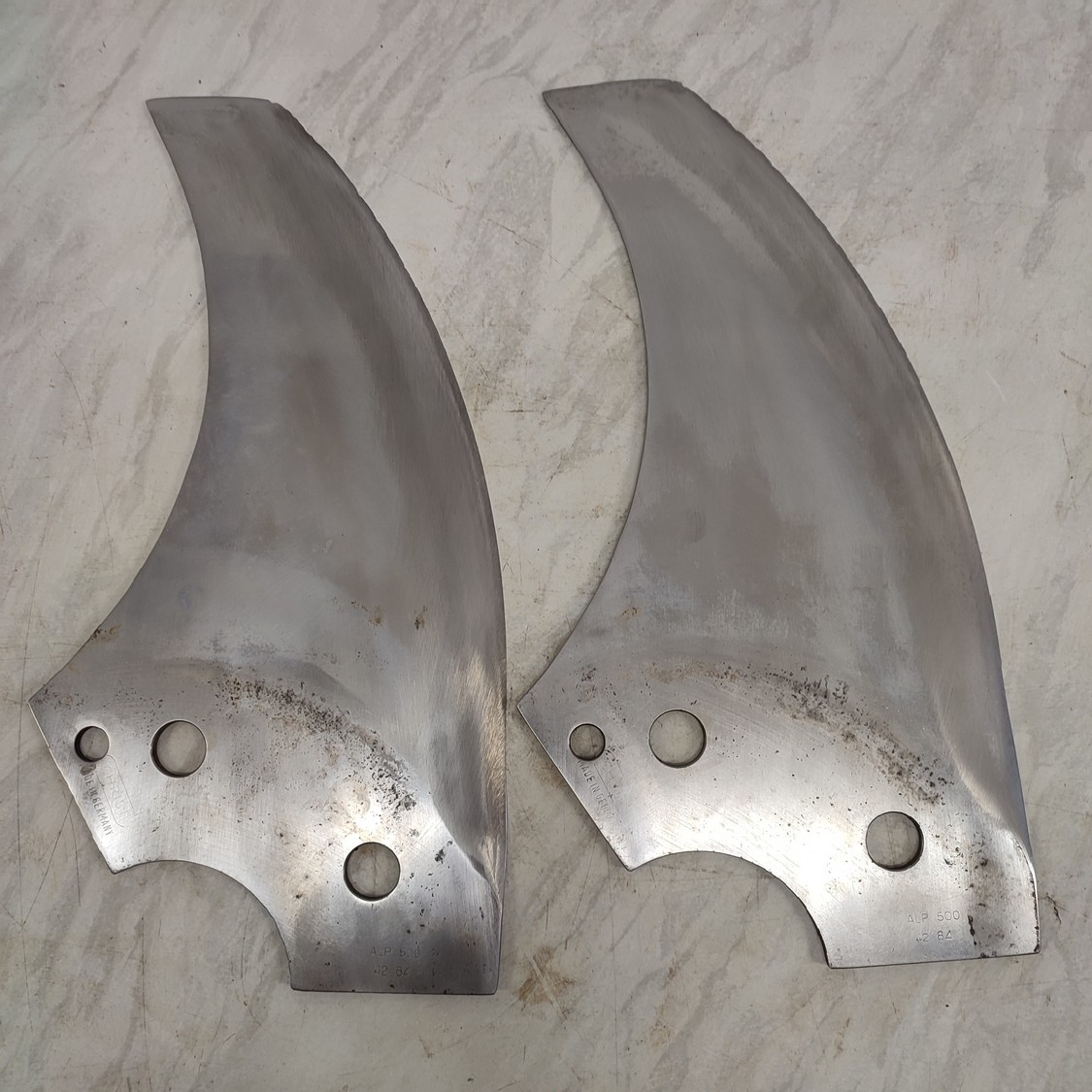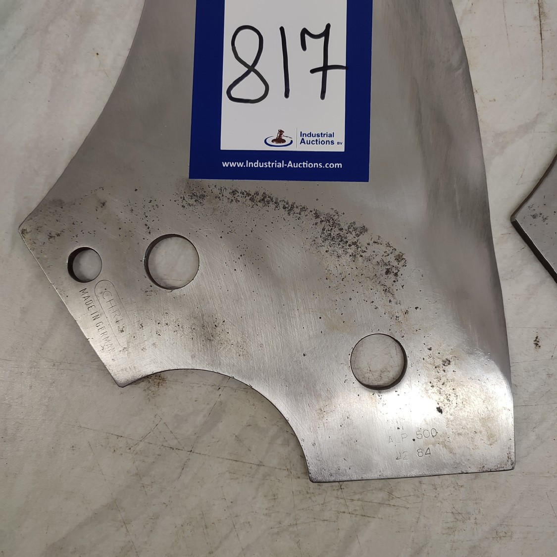 4 Christ bowl cutter blades, type: ALP 500, radius: 382 mm, thickness: 5.9 mm, shaft/hex 99 mm, total dimensions: 390 mm x 210 mm x 24 mm.
