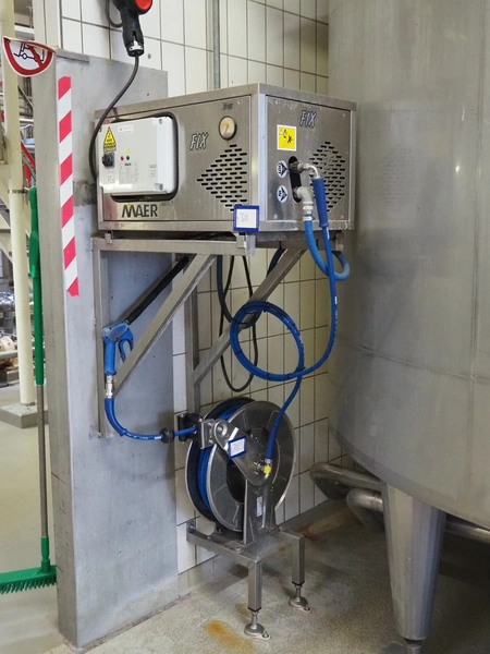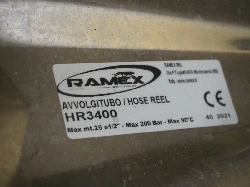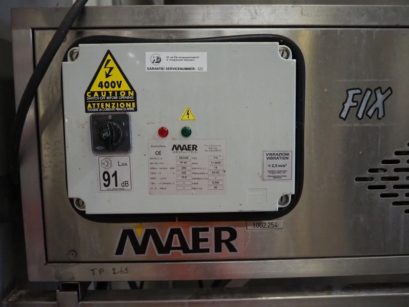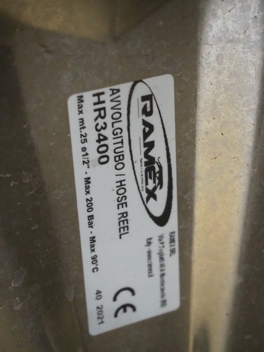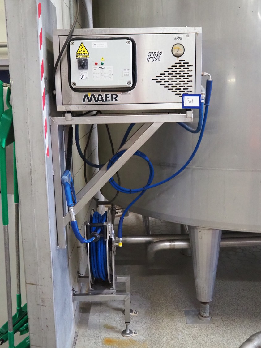 MAER Idroplulitrici high pressure cleaner, type: FIX, serial number: 082455, year of construction: 11-2008, 400 V, 50 Hz, 13.5 A, max pressure: 200 bar, weight: 80 kg, including Ramex hose reel, dimensions: 900 mm x 550 mm x 500 mm.