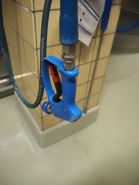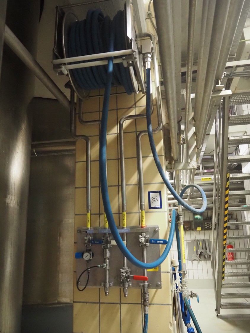 Elpress s/s hose reel with plastic hose, spray pistol and soap mixing station, type: EHT 30, dimensions: 600 mm x 300 mm x 600 mm, 150 mm x 460 mm x 500 mm.