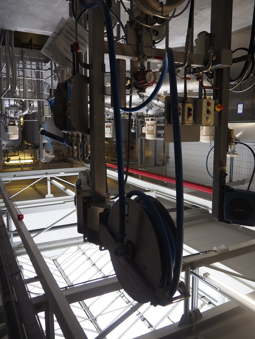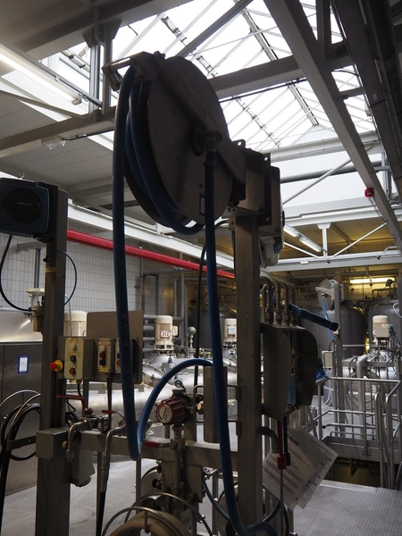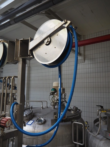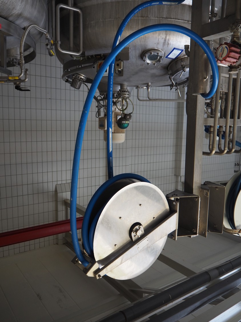 S/s hose reel with plastic hose, dimensions: 700 mm x 300 mm x 600 mm.