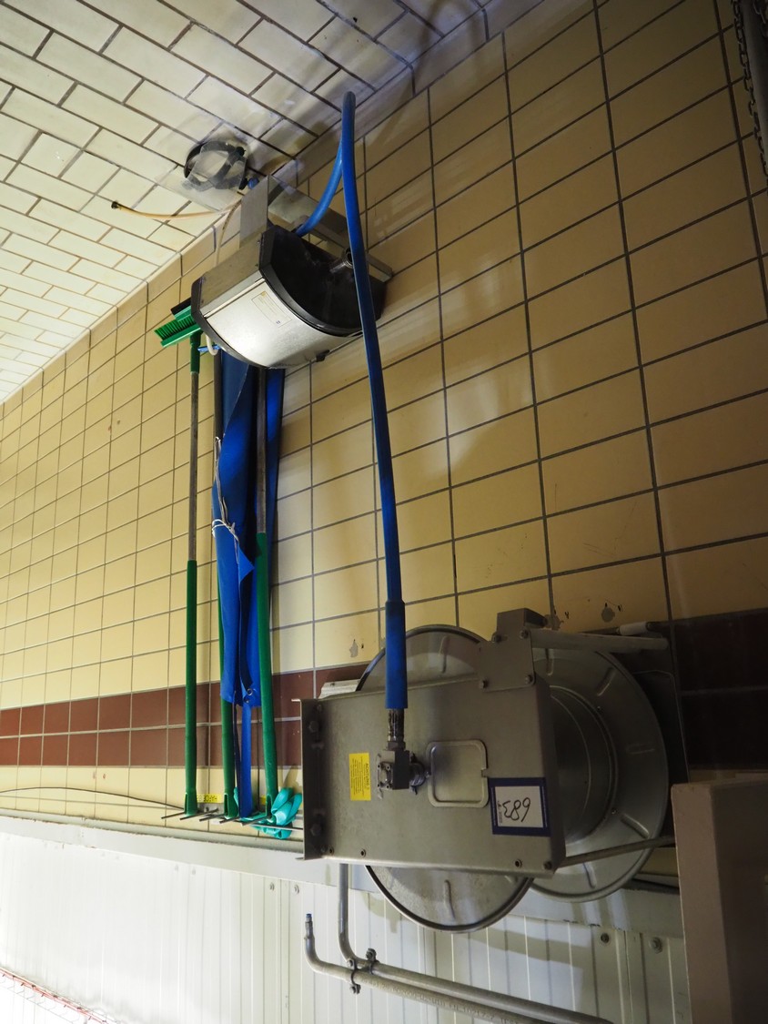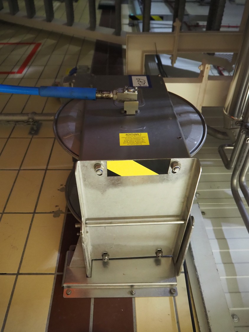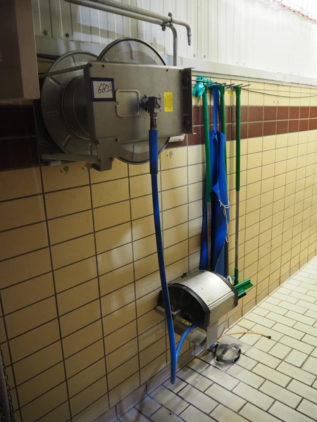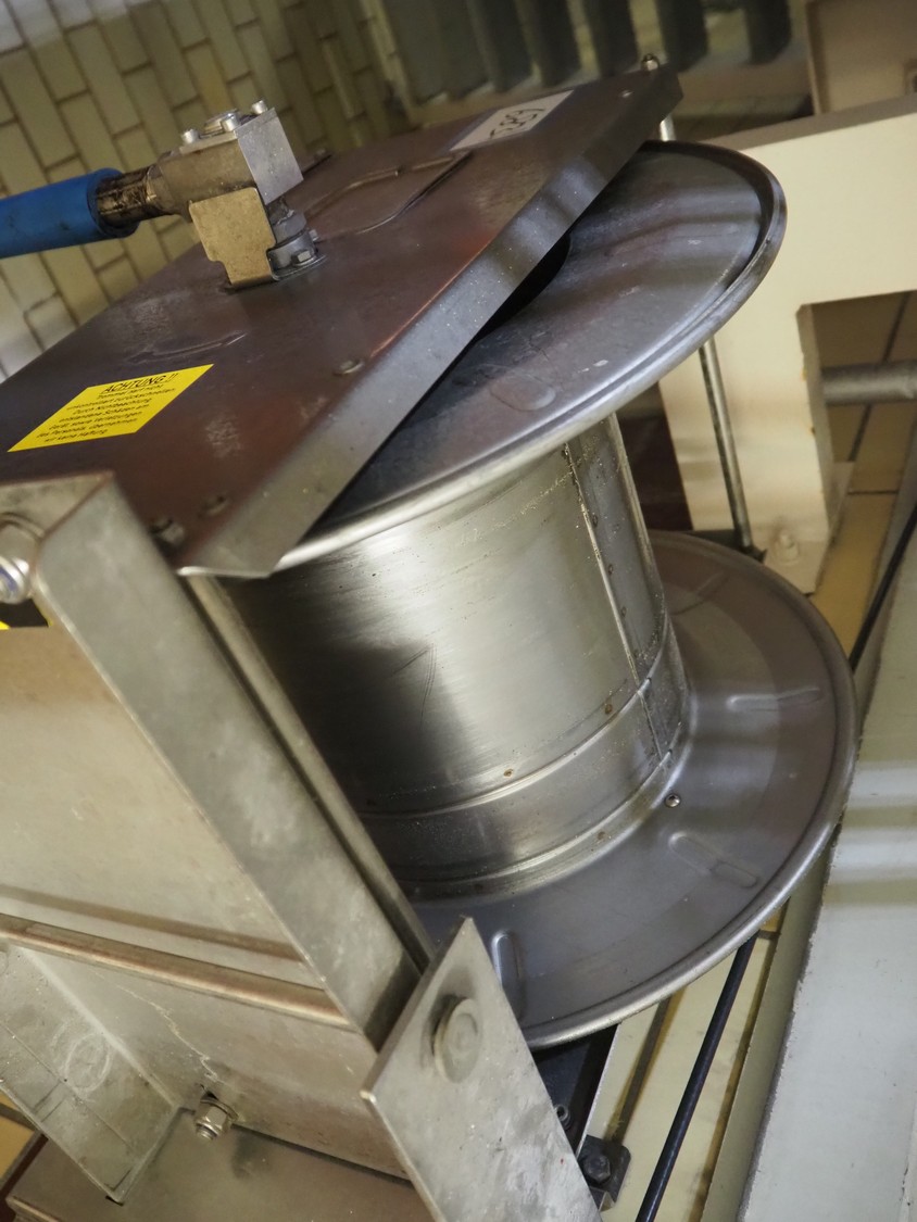 S/s hose reel with System Cleaners A/S soap mixing station, type: SD 30-2, fabrication number: 341102, fabrication number: 1998, dimensions: 500 mm x 520 mm x 520 mm, 500 mm x 250 mm x 200 mm.