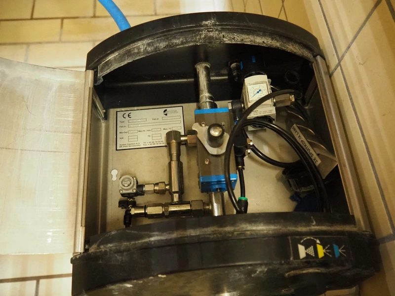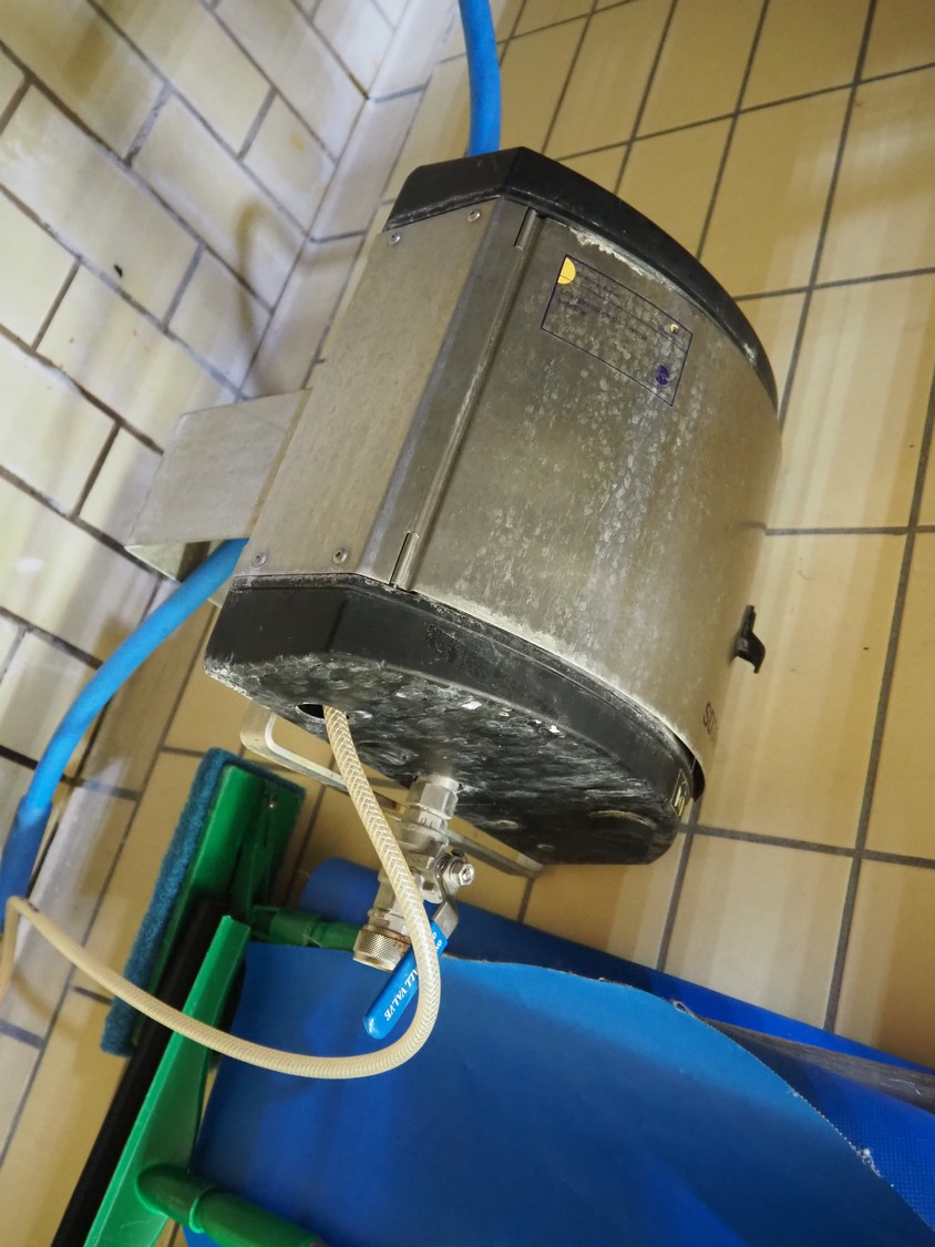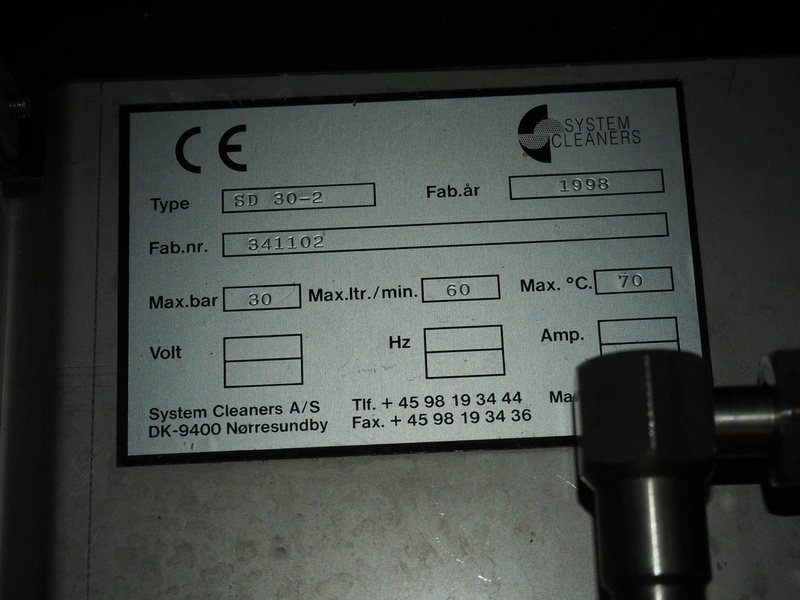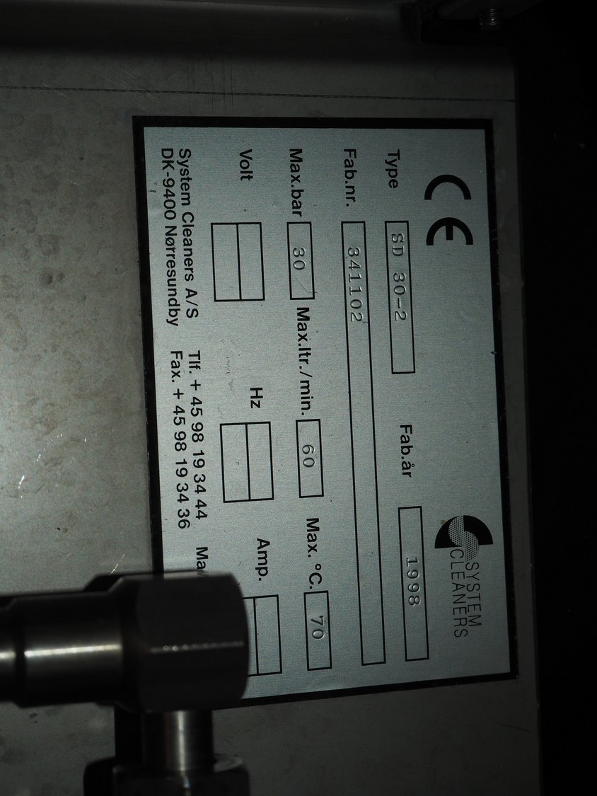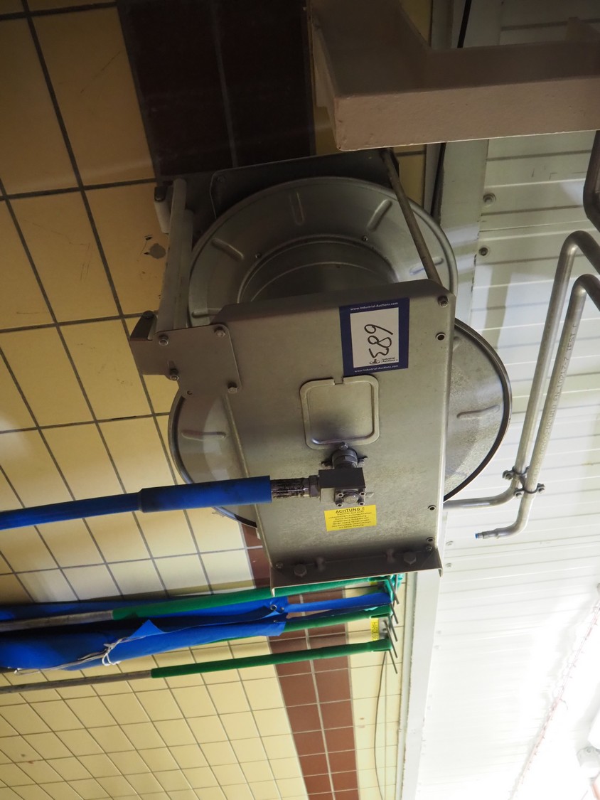 S/s hose reel with System Cleaners A/S soap mixing station, type: SD 30-2, fabrication number: 341102, fabrication number: 1998, dimensions: 500 mm x 520 mm x 520 mm, 500 mm x 250 mm x 200 mm.