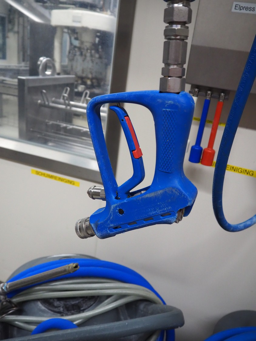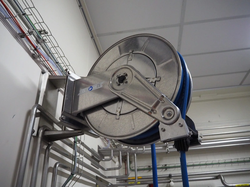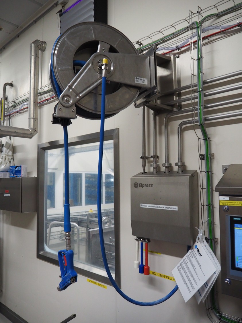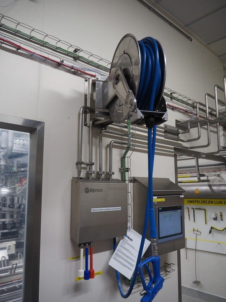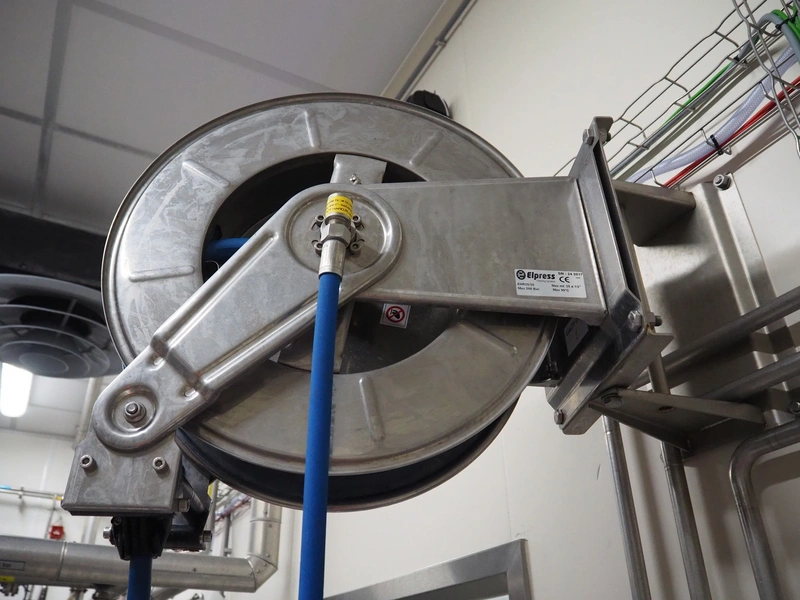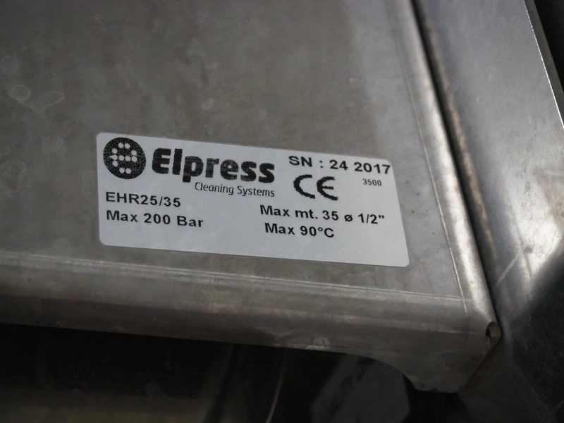 Elpress s/s hose reel with plastic hose, spay pistol and soap mixing station, type: EHR25/35, 83801060, year of construction: 2017, dimensions: 600 mm x 300 mm x 600 mm, 150 mm x 460 mm x 500 mm.