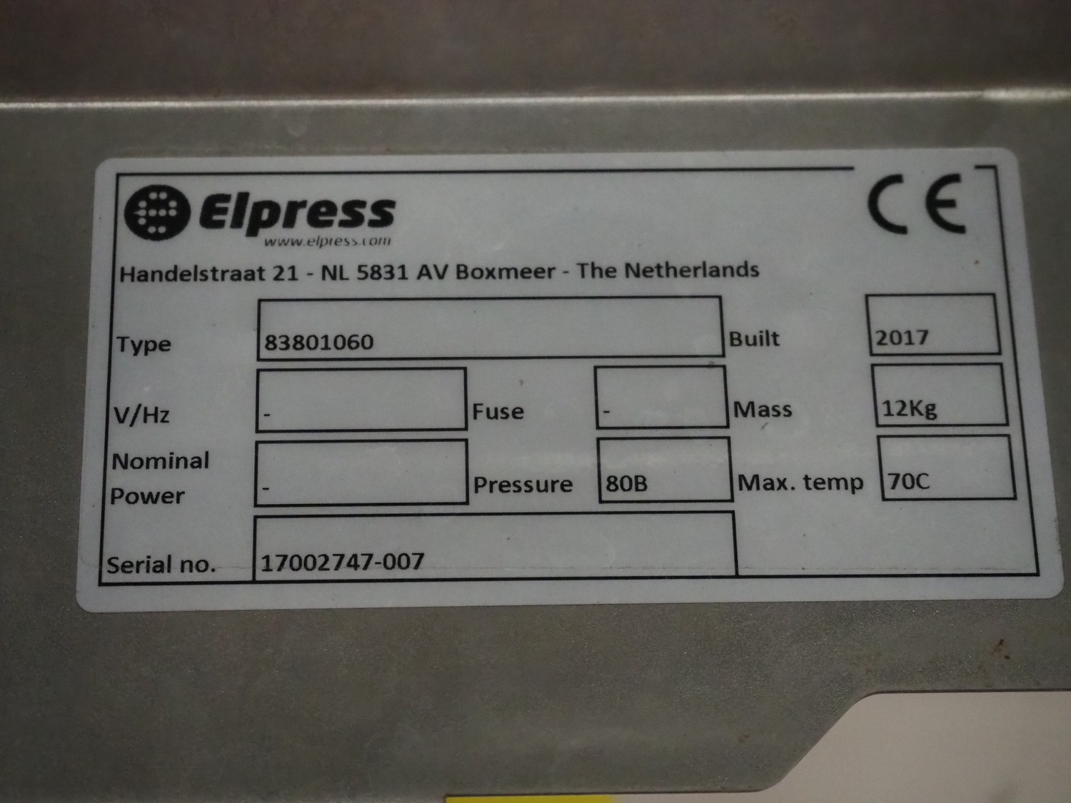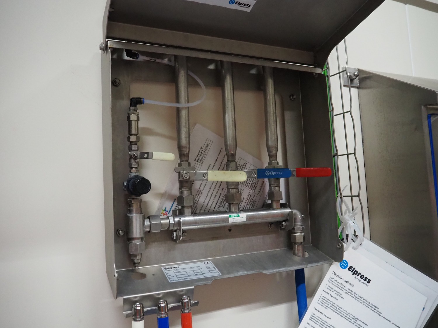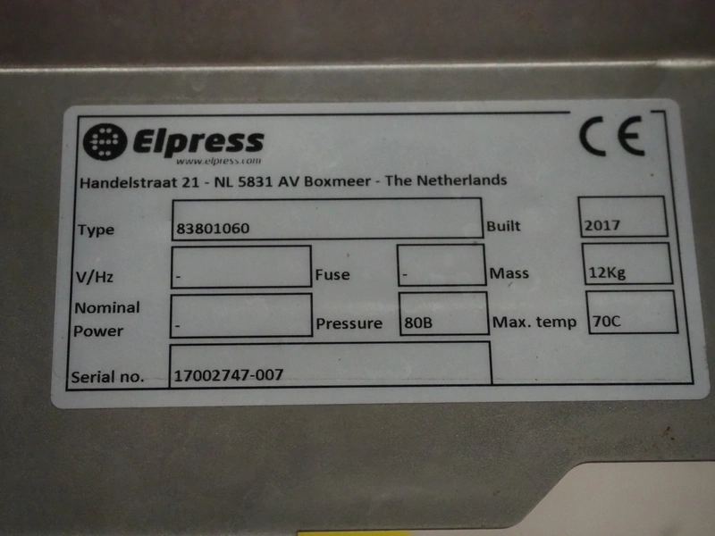 Elpress s/s hose reel with plastic hose, spay pistol and soap mixing station, type: EHR25/35, 83801060, year of construction: 2017, dimensions: 600 mm x 300 mm x 600 mm, 150 mm x 460 mm x 500 mm.