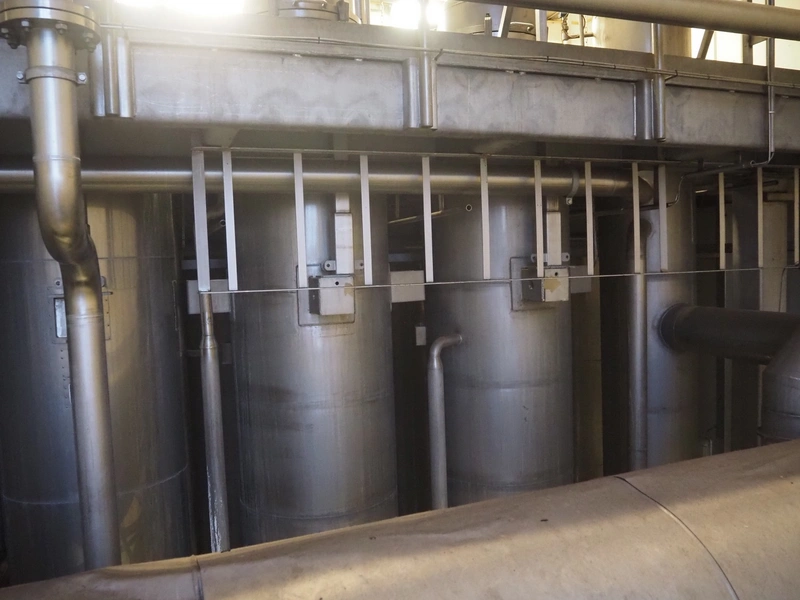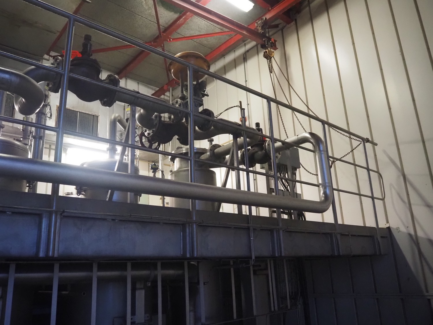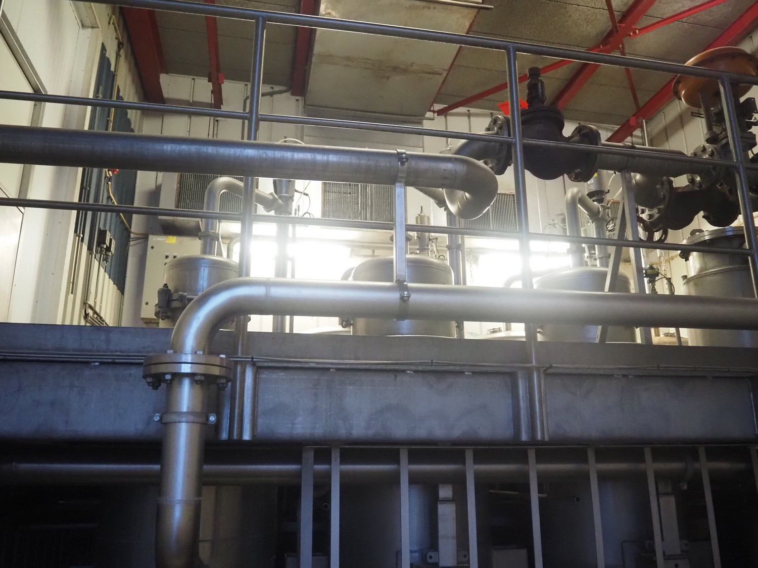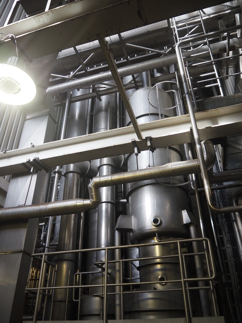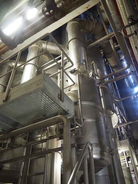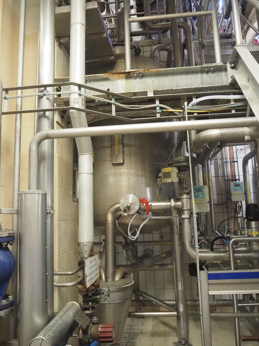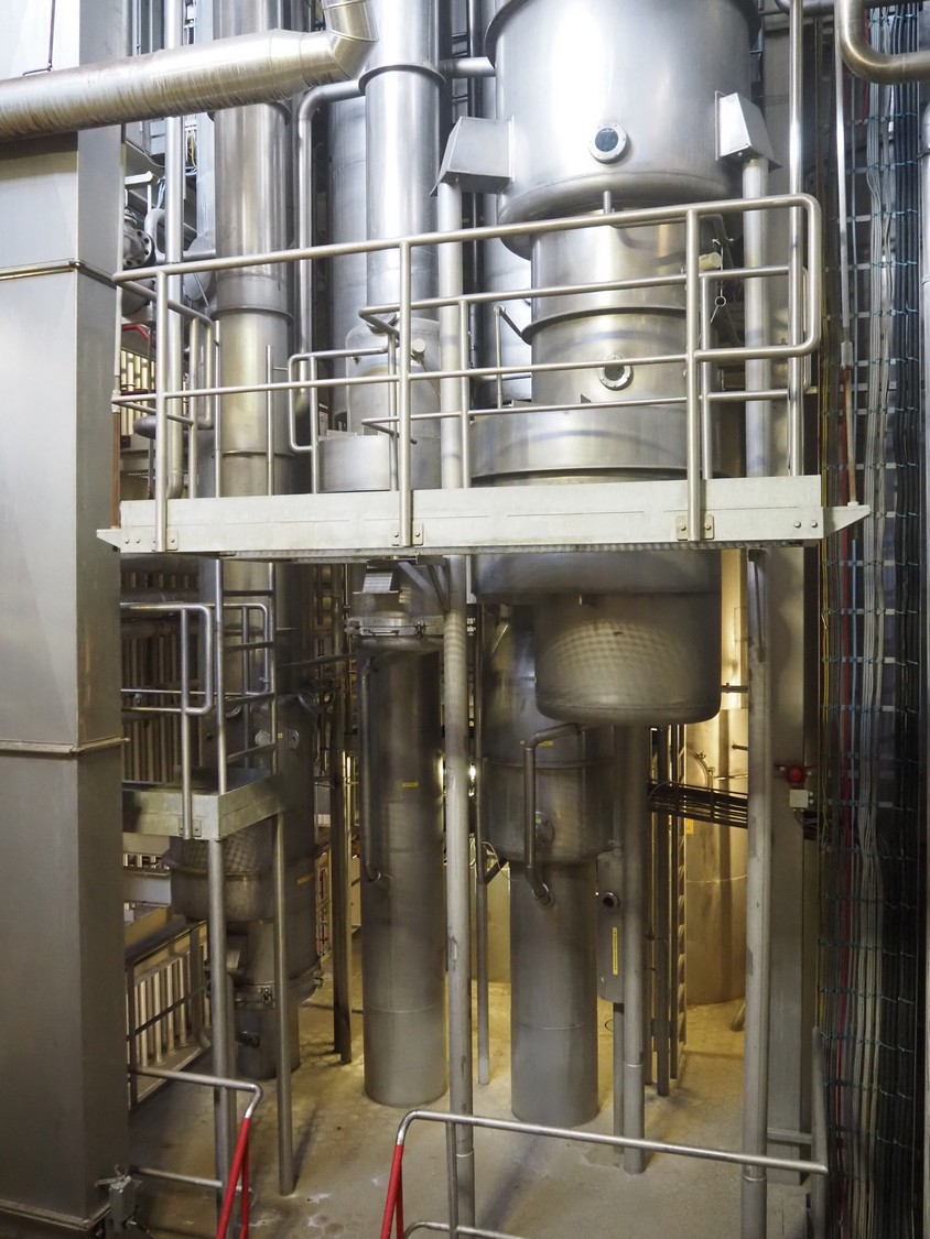 The evaporator is equipped with a thermocompressor from the 3rd to the 1st stage and has a steam consumption ratio of 0.18 (including pasteurizer). It is also fitted with several holding tubes (hot holders), along with two coupling panels to enable different combinations in terms of residence time.
