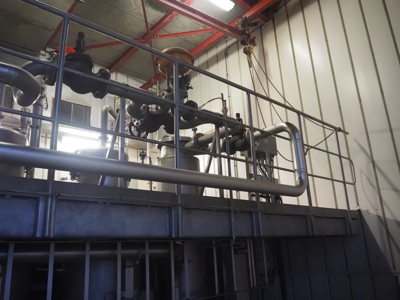 This Scheffer thermal vapor recompression evaporator is a 6-stage TVR evaporator with a closed condenser and a capacity of approximately 25 m³/h (24–26), with a water evaporation rate of approximately 17.5 m³/h.