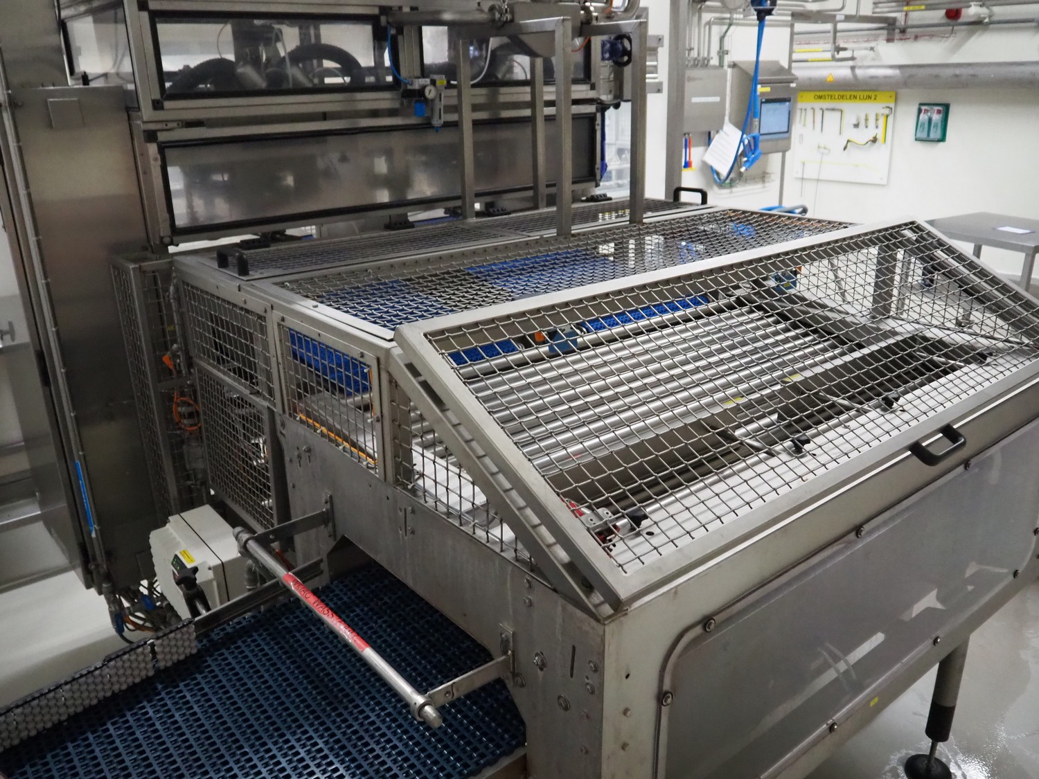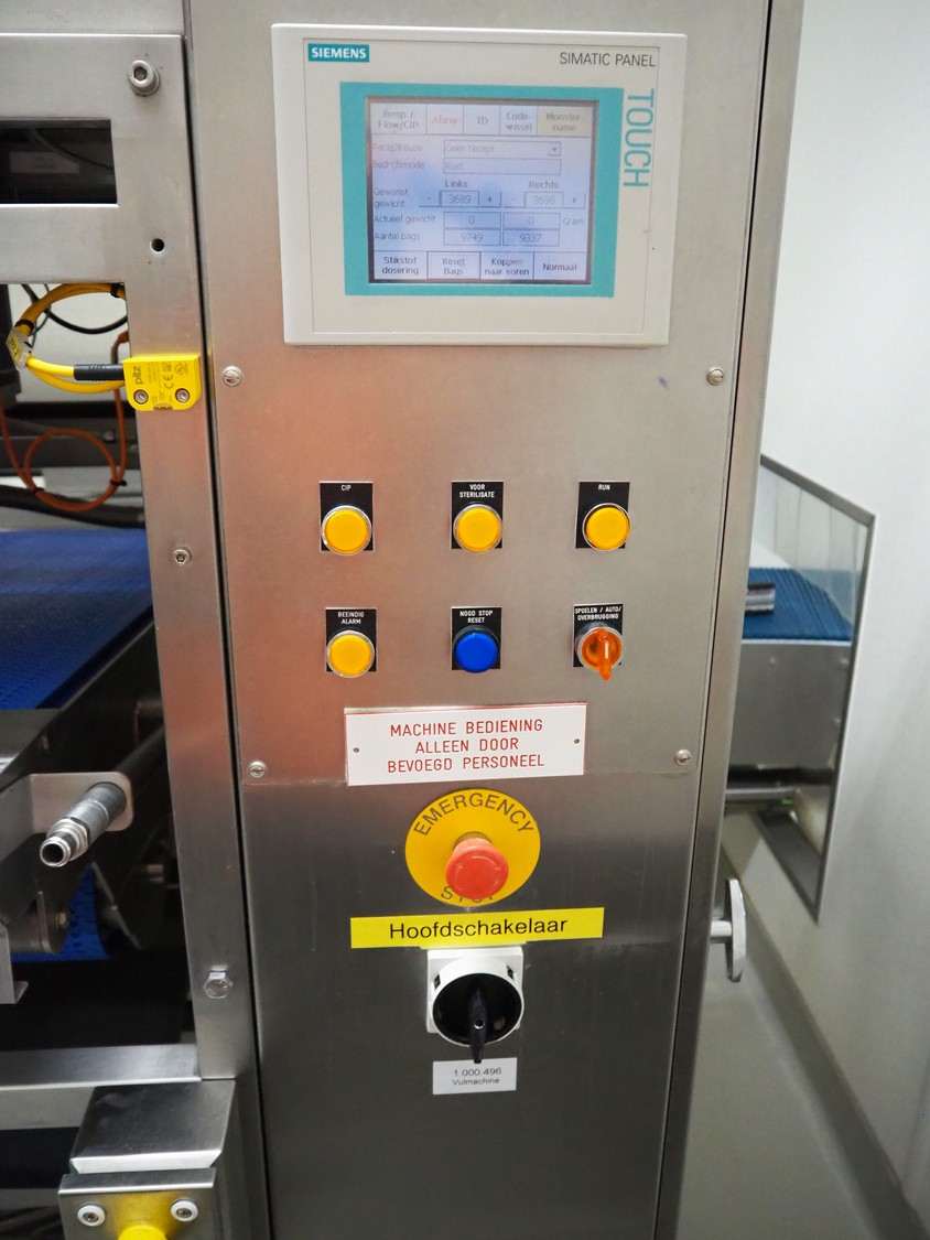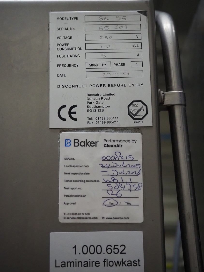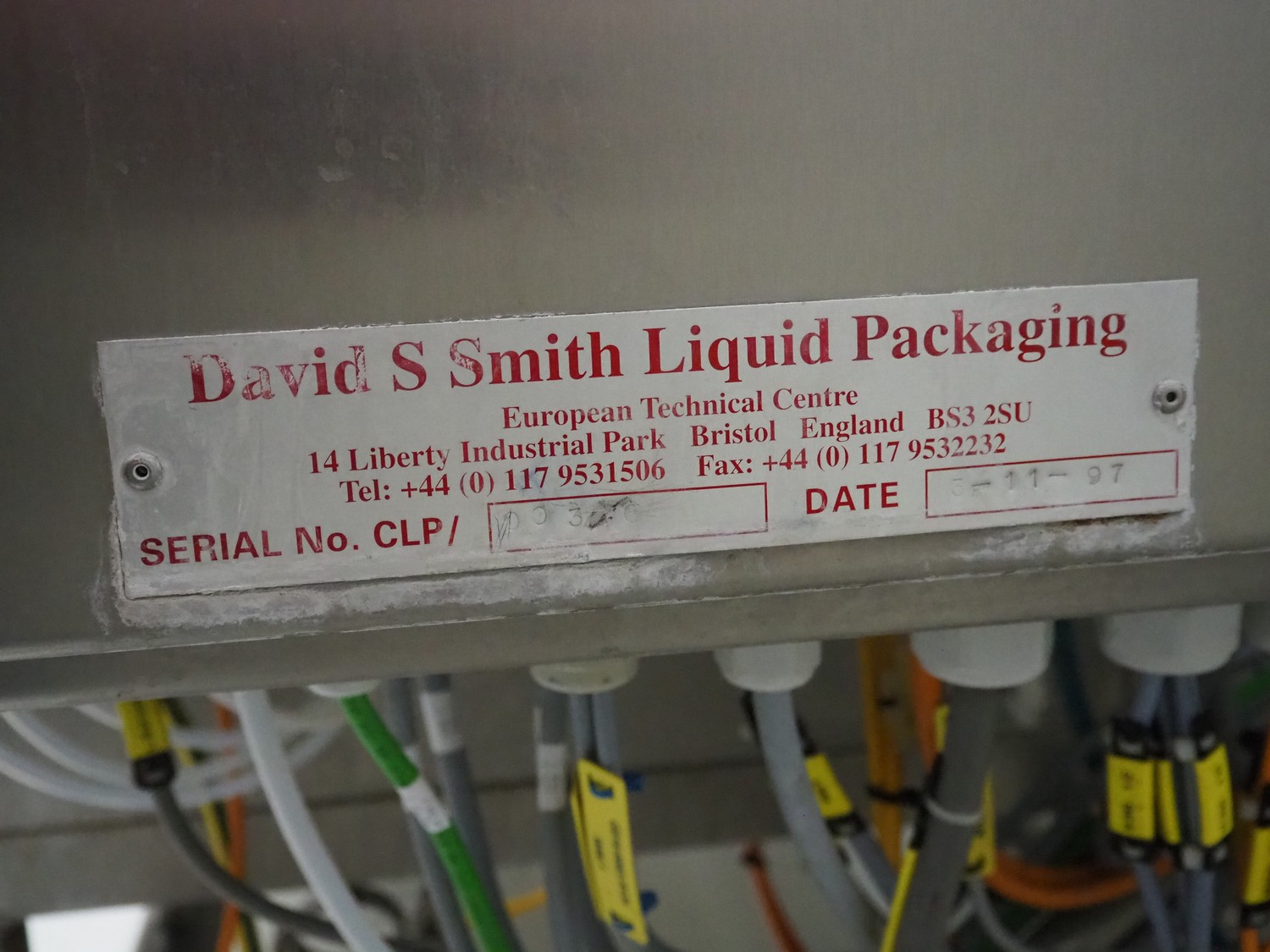 David S Smith Liquid Packaging double bag filling machine, year of construction: 3-11-1997, with Bassaire Limited laminaire flow cabinet, model: SPL S5, serial number: S5 303, year of construction: 29-9-1997, 230 V, 1 Ph, 50/60 Hz, plastic mesh belt, belt width: (2x) 500 mm, s/s rollers, roller width: 1300 mm, td: 2400 mm x 2200 mm x 2500 mm.