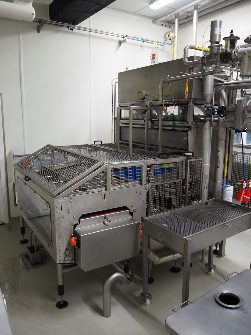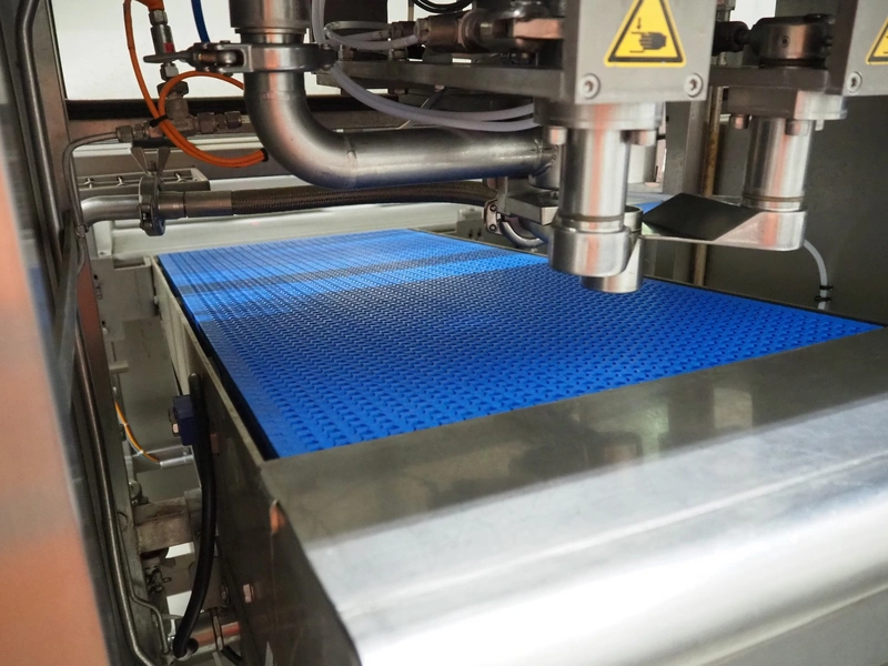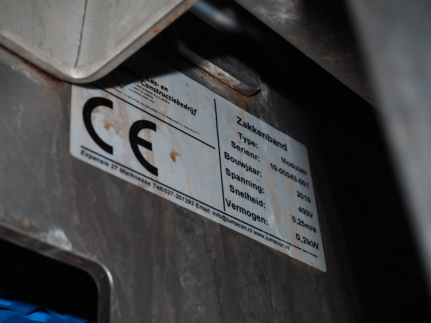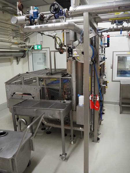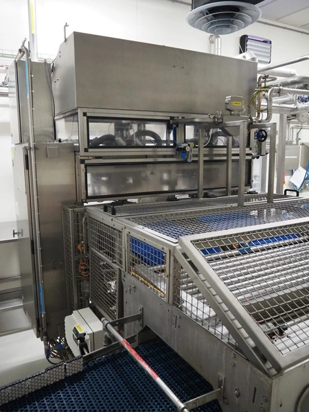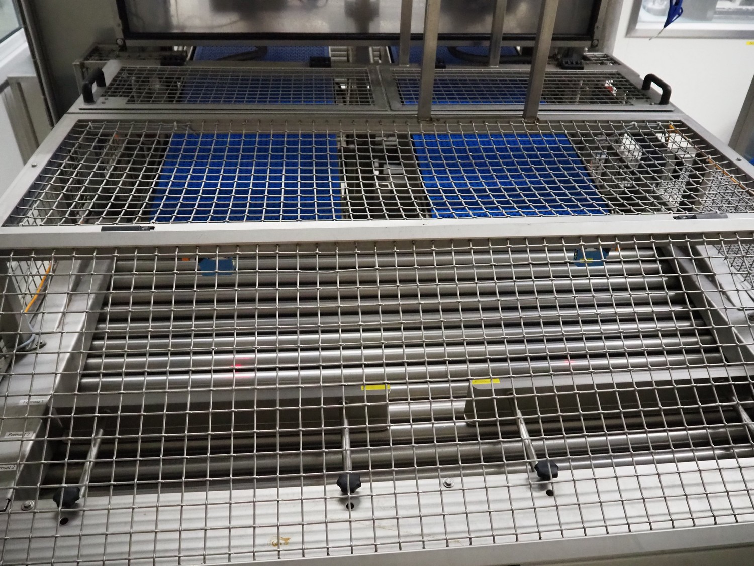David S Smith Liquid Packaging double bag filling machine, year of construction: 3-11-1997, with Bassaire Limited laminaire flow cabinet, model: SPL S5, serial number: S5 303, year of construction: 29-9-1997, 230 V, 1 Ph, 50/60 Hz, plastic mesh belt, belt width: (2x) 500 mm, s/s rollers, roller width: 1300 mm, td: 2400 mm x 2200 mm x 2500 mm.